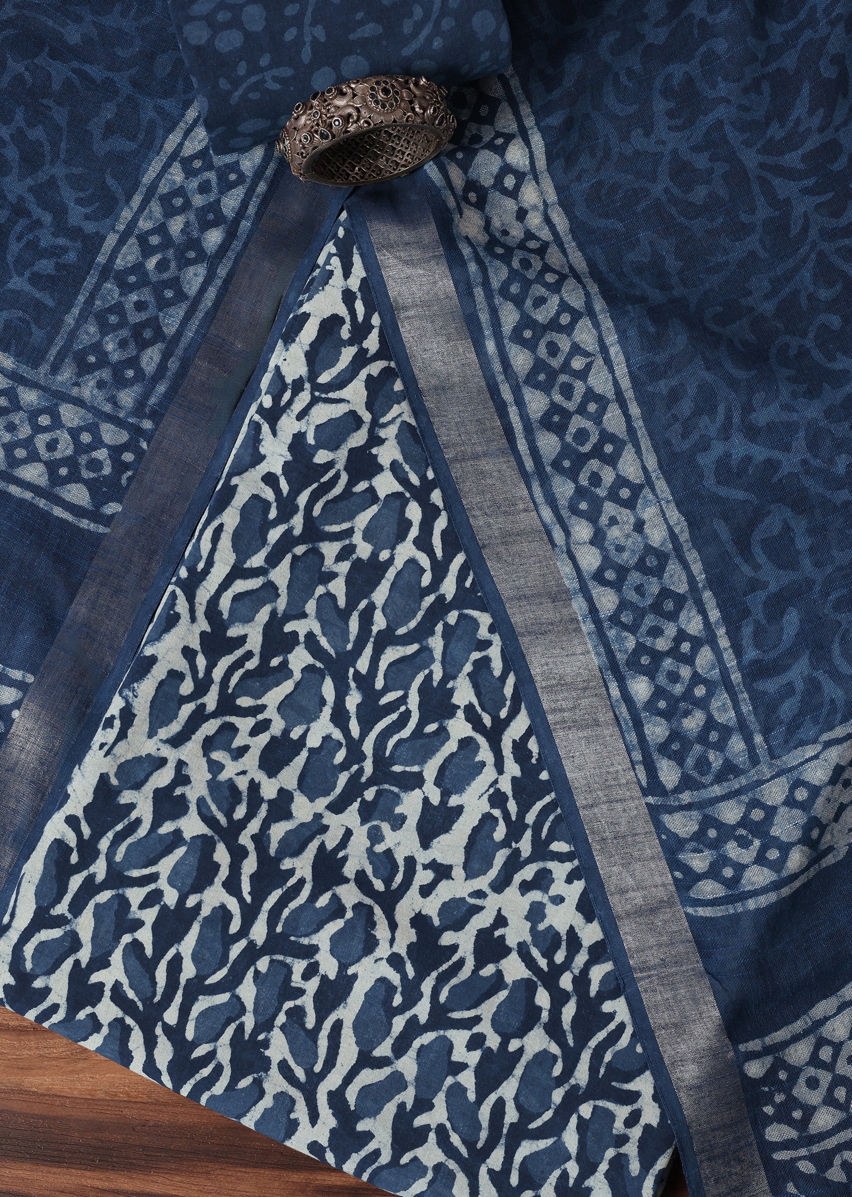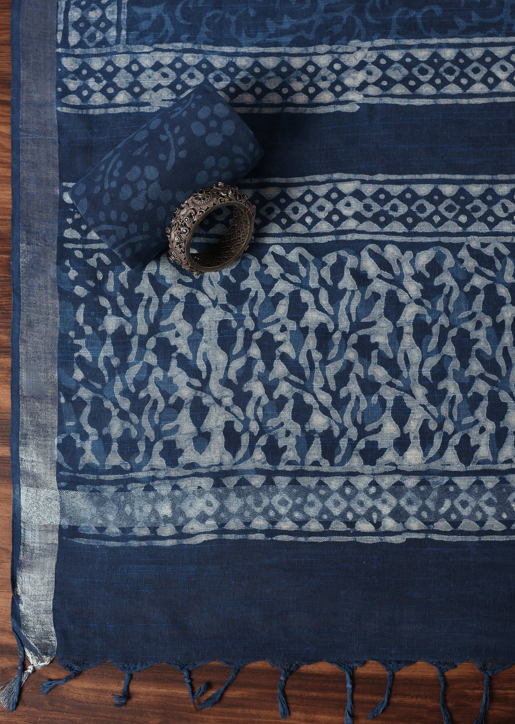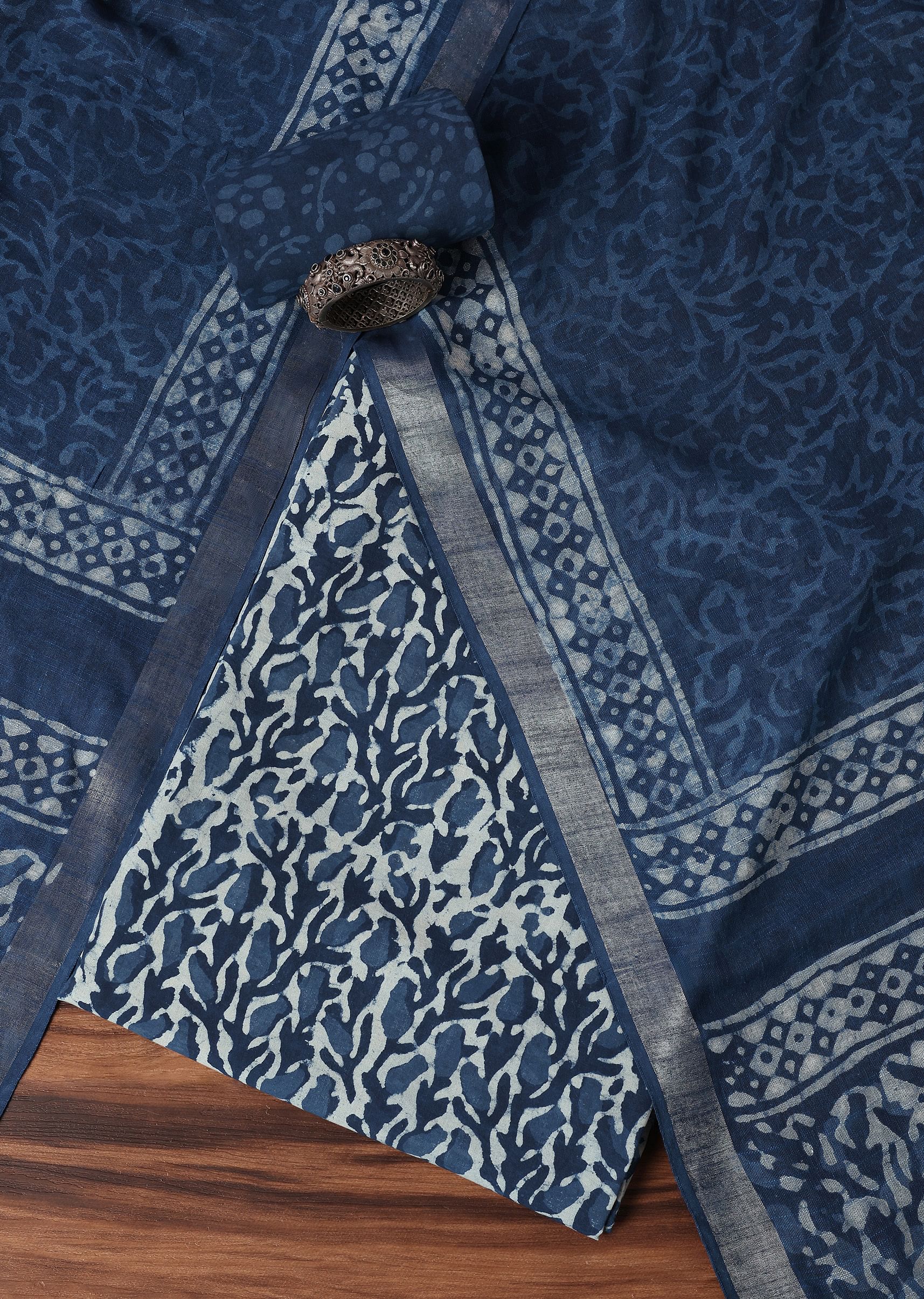 Indigo Blue Cotton Dress Material In Batik Hand Block Print