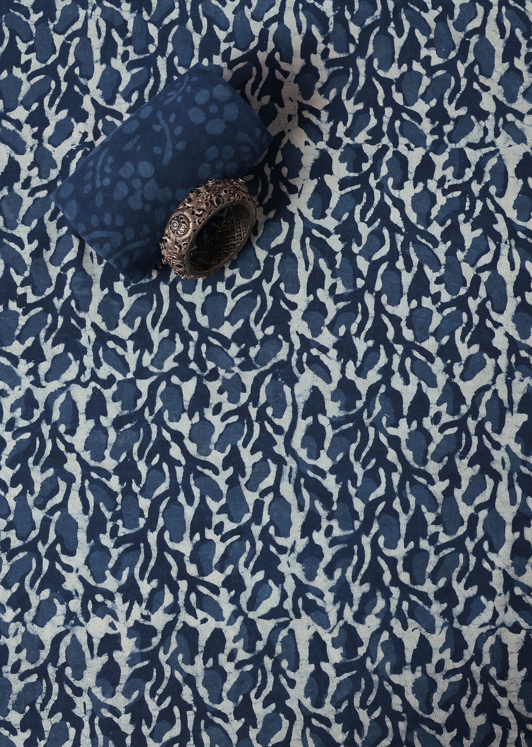 - This enchanting Indigo Blue Batik dress material, hand block printed with abstract patterns, and festive twirls, and vibrant celebrations.