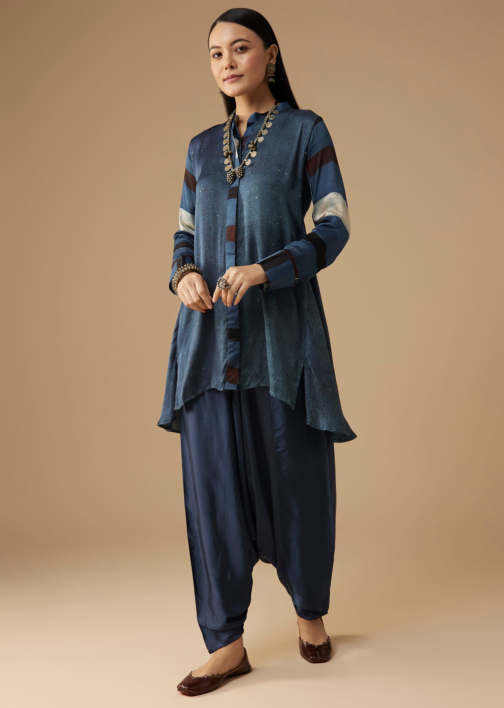 Showcase effortless ethnic style with this indigo co-ord set, featuring a pure hand-dyed Ajrakh work jacket paired with a matching shirt and dhoti pants. The rich Ajrakh patterns bring authentic... More Product Details