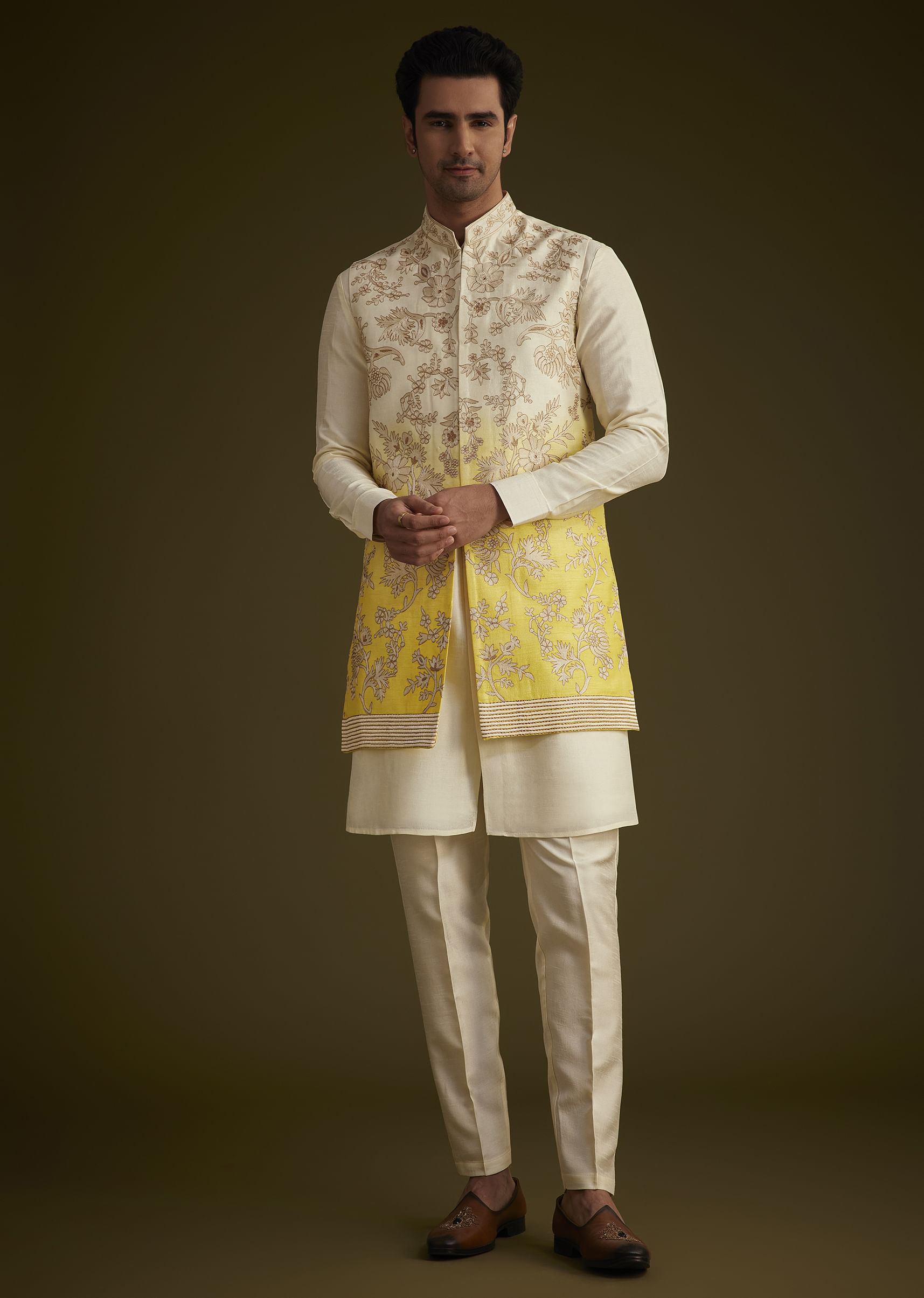 Elevate Your Style With This Ivory And Yellow Ombre Silk Jacket Set, Showcasing Exquisite Zari Embroidery Across The Jacket. The Ombre Shading Transitions Gracefully, Adding Depth And Dimension To The Ensemble. Perfect For Festive Celebrations Or Traditional Events, This Jacket Set Combines Modern Aesthetics With Cultural Elegance. A Versatile Piece That Complements Both Day And Evening Occasions.Awarded as the Most Trusted Brand, we're delivering styles you love, just as promised.