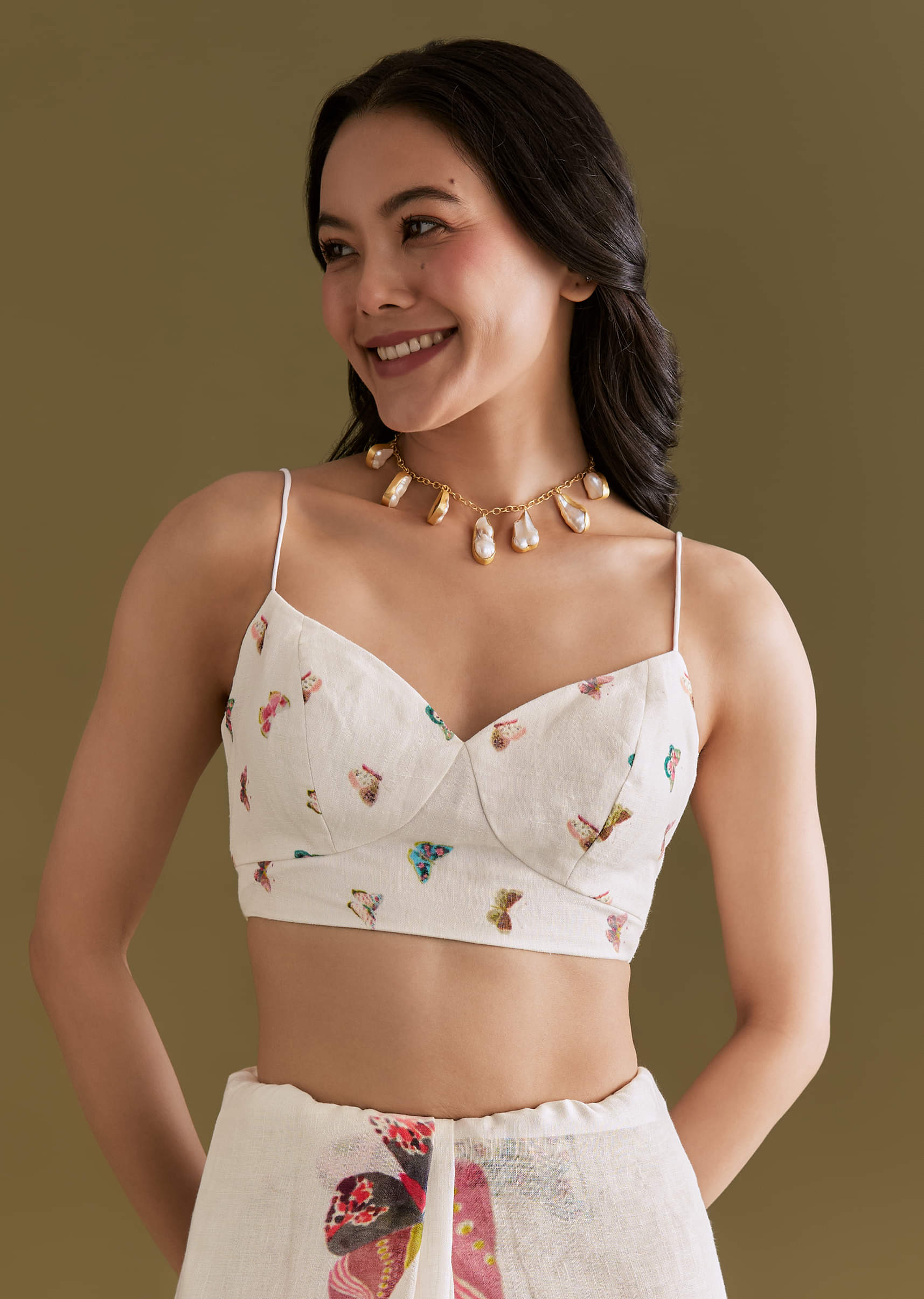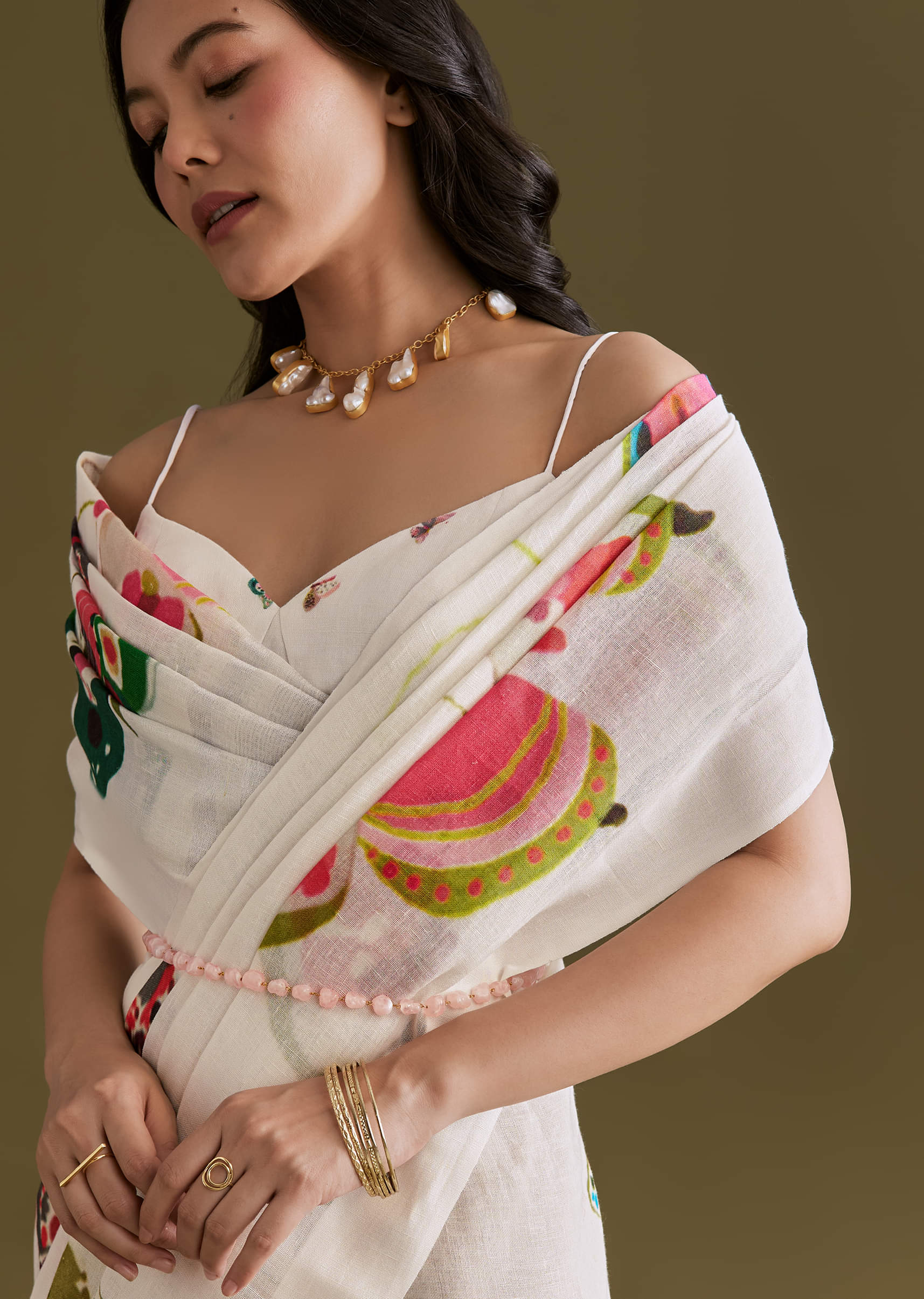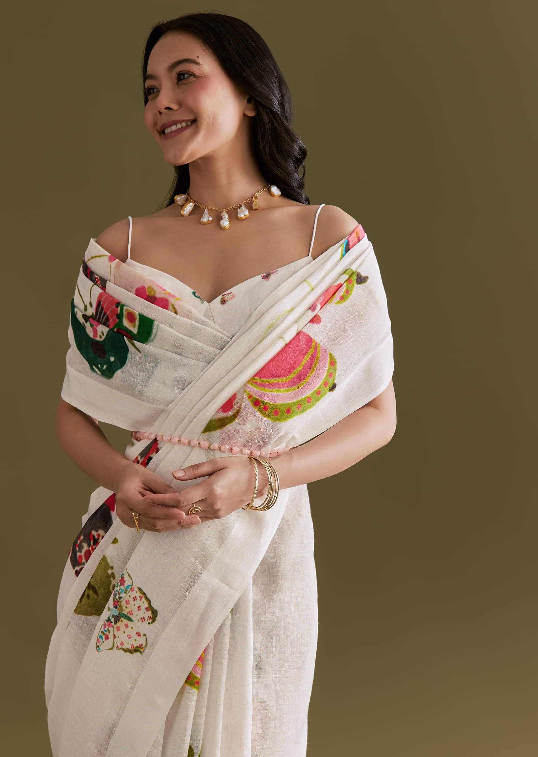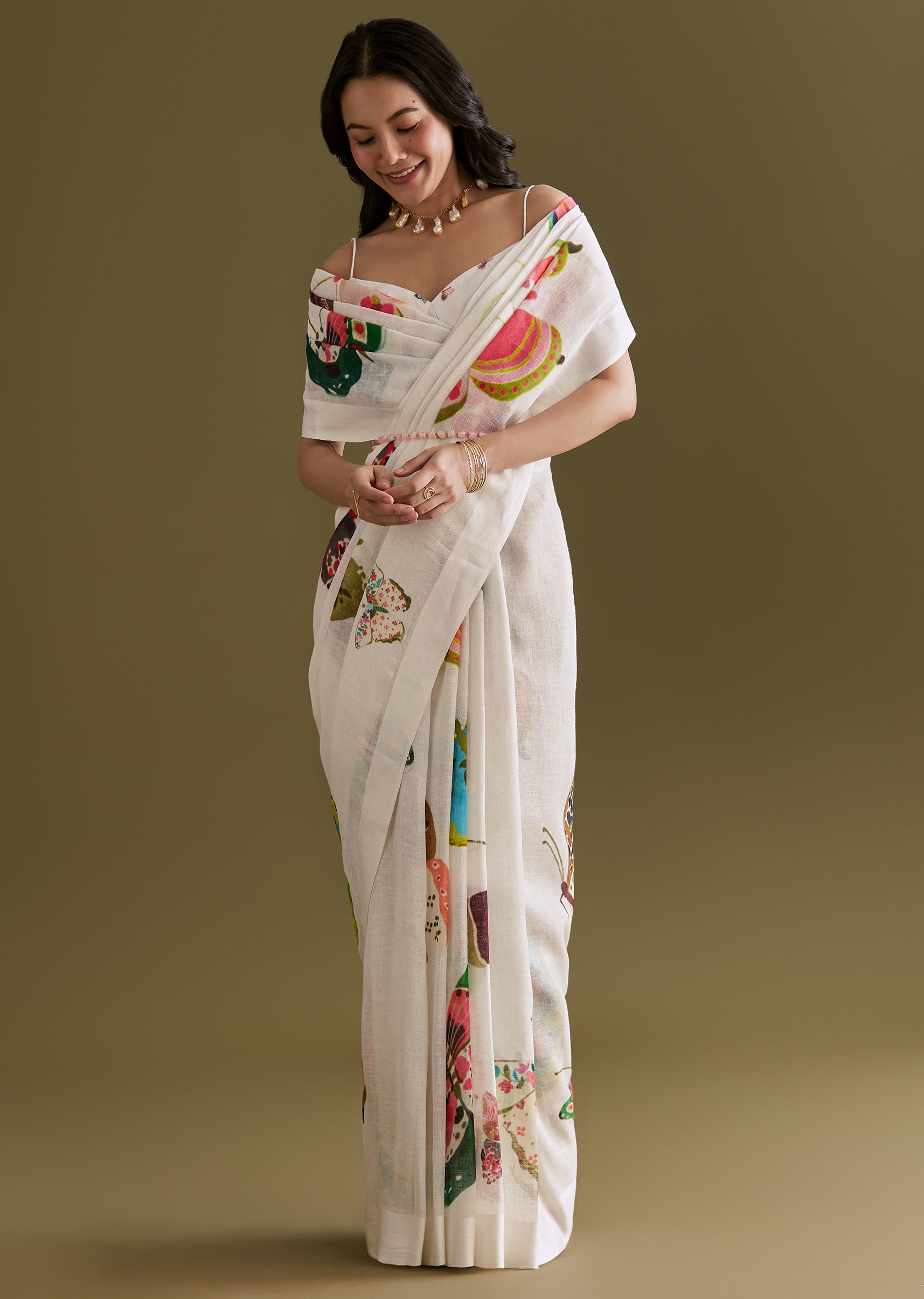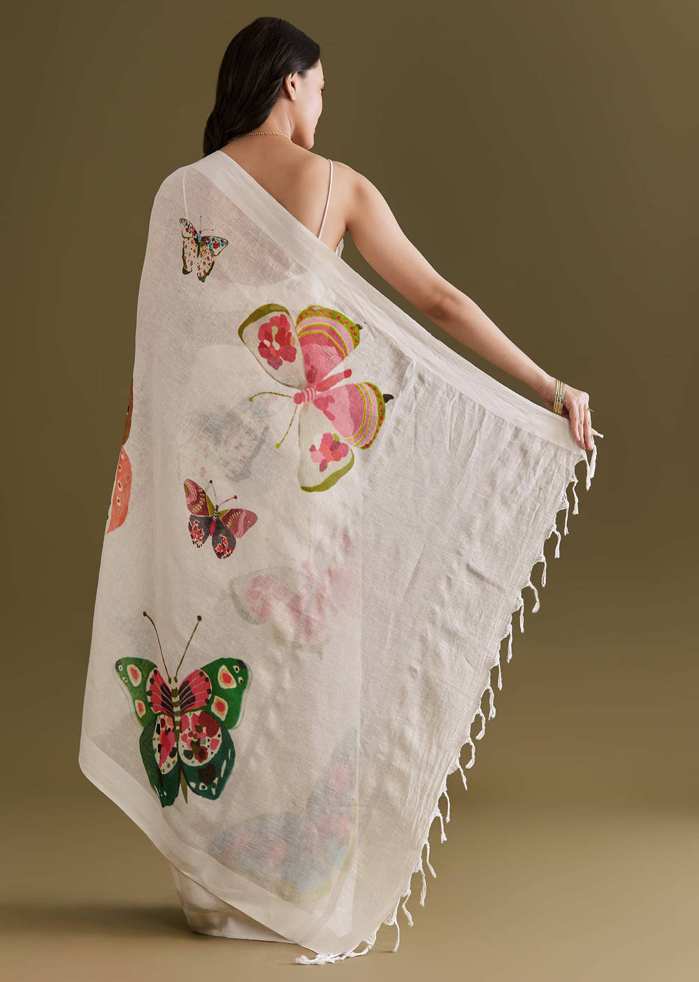 Ivory Cotton Linen Saree With Multicolour Butterfly Prints