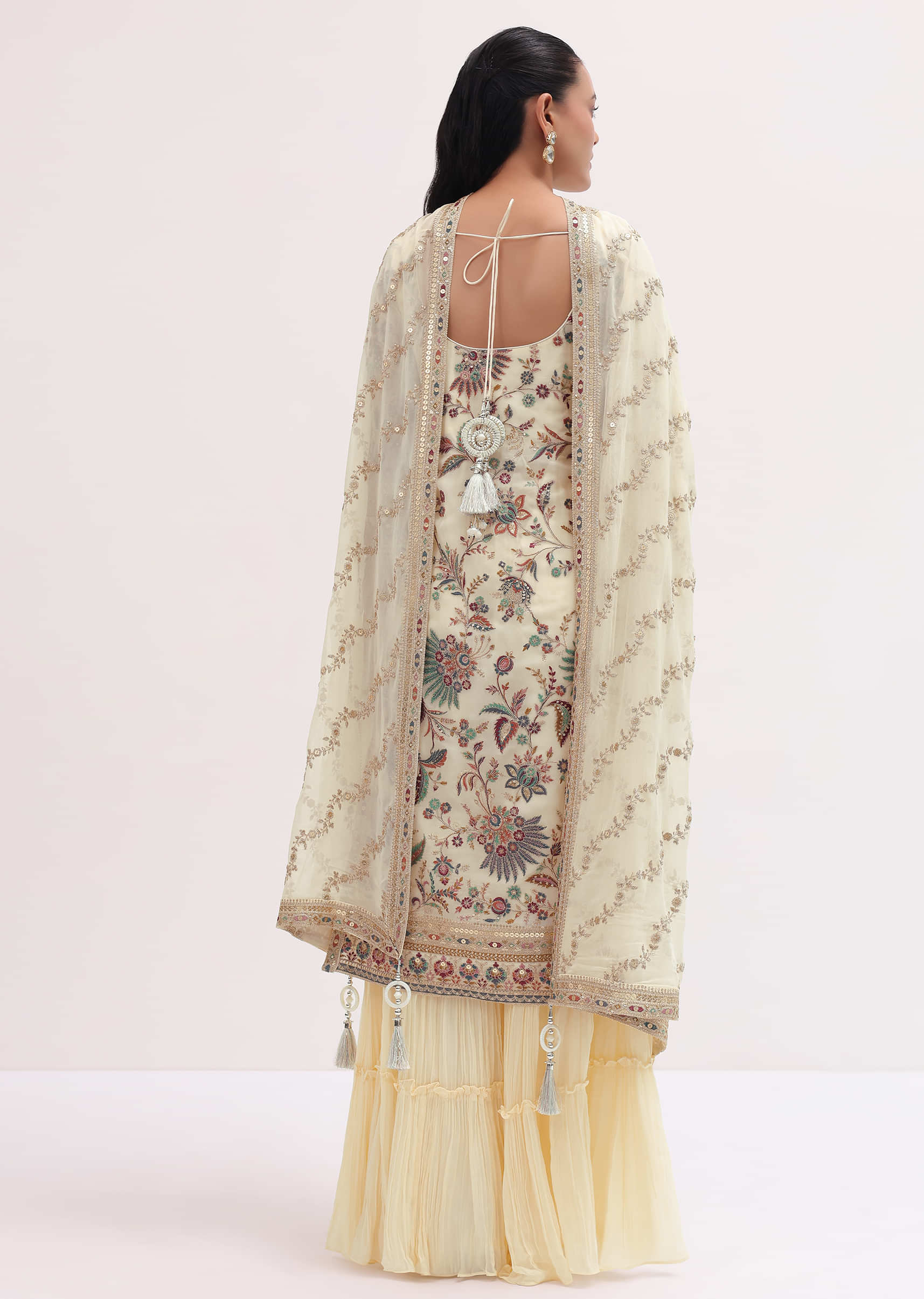 • The kurta and dupatta are jeweled with threadwork, sequins, zari, beads, mirrors, stones, and cutdana embroidery.