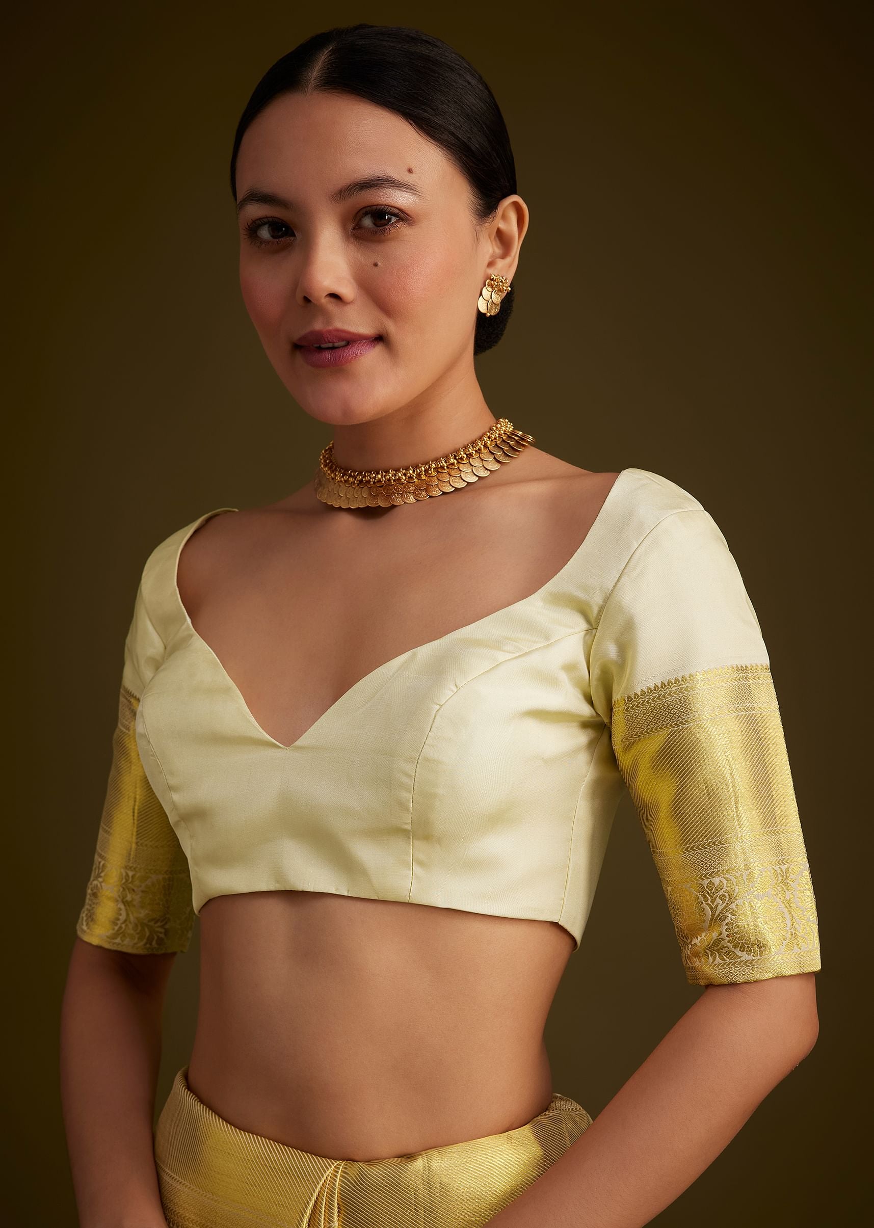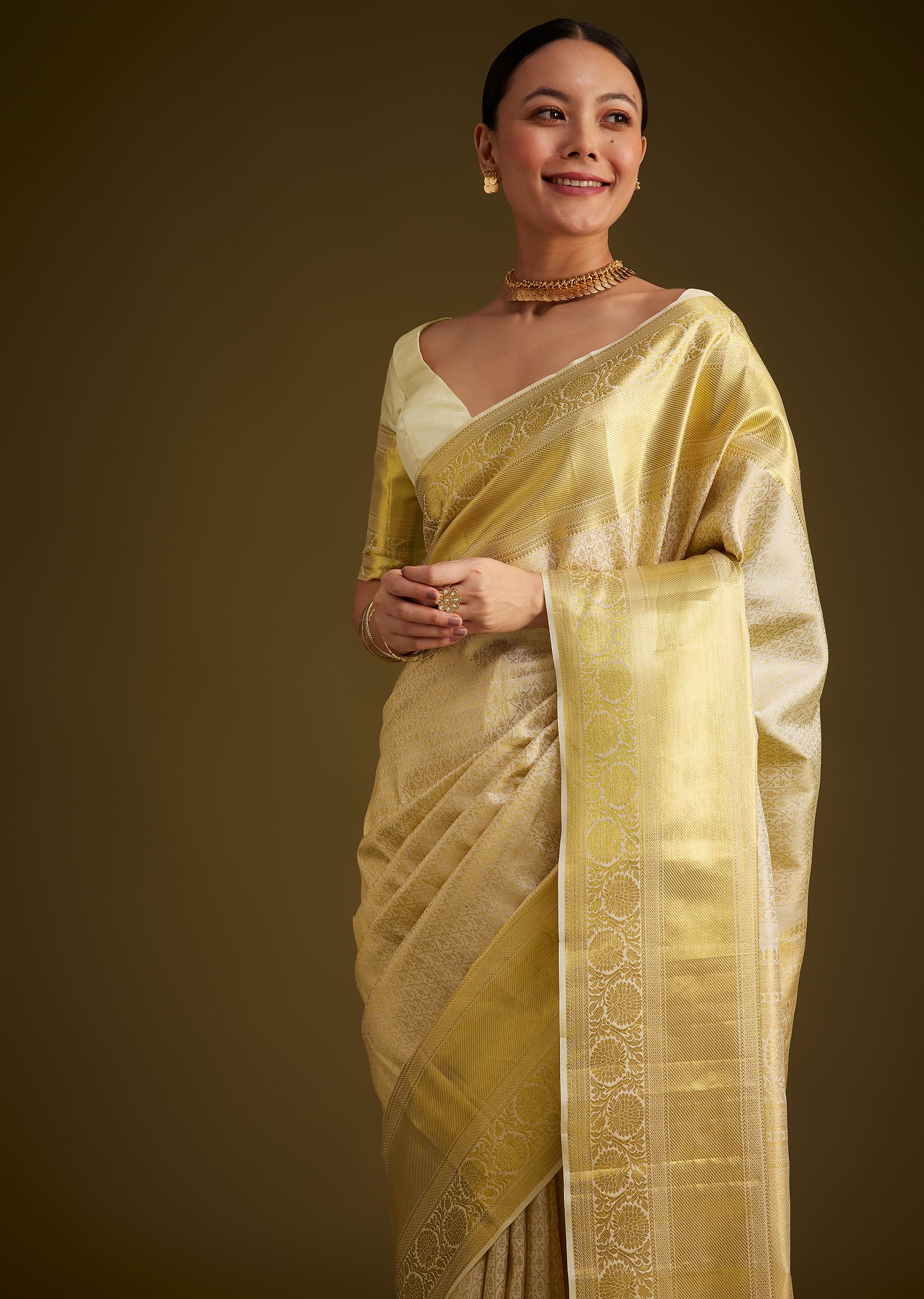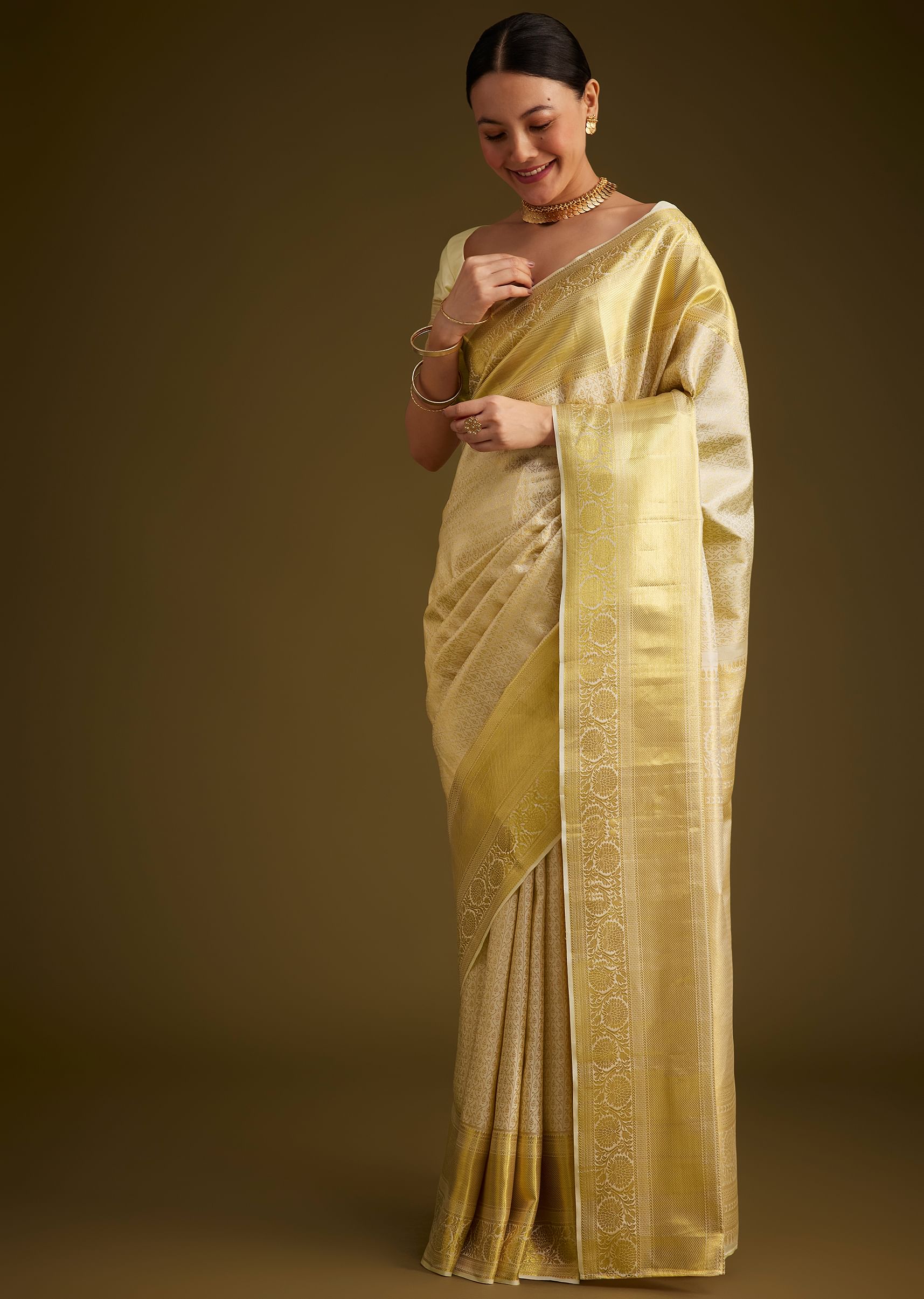 Drape Yourself In The Understated Elegance Of This Ivory Kanjivaram Silk Saree. The Luxurious Silk Fabric Is Adorned With A Stunning Golden Zariwoven Border Adding A Touch Of Regal Charm.... More Product Details