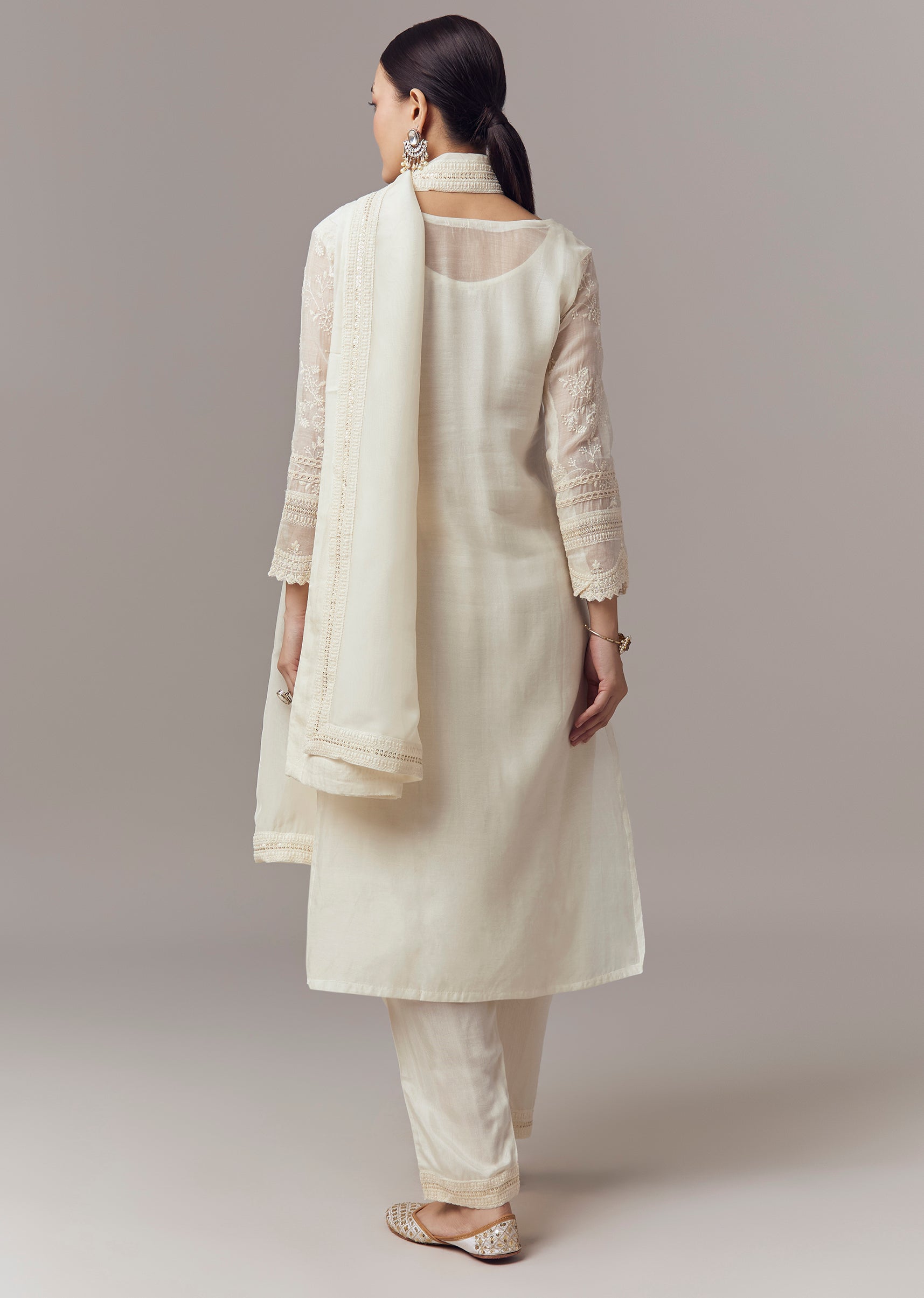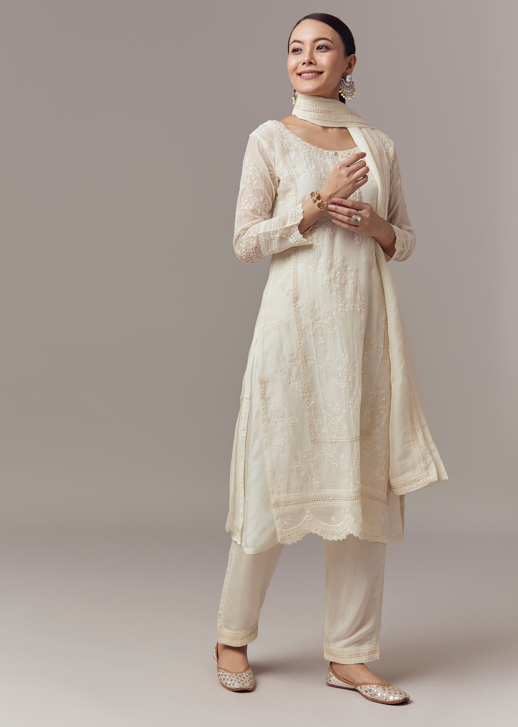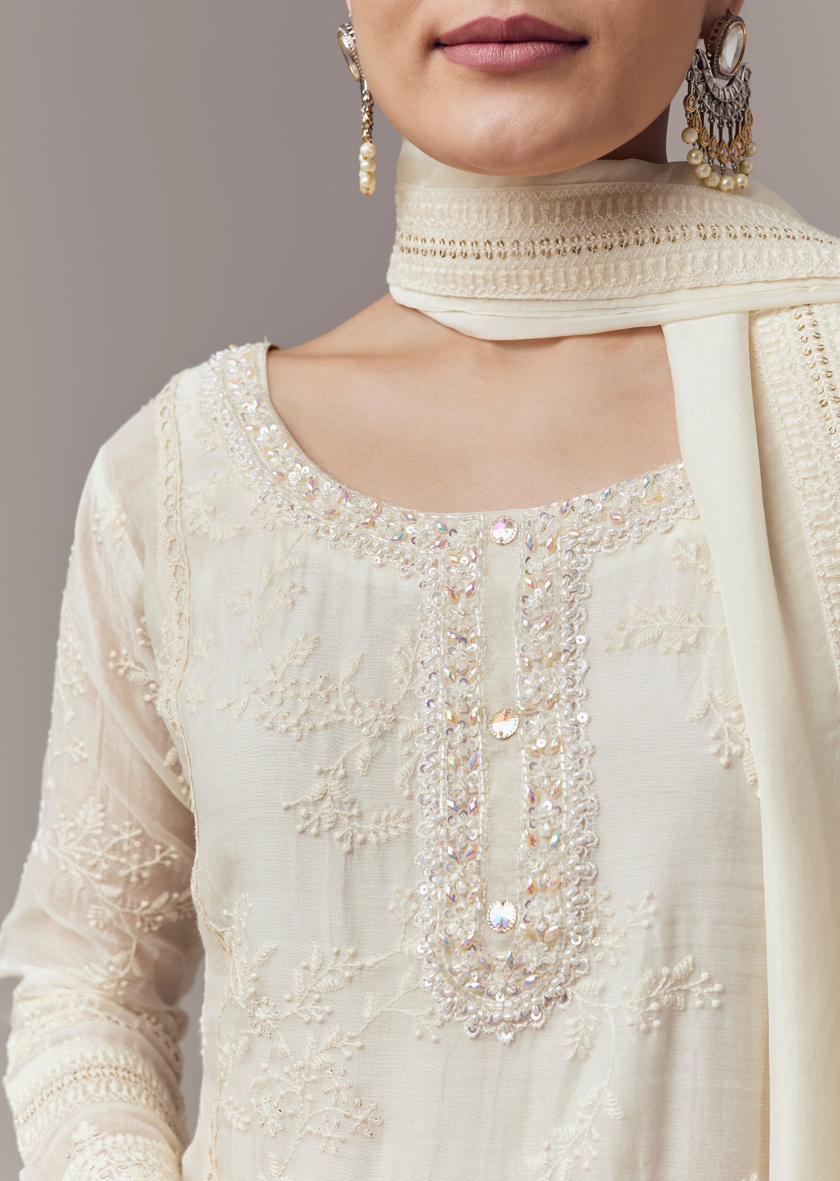 Ivory Kurta Set With Thread Sequins And Moti Work And Dupatta