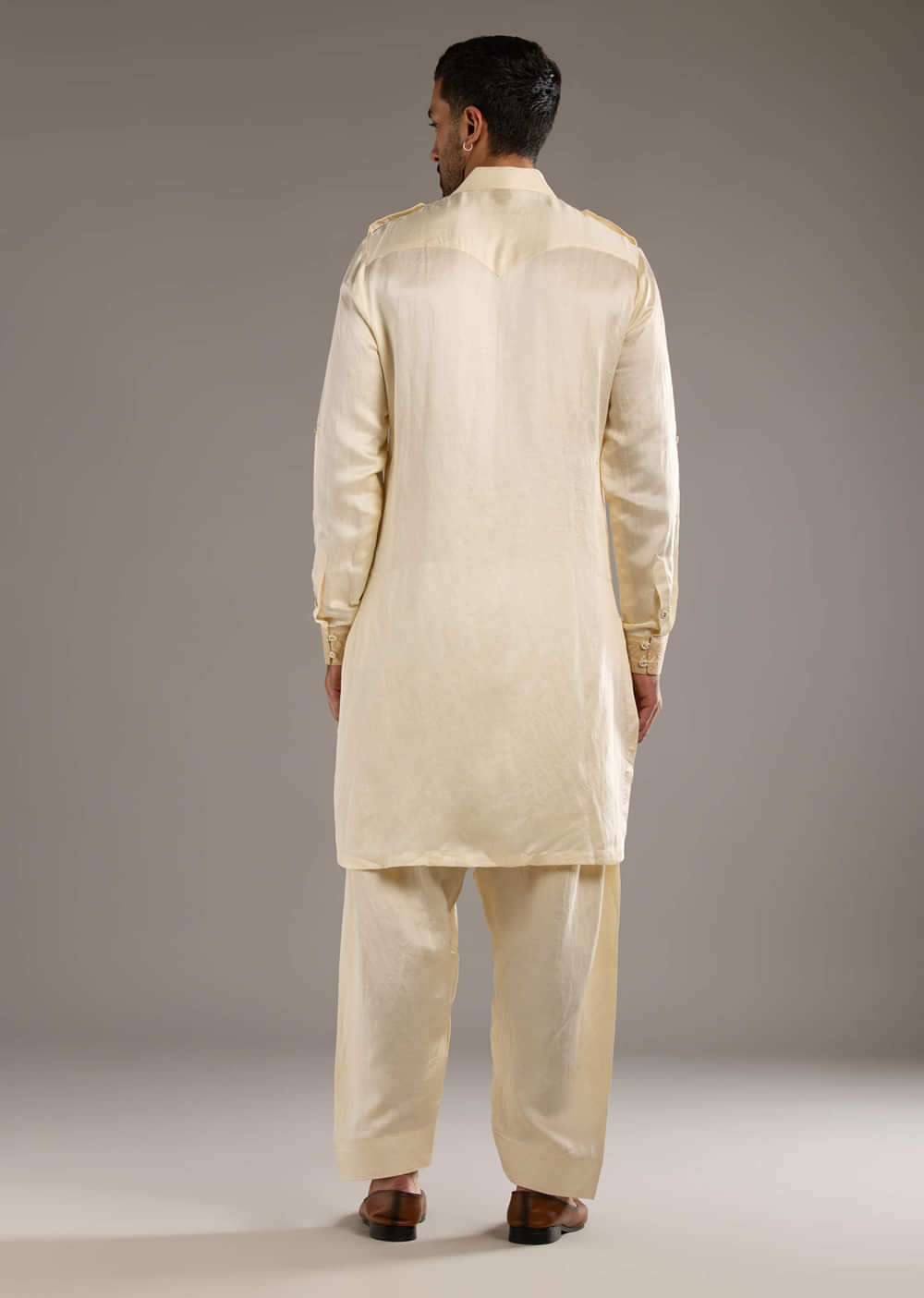 Ivory Linen Satin Kurta Set For Men With Dori Work