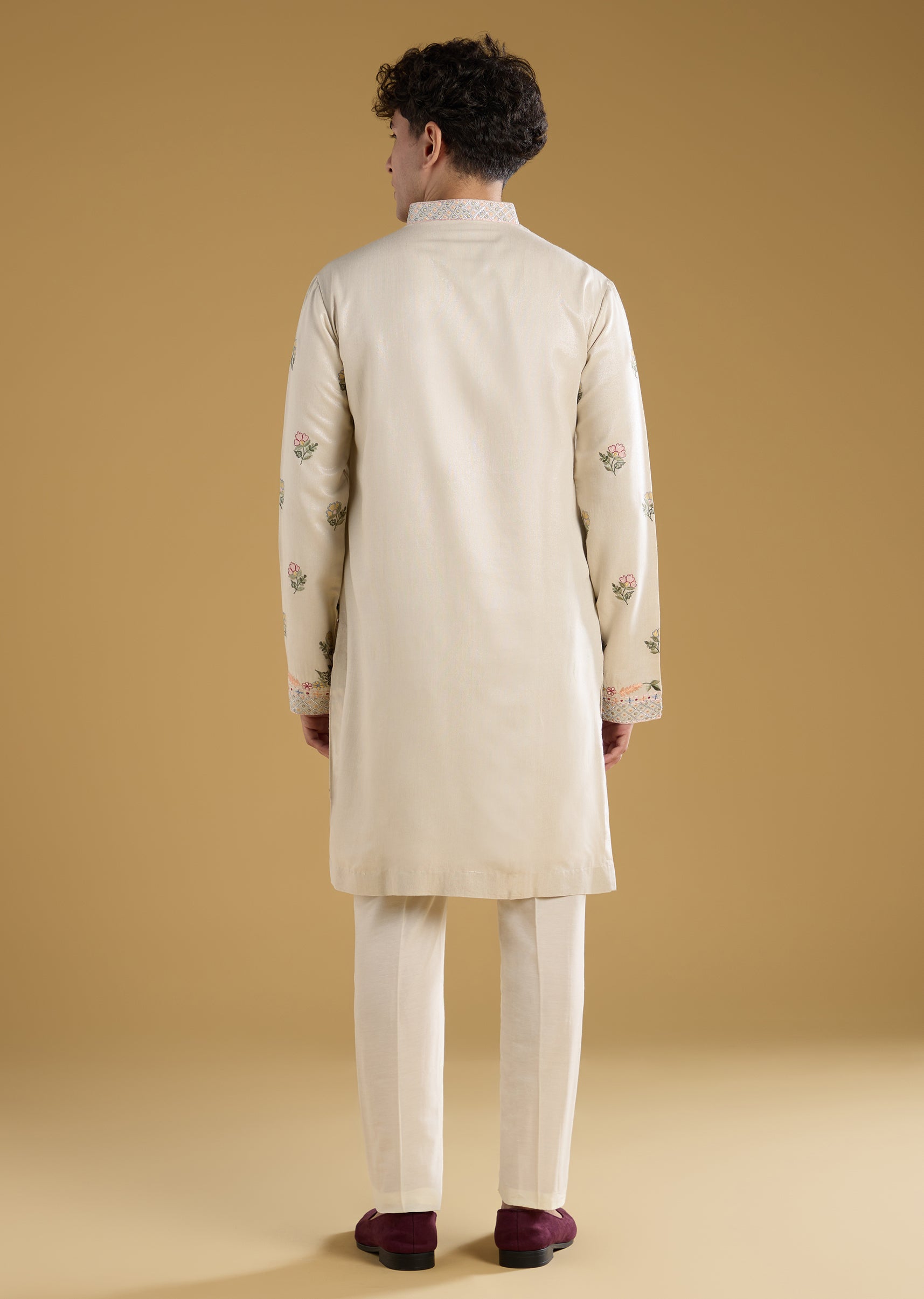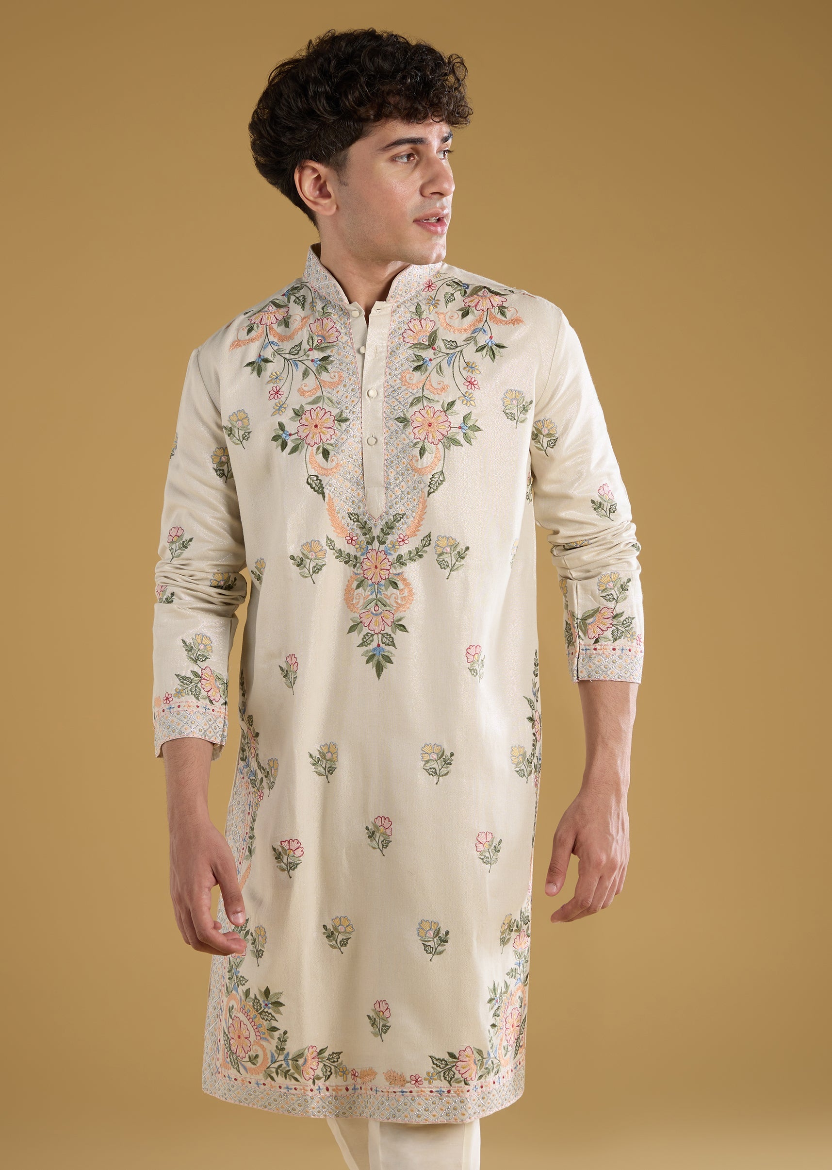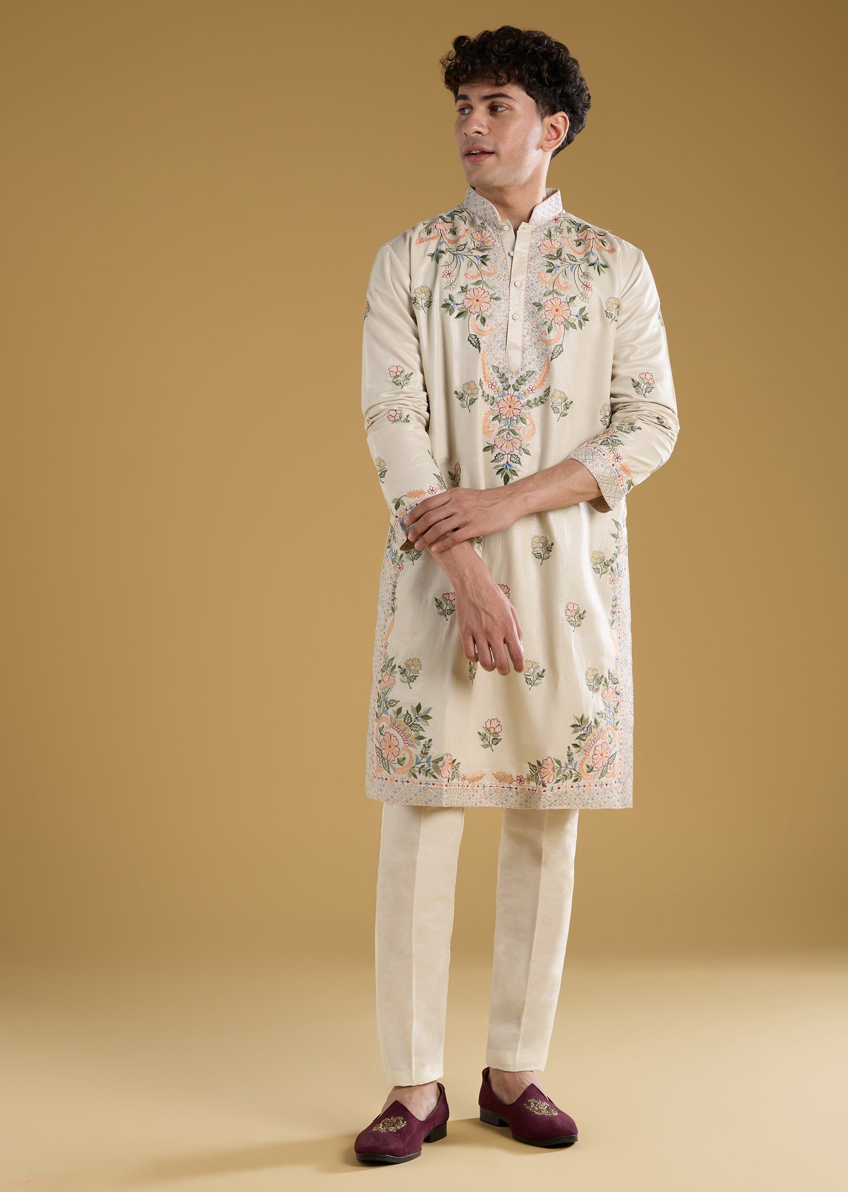 This ivory men’s kurta set is crafted in premium silk fabric featuring delicate resham thread detailing for a subtle and elegant festive look. Perfect for groomsmen at haldi or mehendi... More Product Details