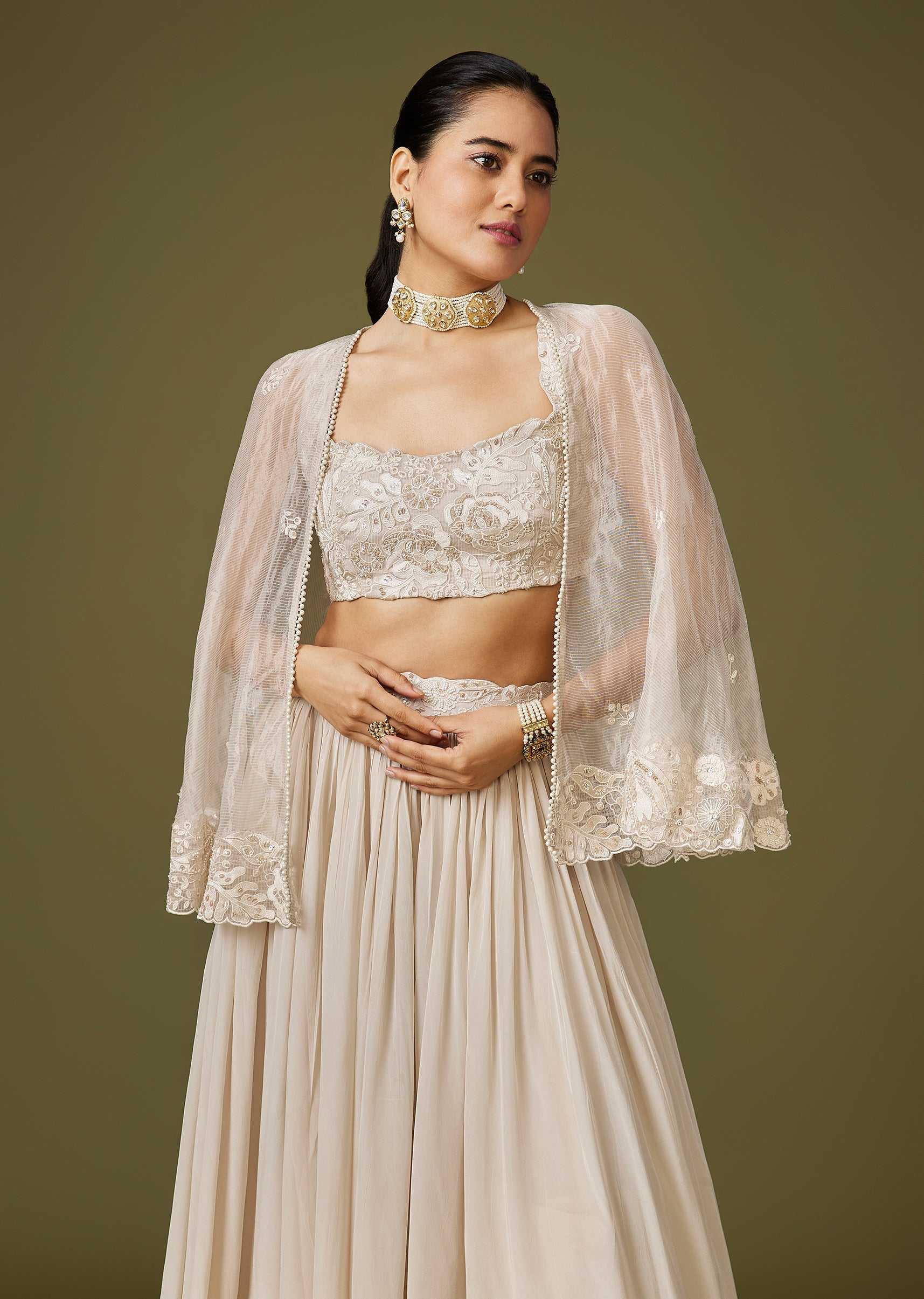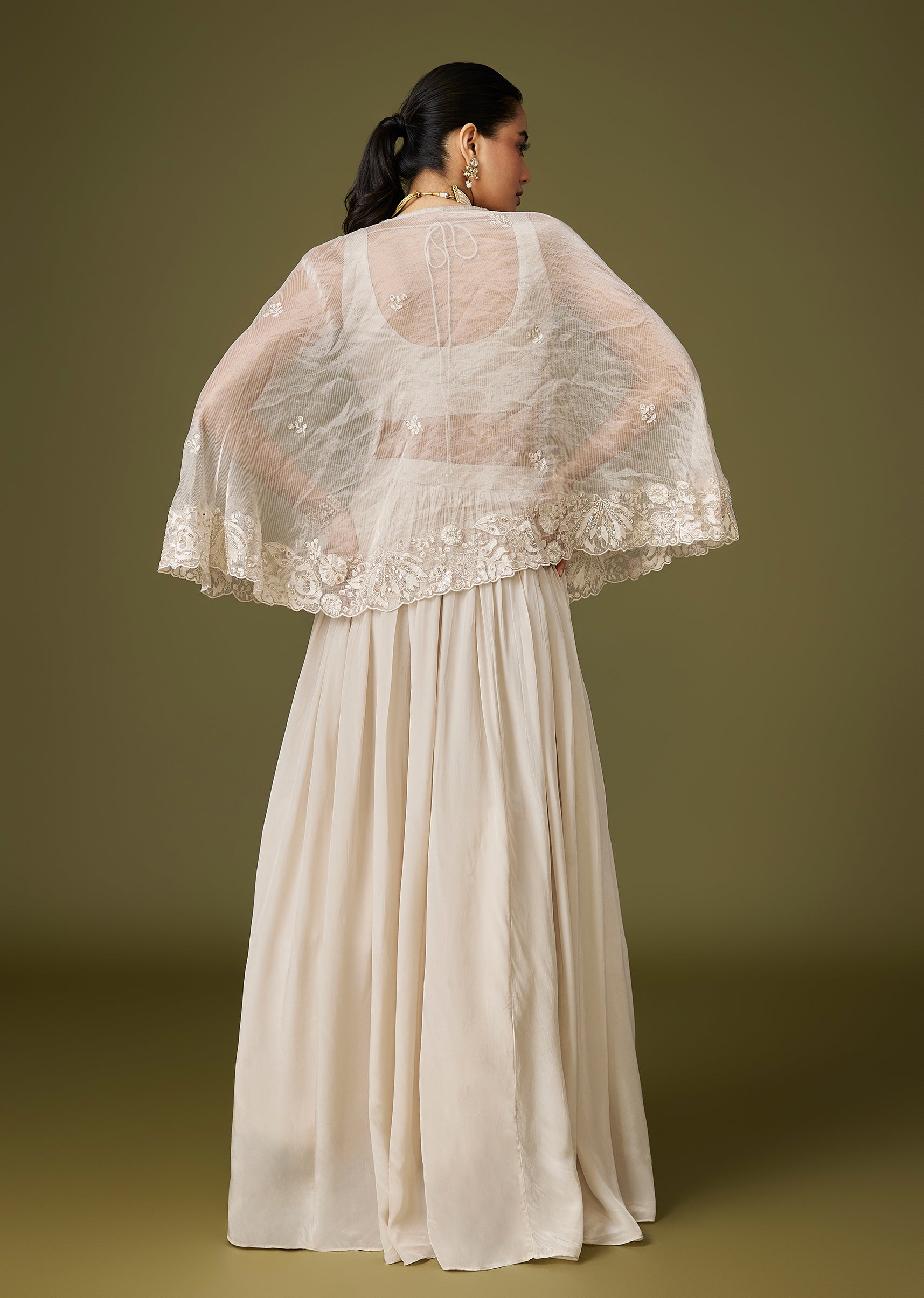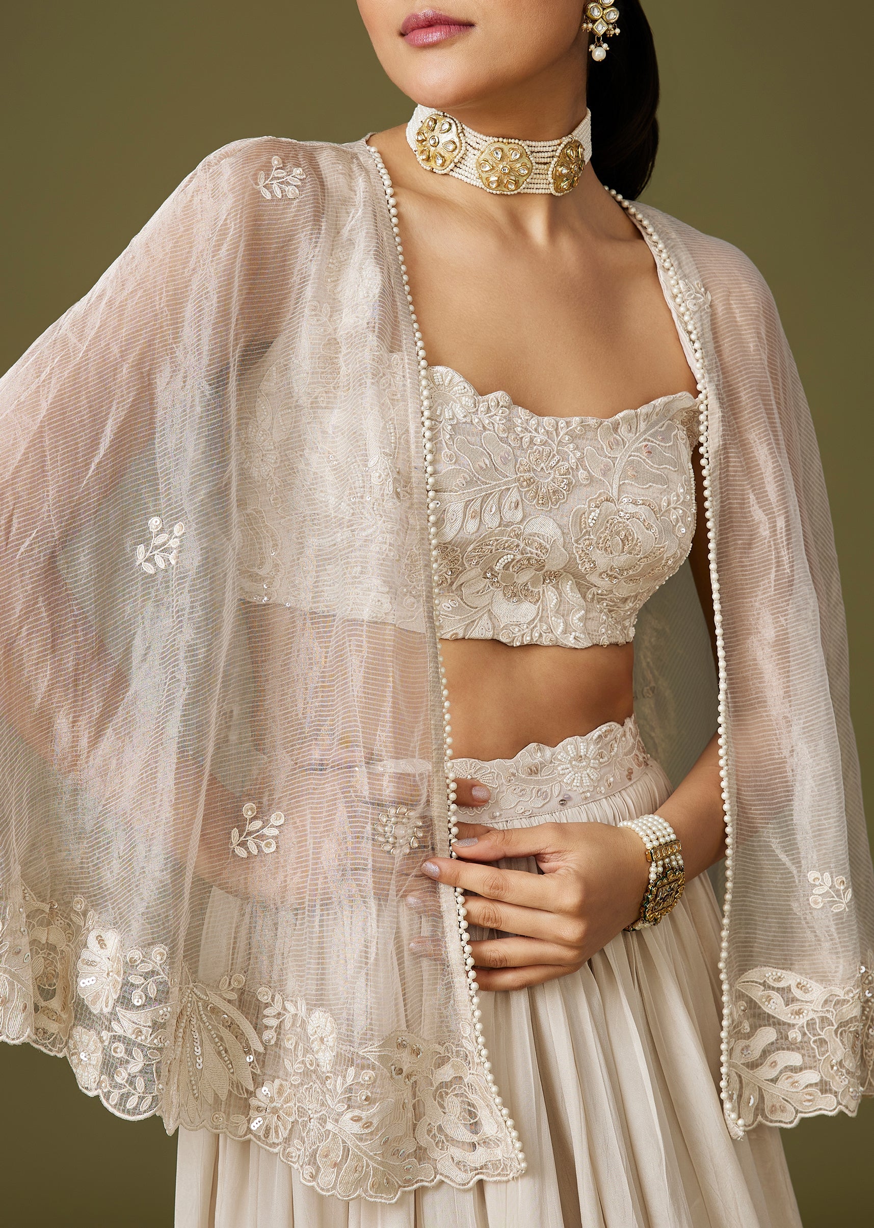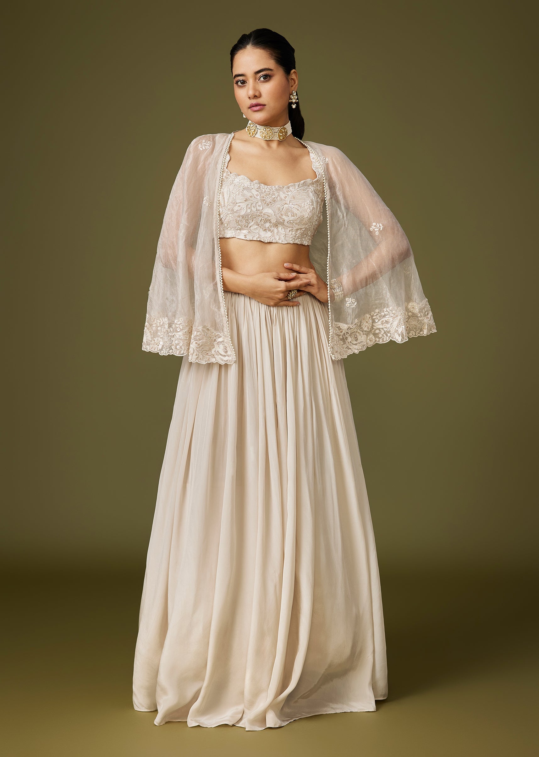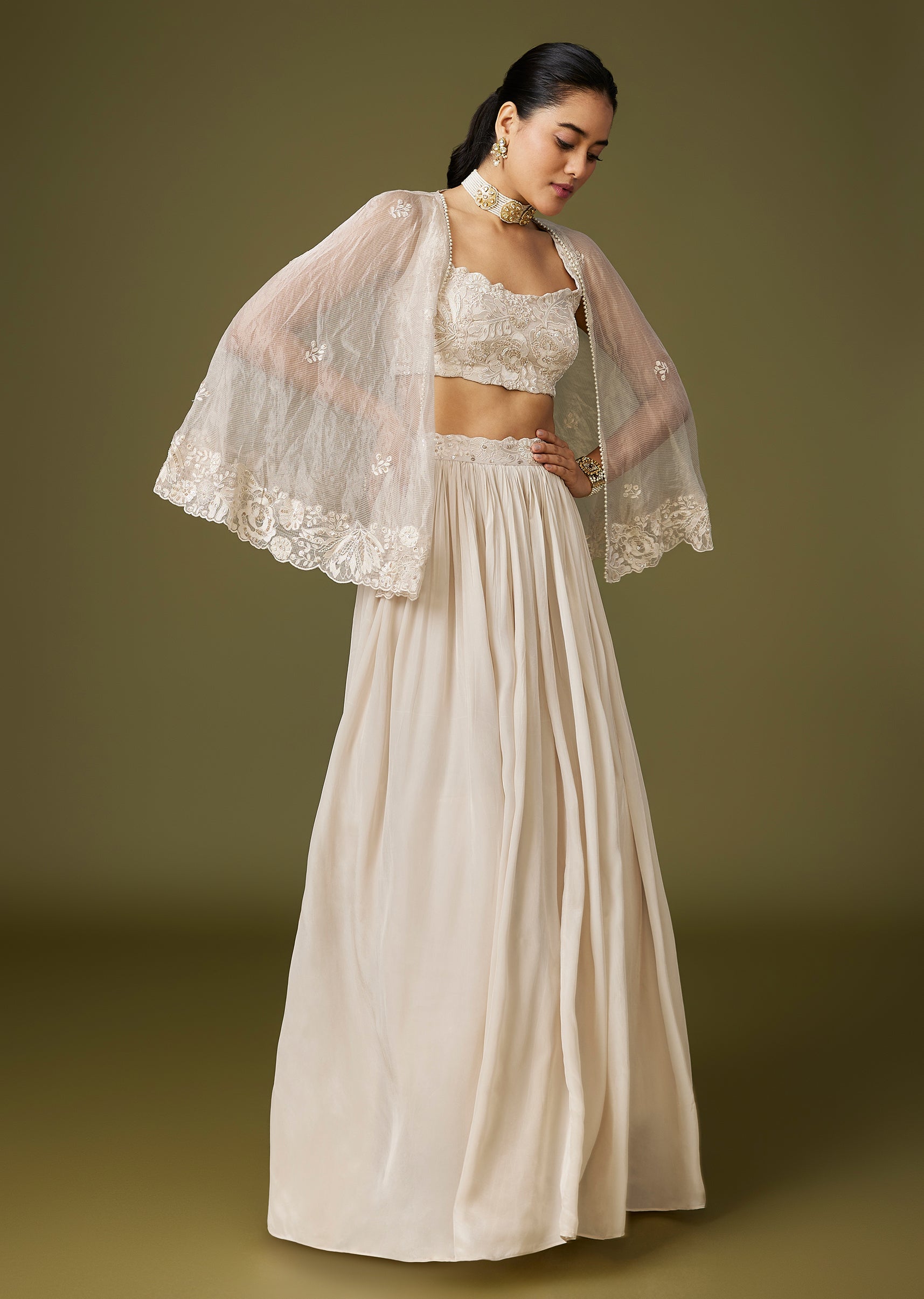 Ivory Minimal Cape Lehenga Set With Thread And Bead Detailing