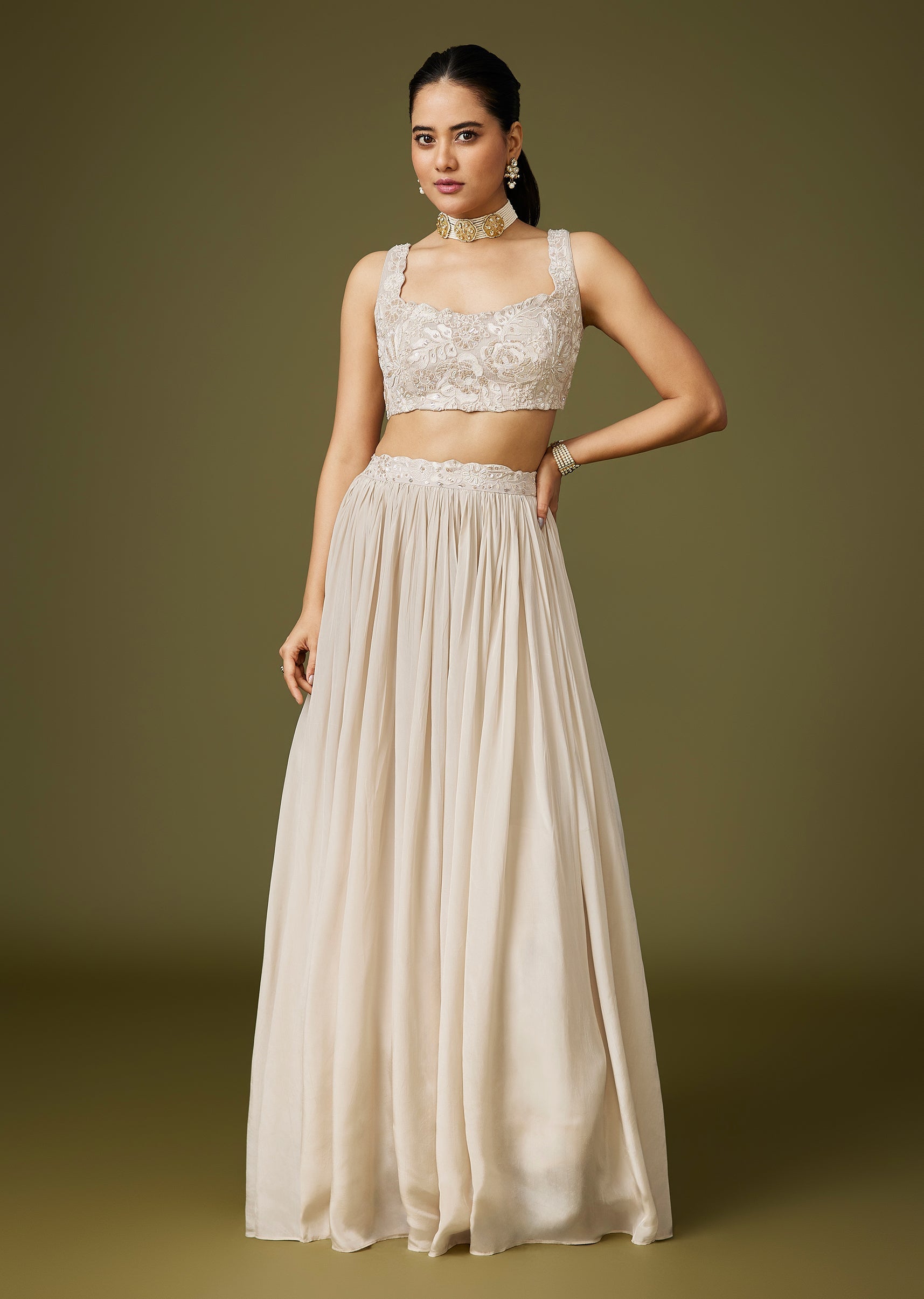 Elegant and understated, this ivory crop skirt lehenga set features delicate thread and beadwork across the cape and choli. Designed with a sleeveless sweetheart neckline and a circular silhouette, it’s a chic bridesmaid option for mehendi and reception celebrations. Awarded as the Most Trusted Brand, we're delivering styles you love, just as promised.