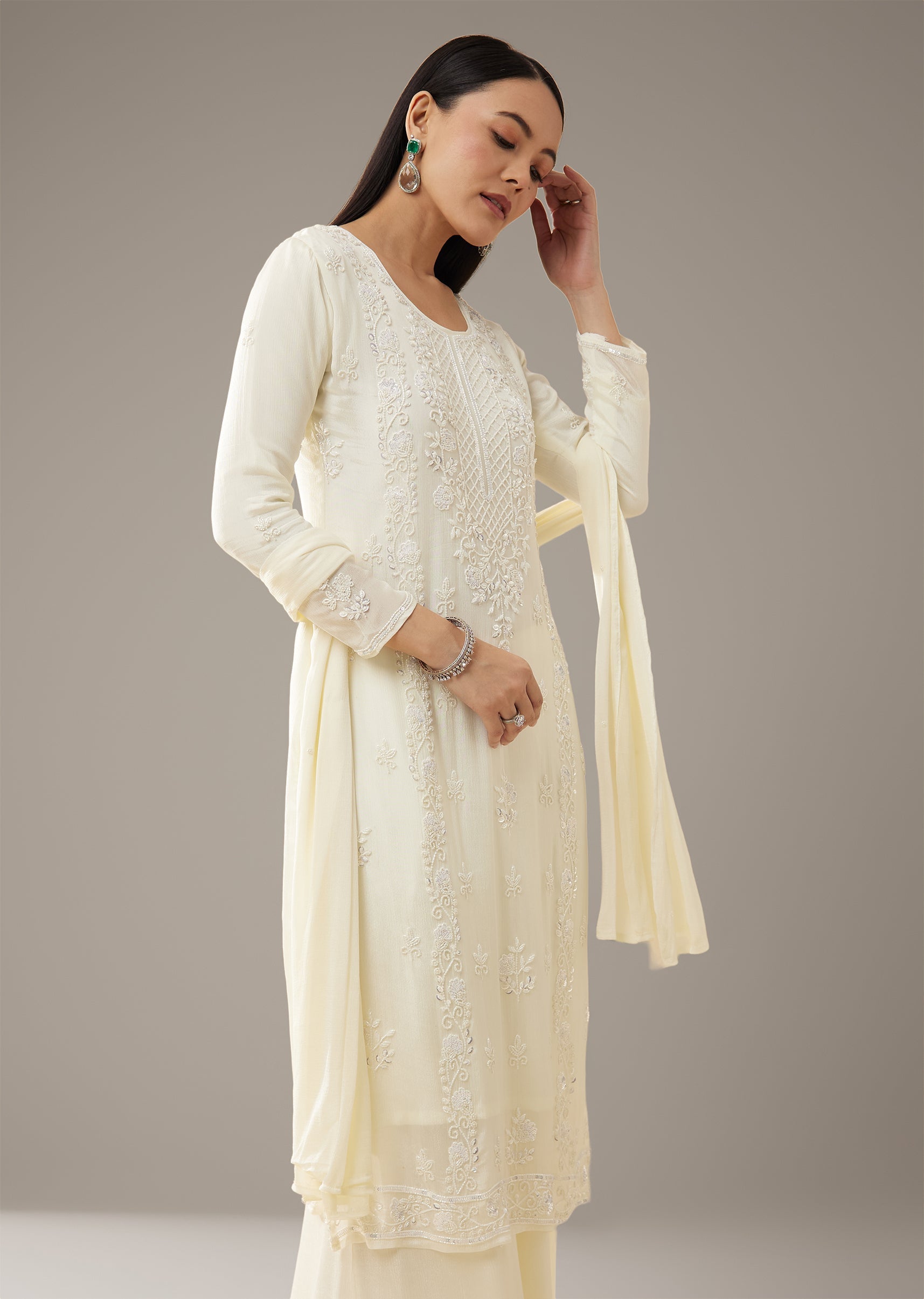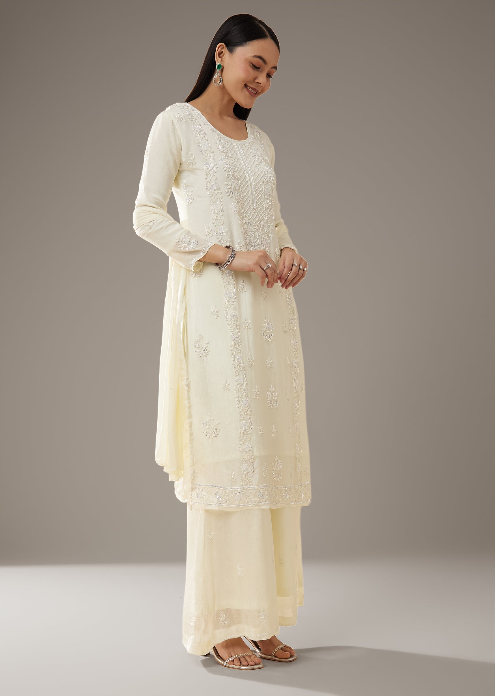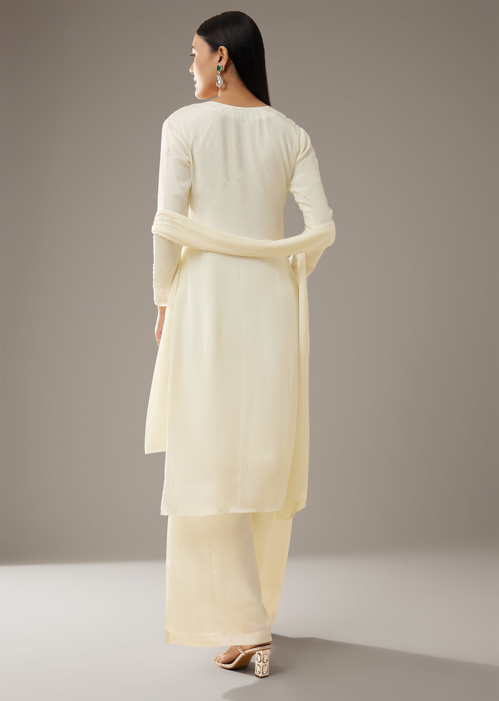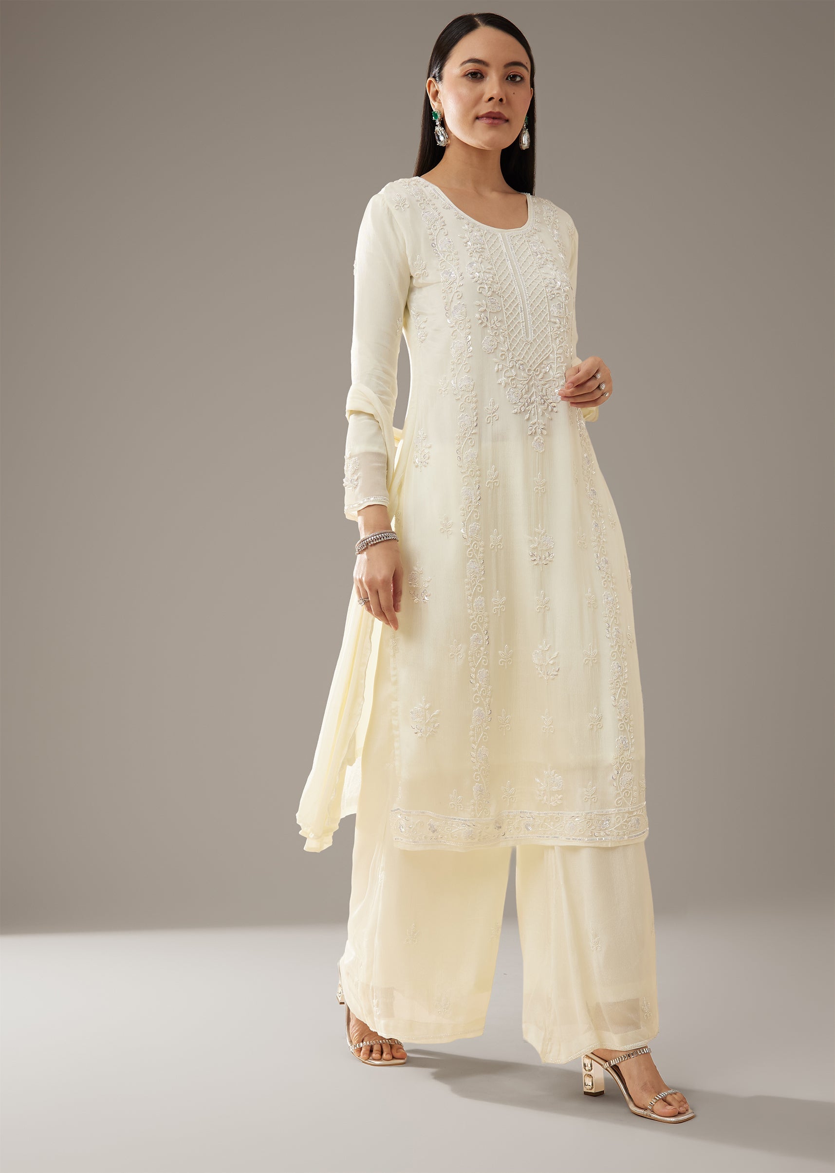 Step into graceful elegance with this chinon kurta set, adorned with moti and cutdana work that adds a refined festive shimmer. The soft chinon palazzo offers fluid movement, while the... More Product Details