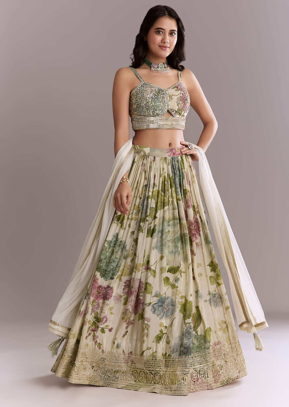 Ivory Tissue Bridesmaid Lehenga With Floral Print And Embroidery
