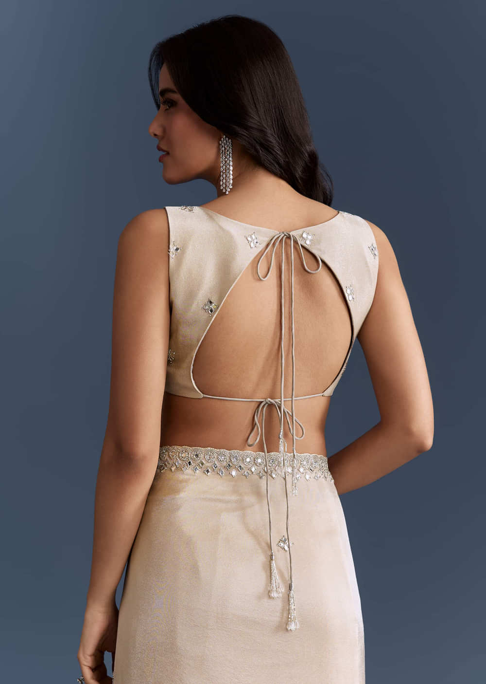 Airy and luminous, this ivory tissue saree keeps the palette minimal so the work can shine. Embroidered butti and a scalloped border featuring salli, cutdana, mirror and stones add texture... More Product Details