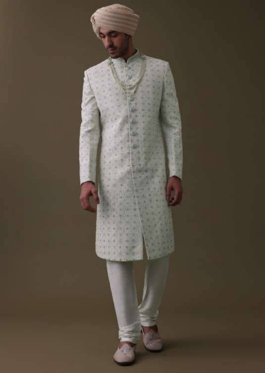 - Introducing our elegant ivory white sherwani set.