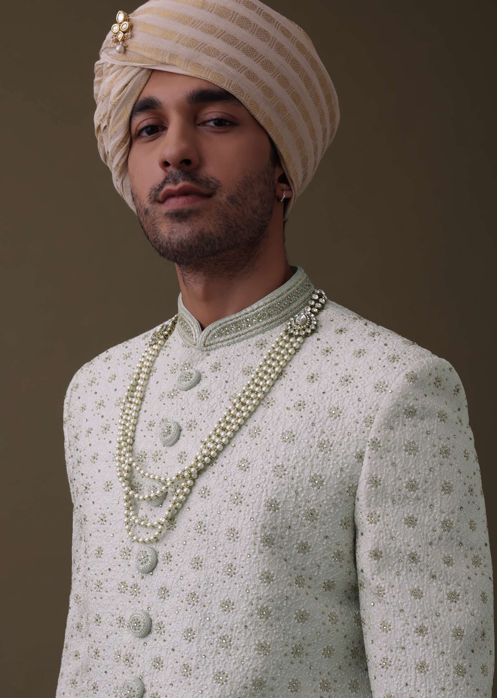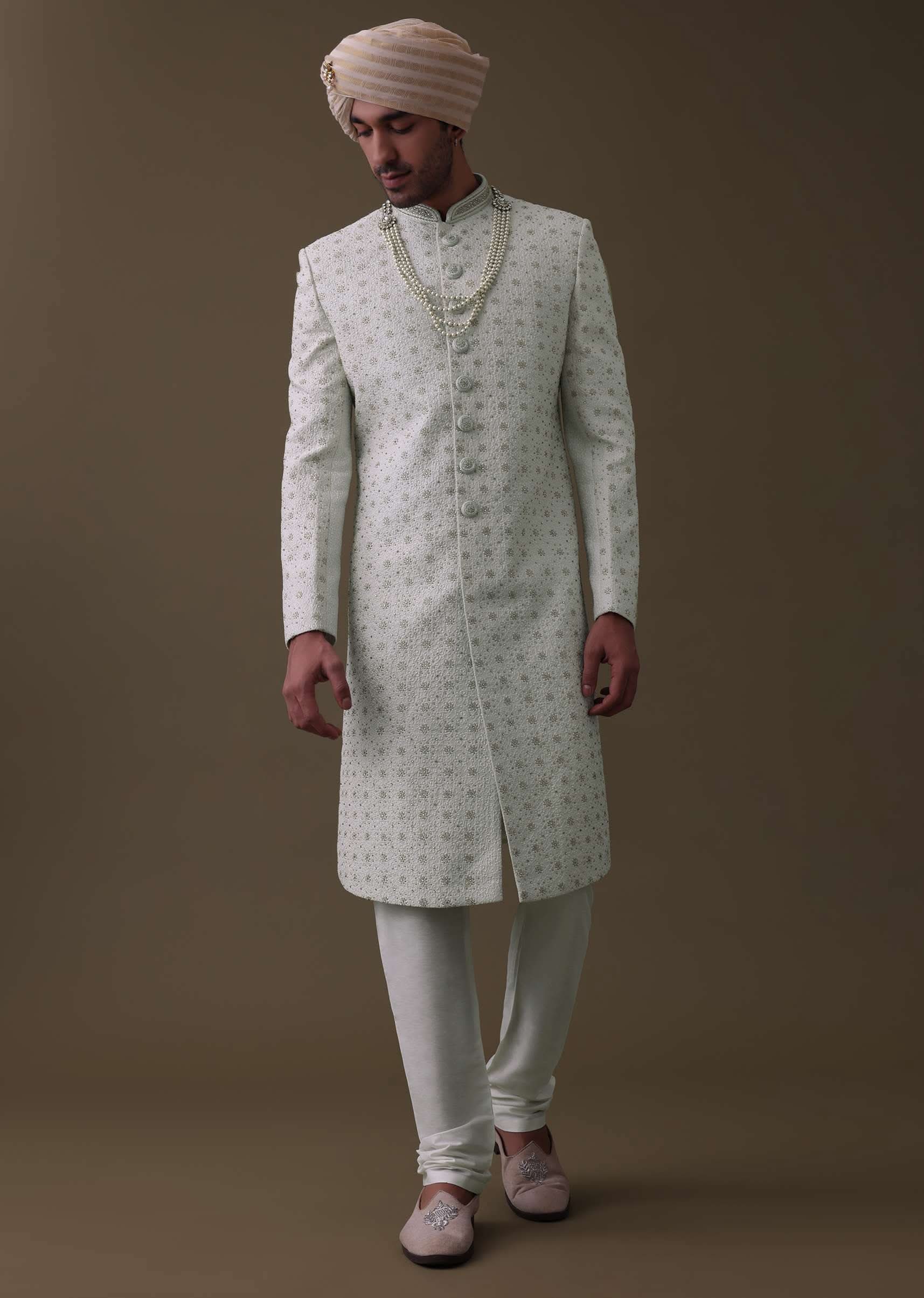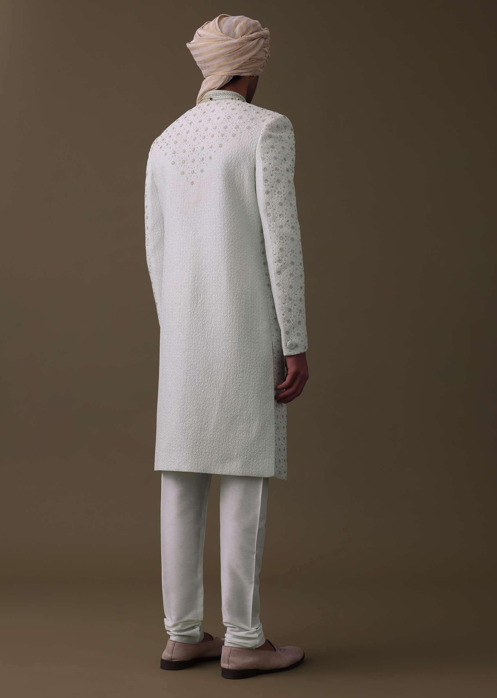 Ivory White Sherwani Set In Silk With Cut Dana Work