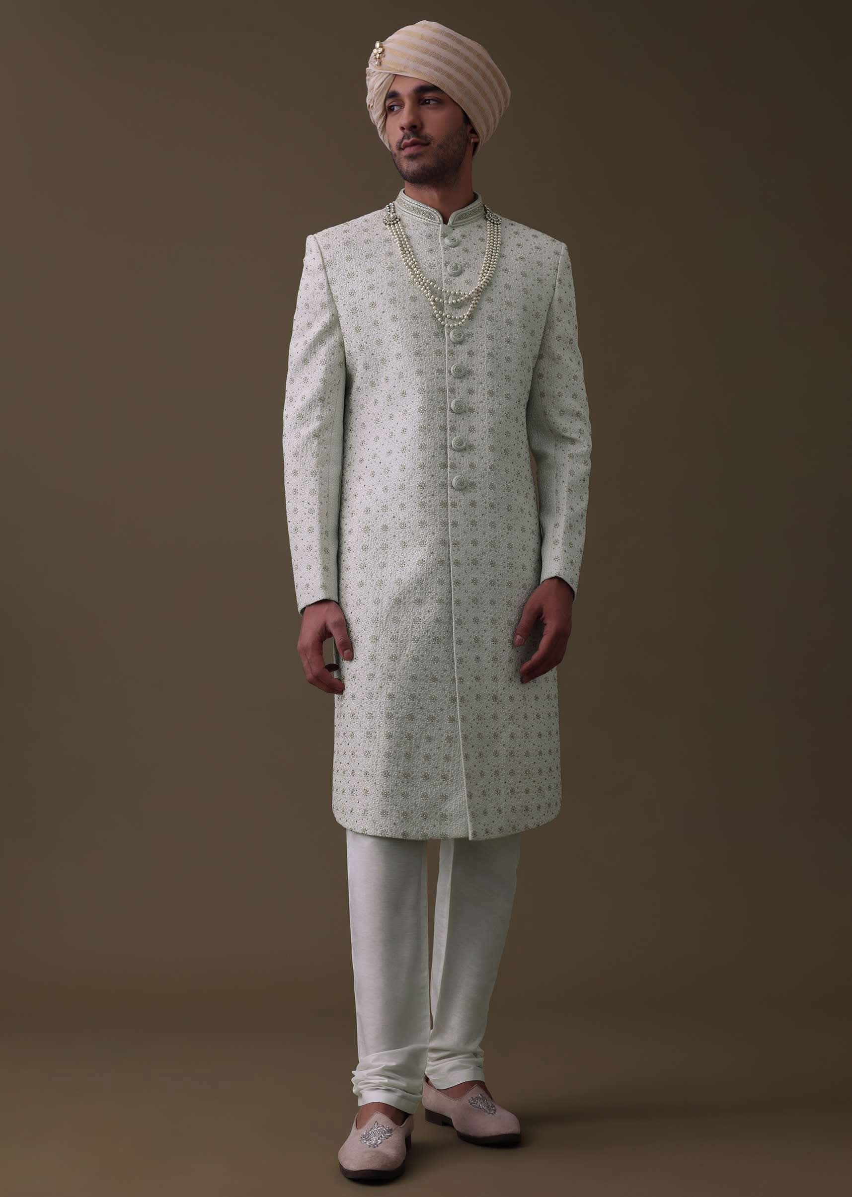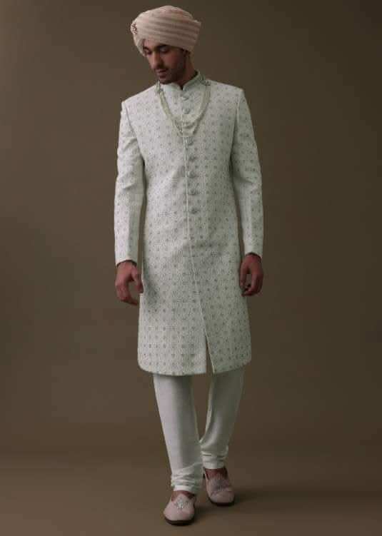 - The sherwani comes in a mandarin collar neckline with full sleeves.