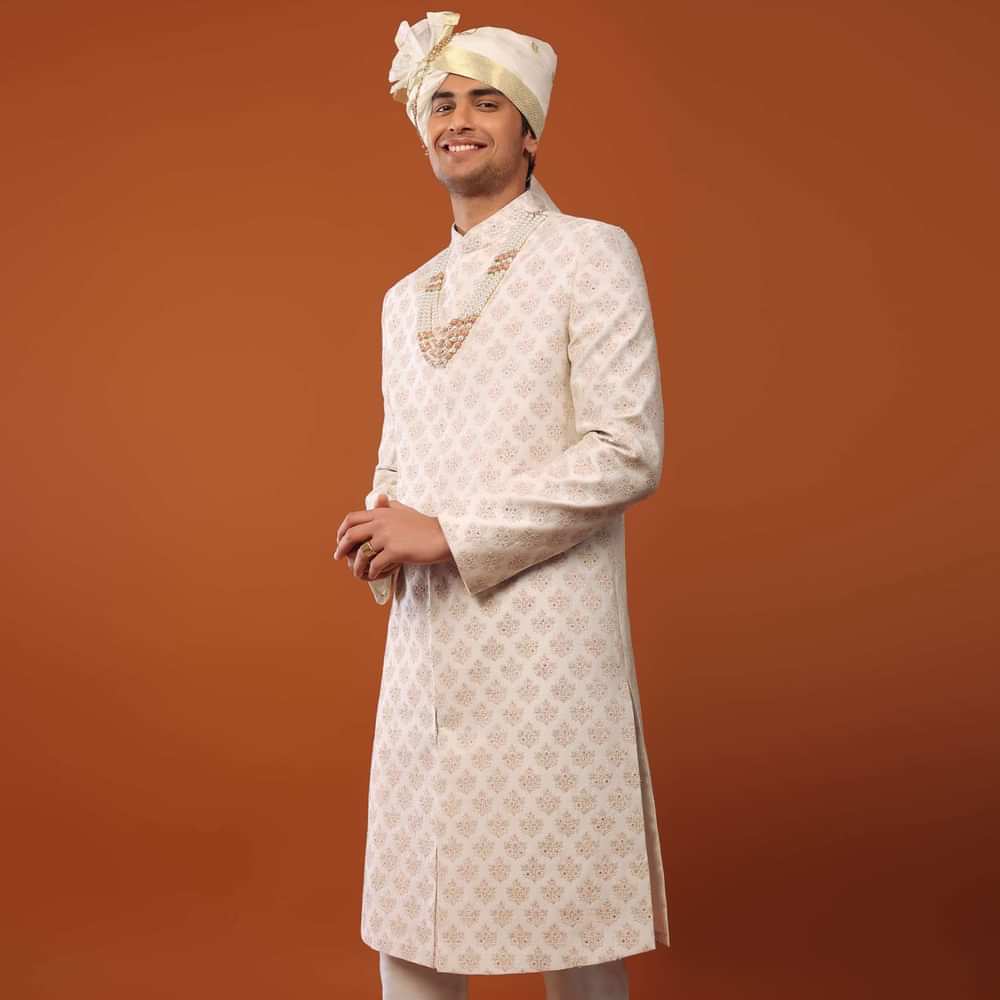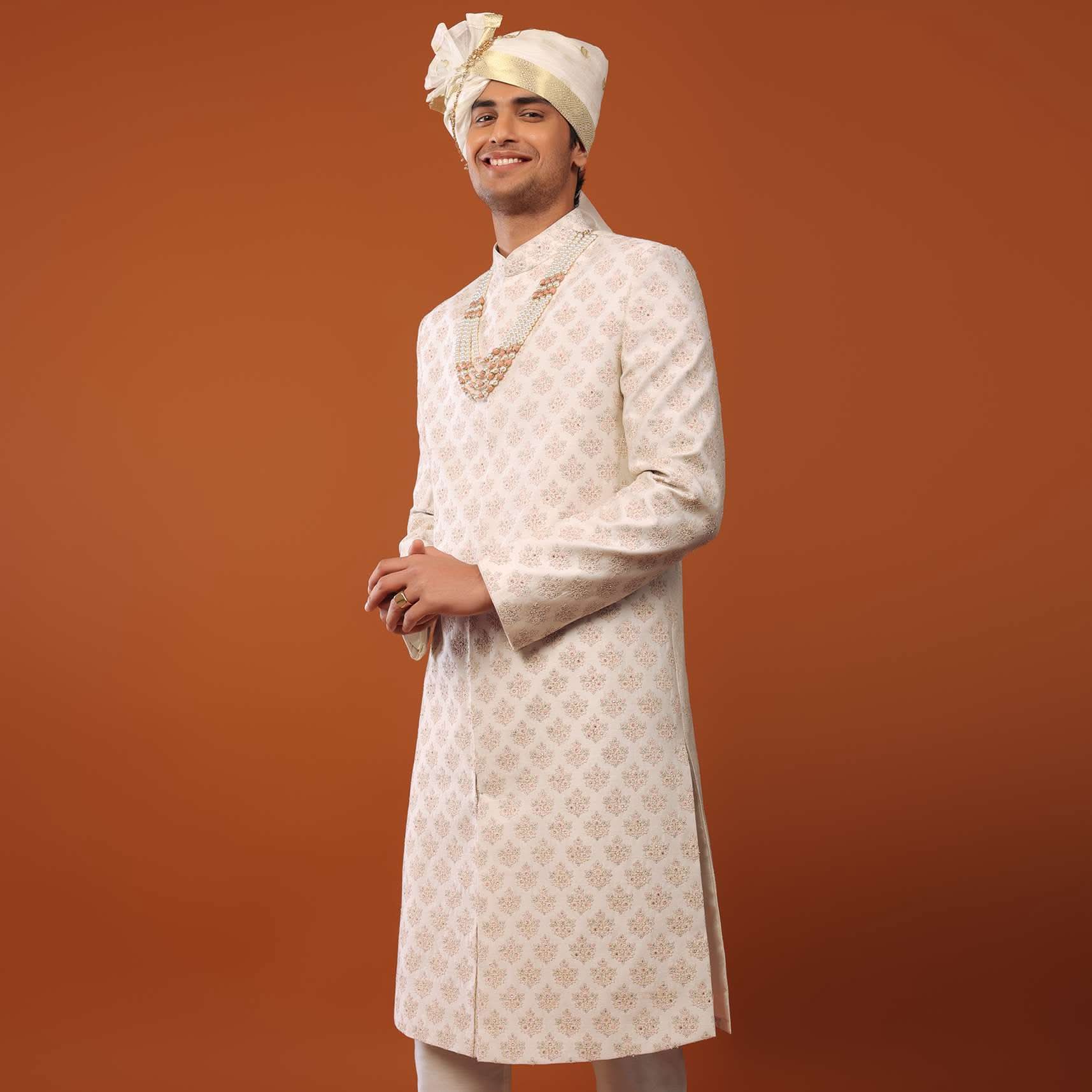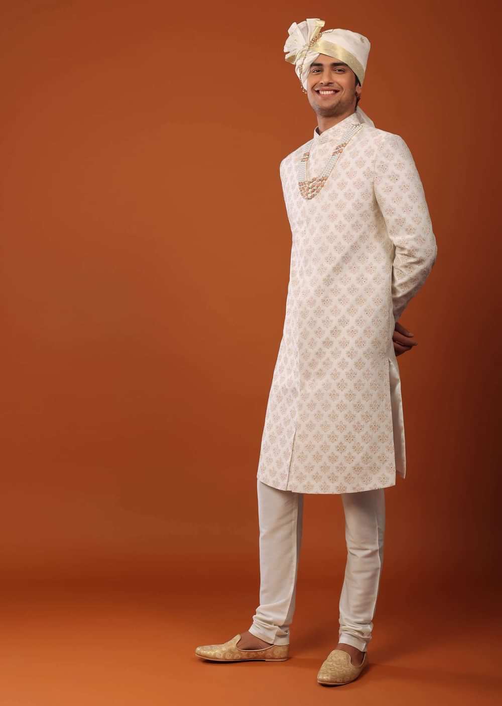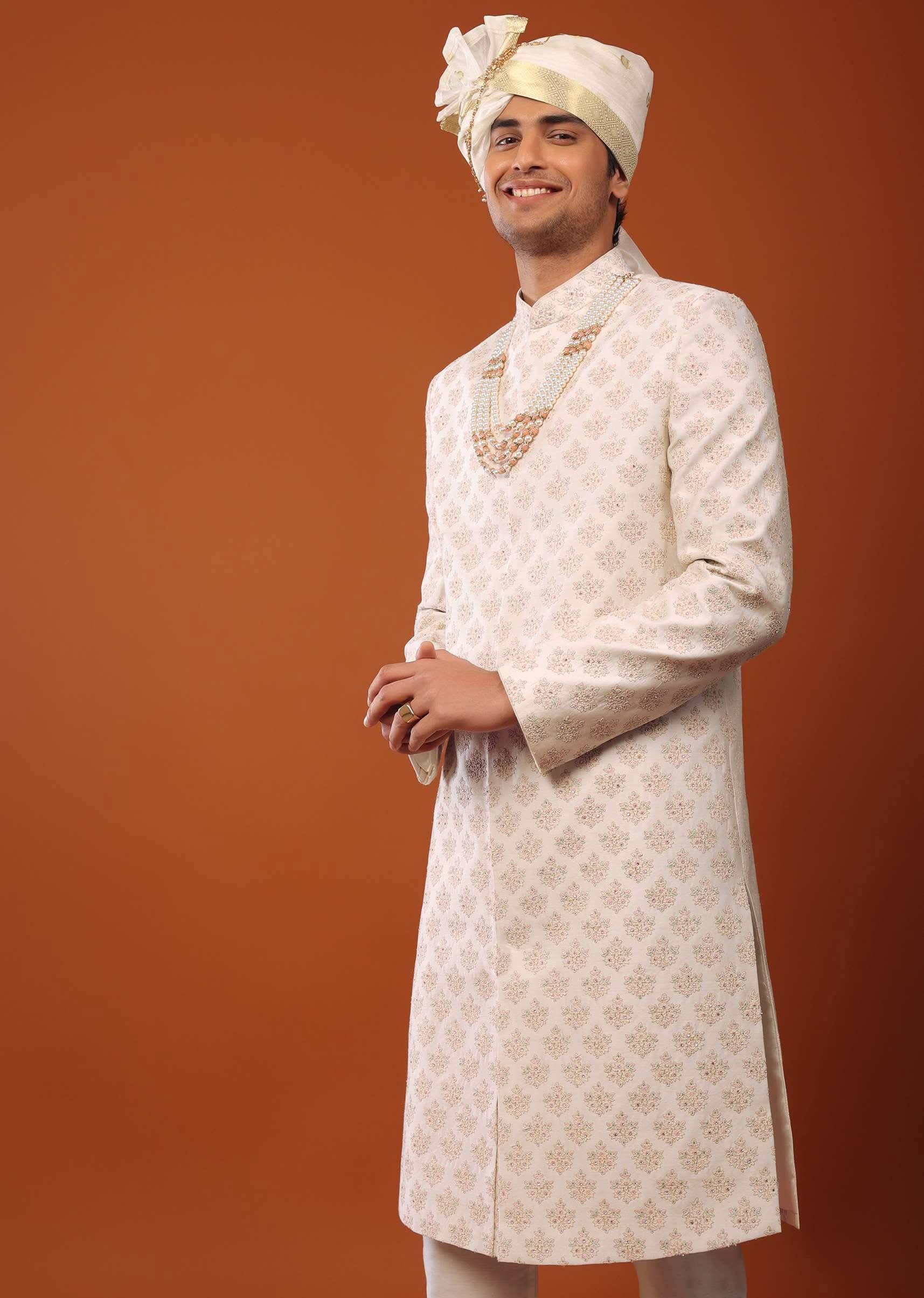 Ivory-White Sherwani Set in Silk With Sequins Embroidery
