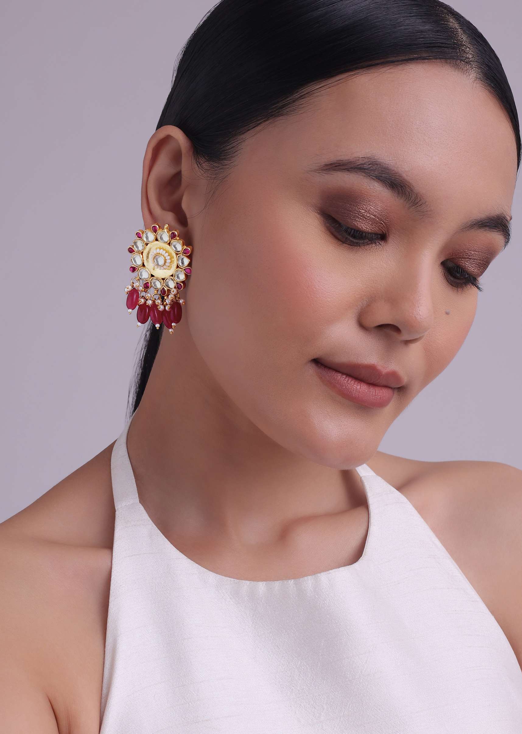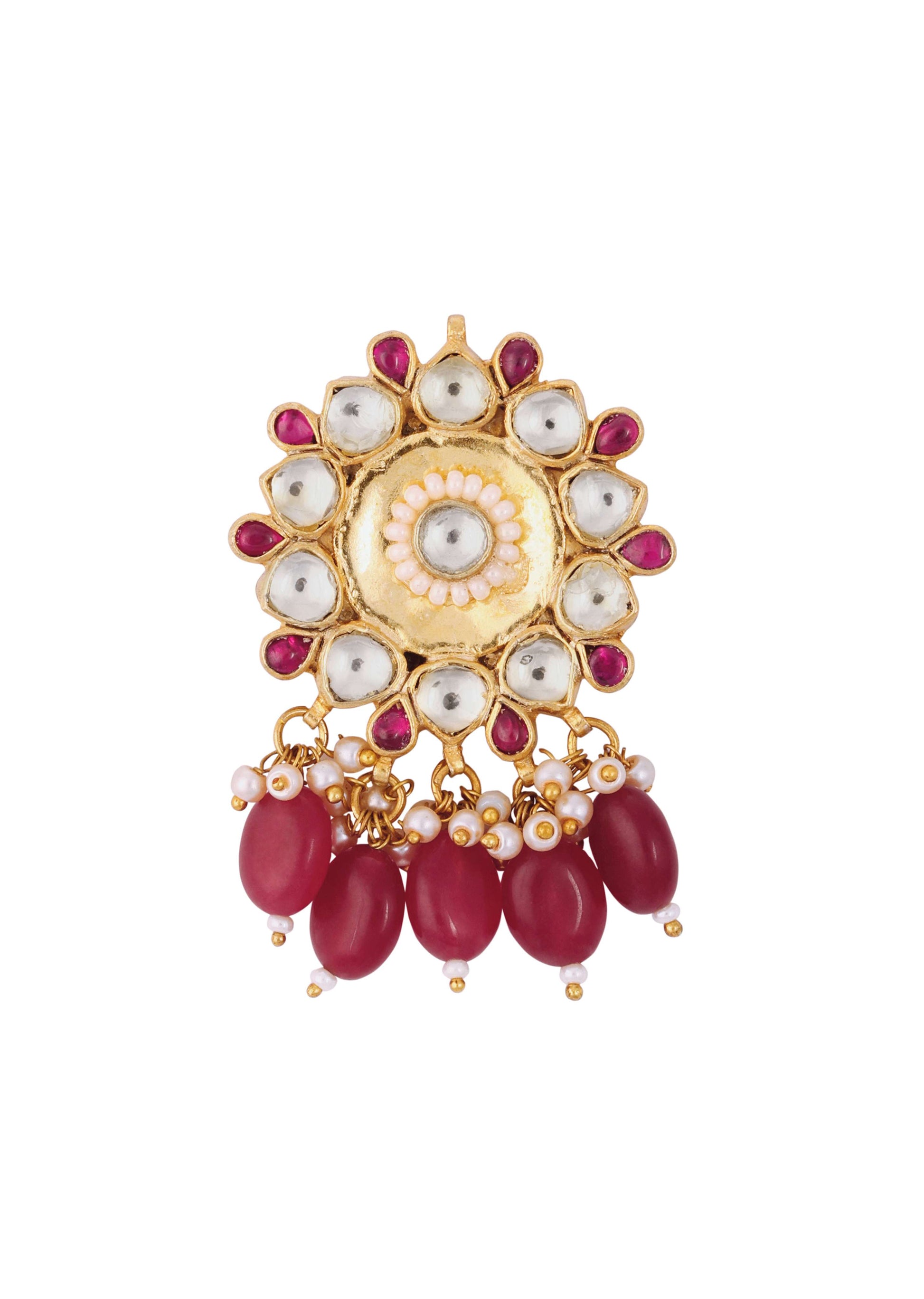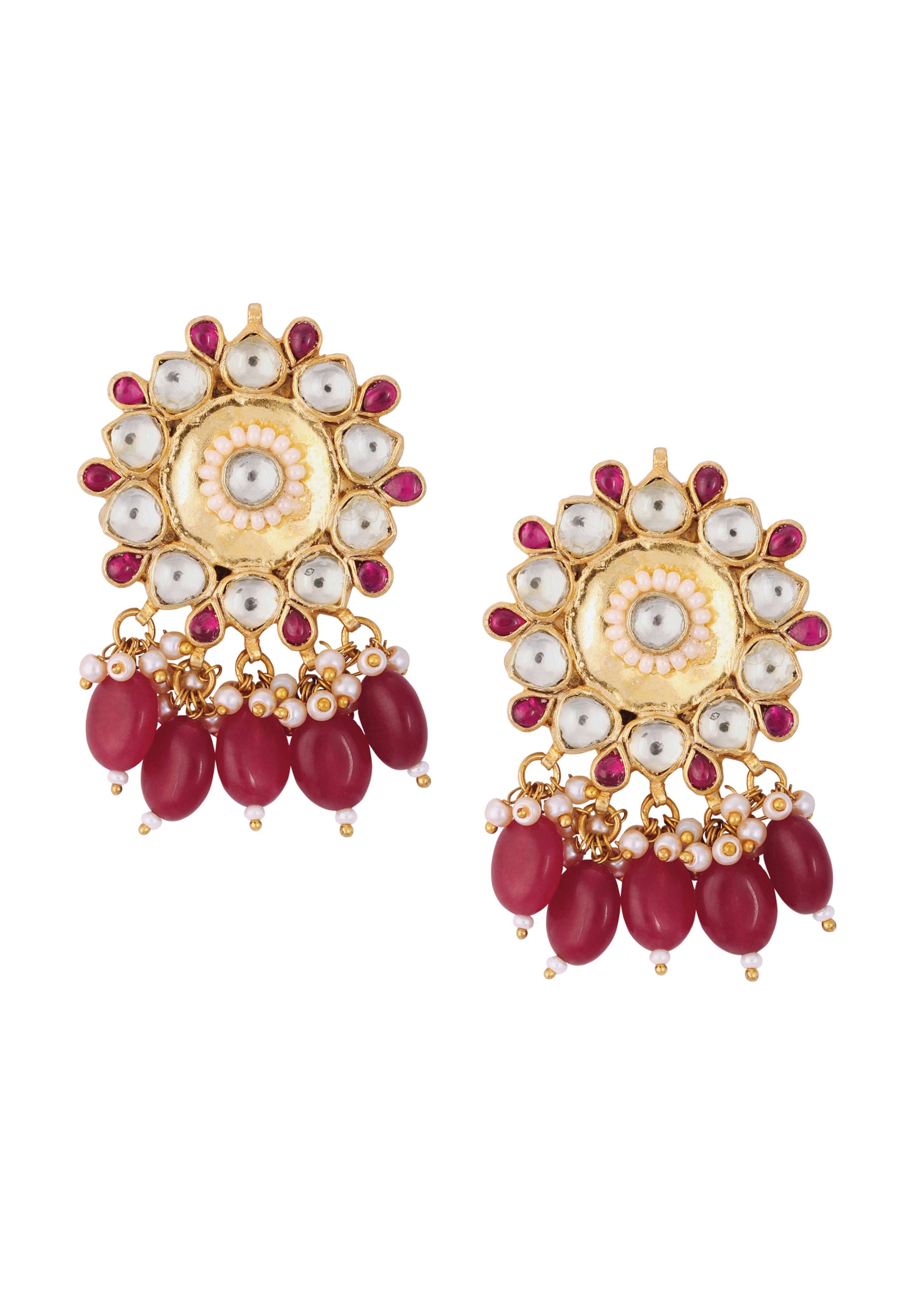 - Presenting a gorgeous pair of gold finish jadau kundan earrings in mixed metal, gold finish, synthetic ruby onyx stones, and cut diamonds, along with pearl and stone drops... More Product Details