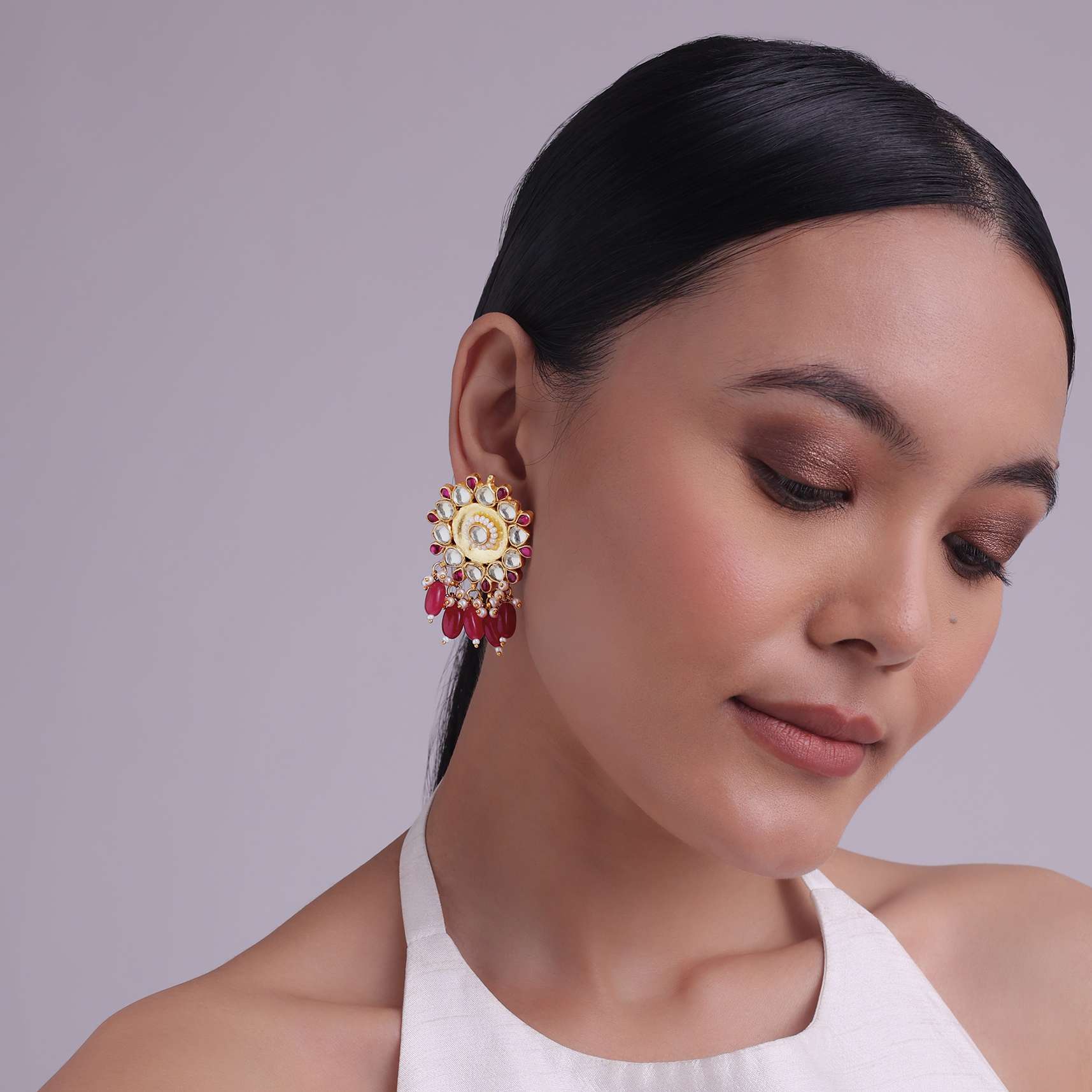 - The earrings are studded with semi-precious synthetic stones and beads in a floral arrangement, circled with cut diamonds, and crafted with stone drop hangings.
