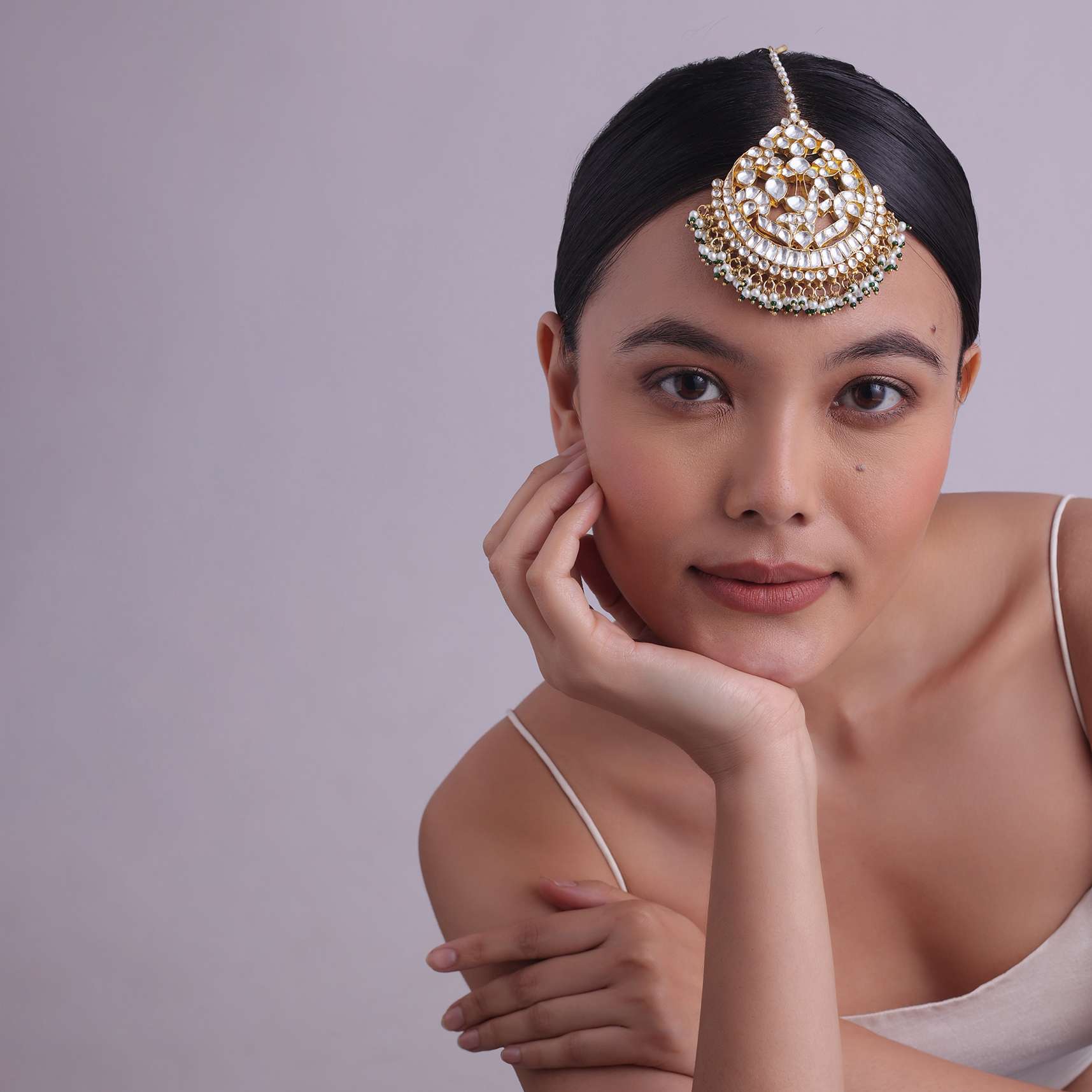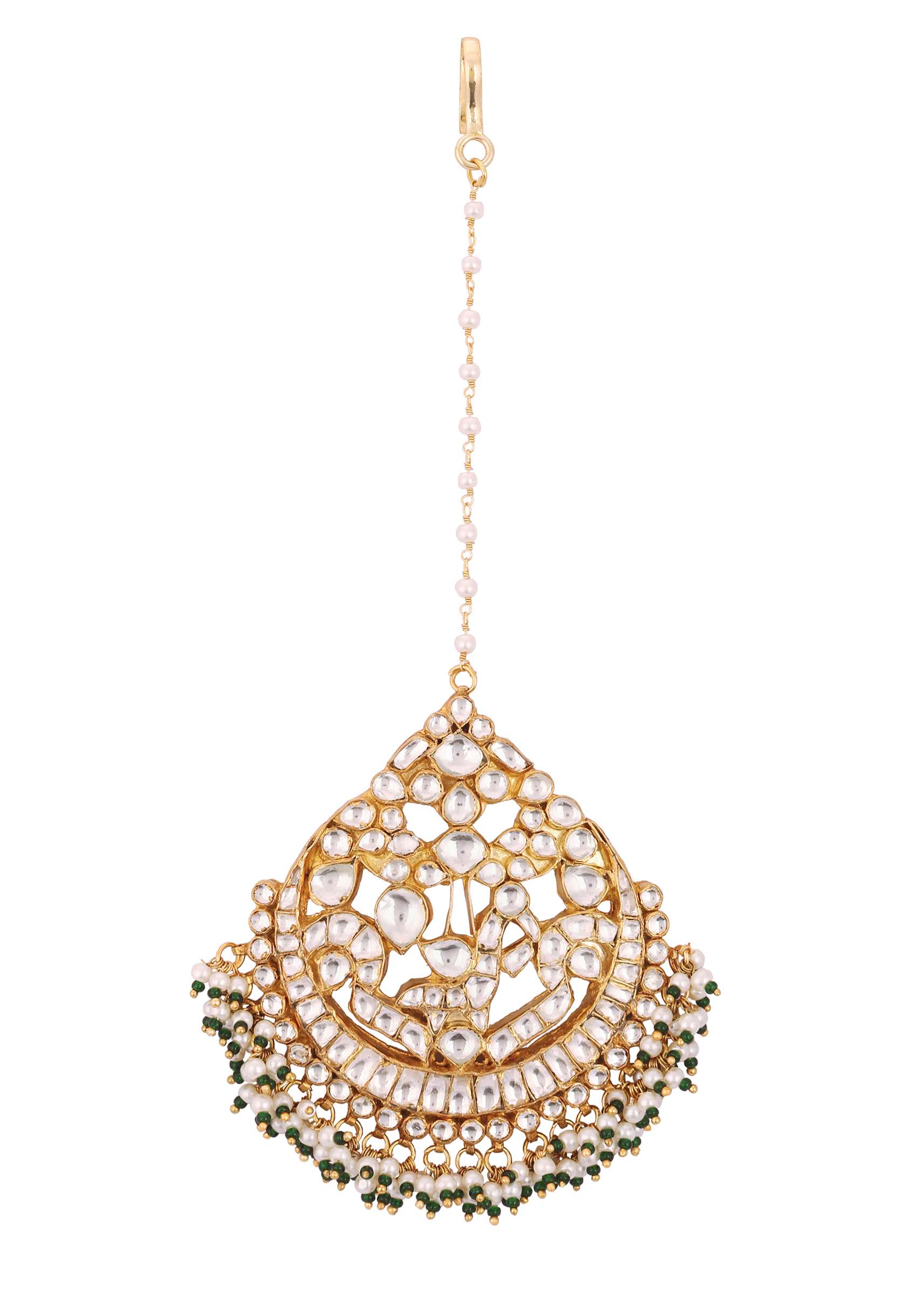 - This is an opulent and traditional kundan maangtika that comes with very delicate pearl hangings with a touch of emerald-colored onyx.