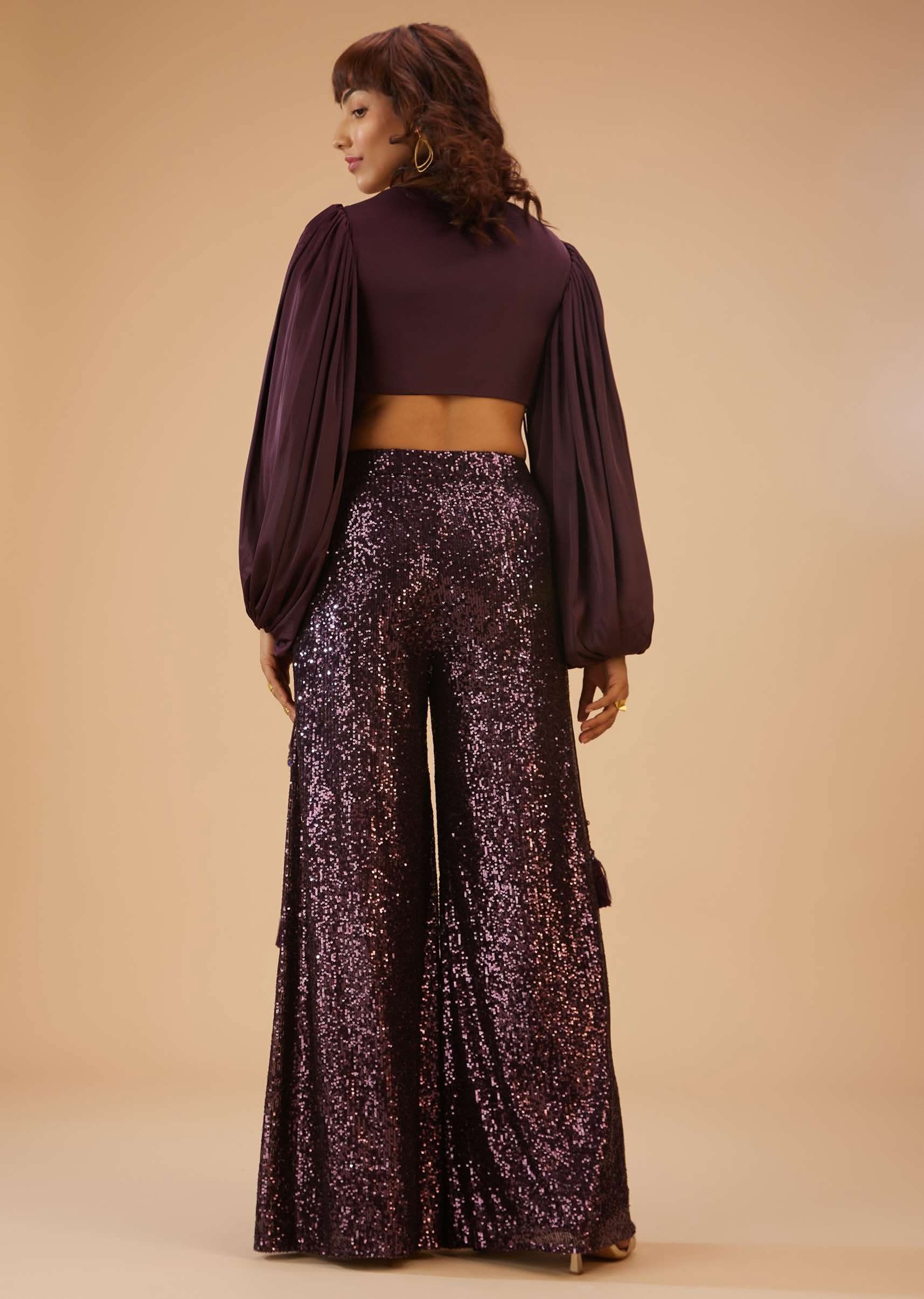- The palazzo has a wide-leg flare and comes with a side-zip closure secured by a hook.