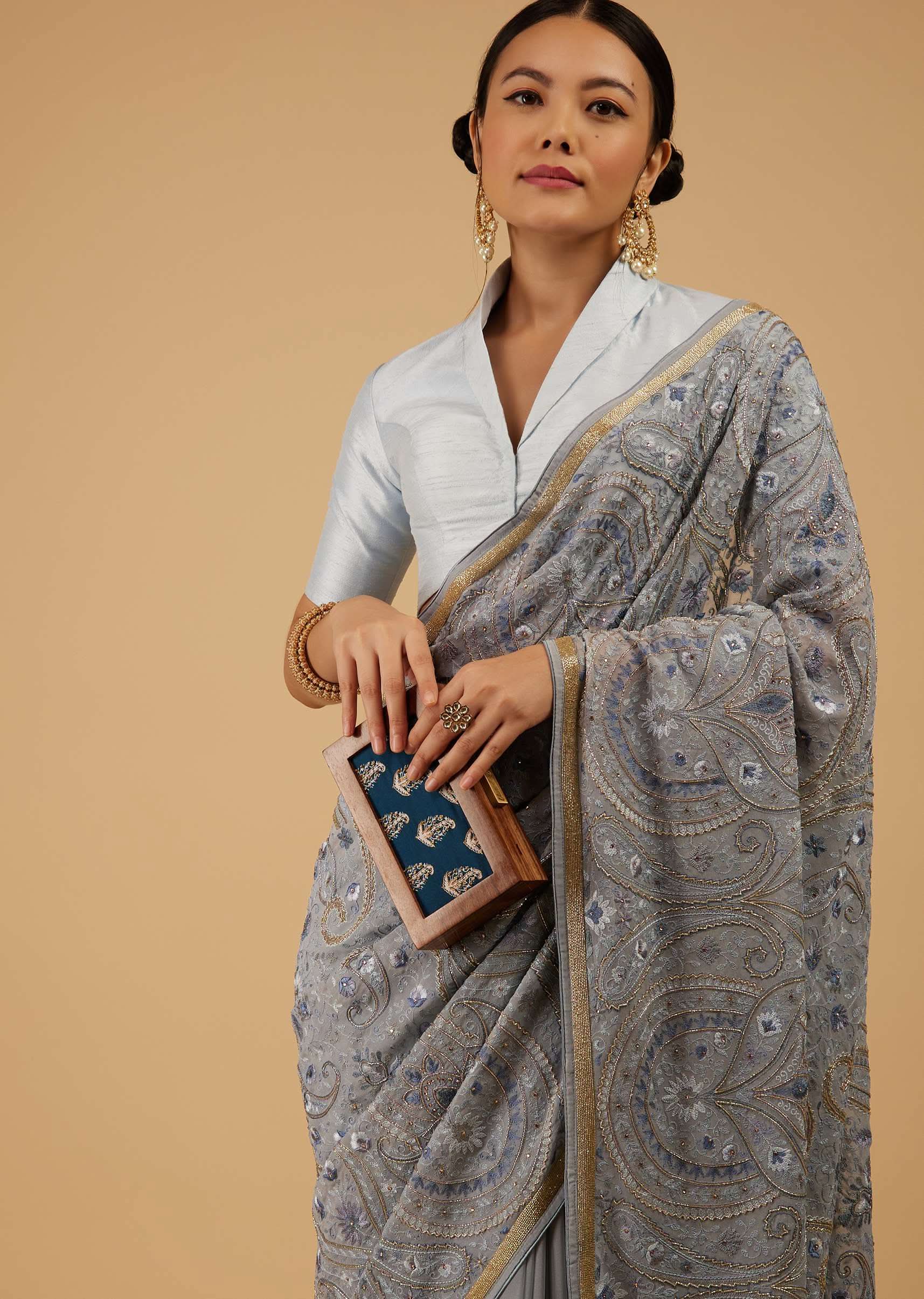 - Kalki Festive Quarry Blue Kashmiri Embroidered Saree In Georgette.