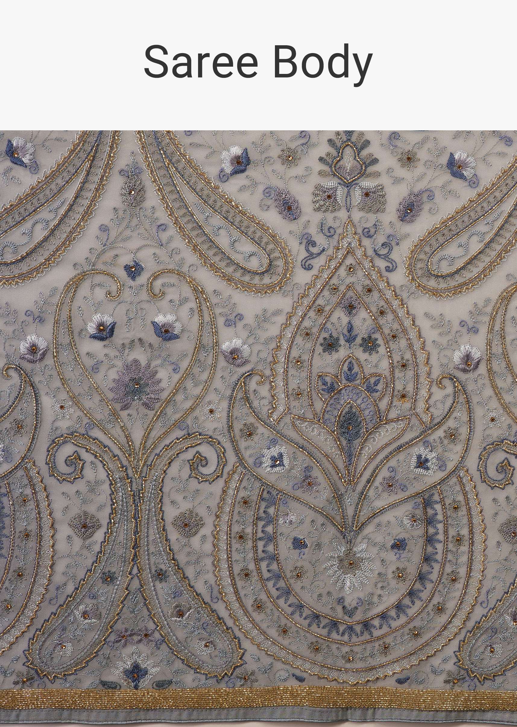- The saree is fabricated in georgette and embroidered in Kashmiri threadwork with cut dana embroidery and stone embellishments.