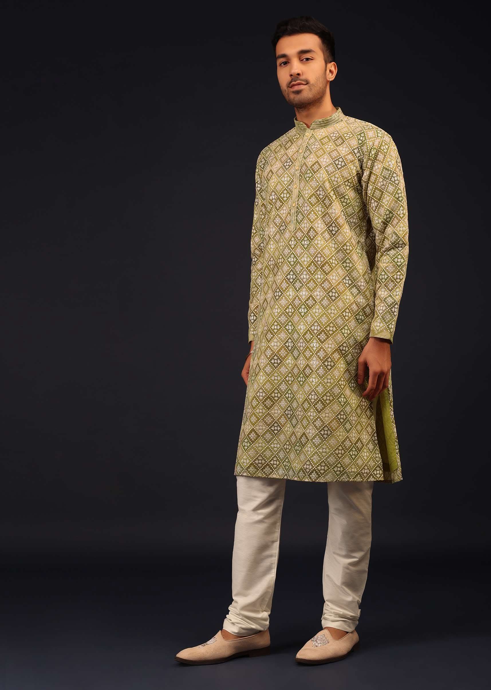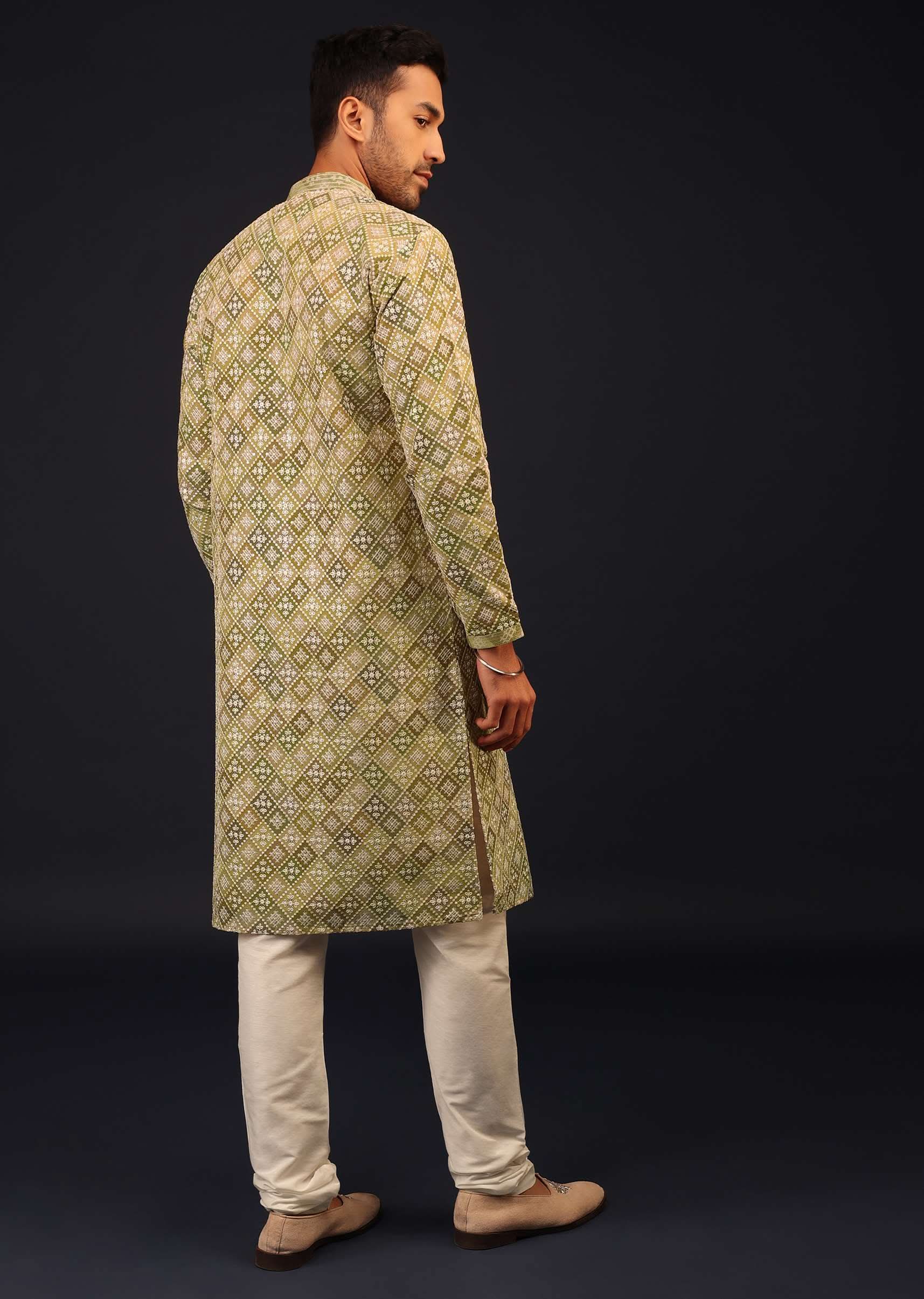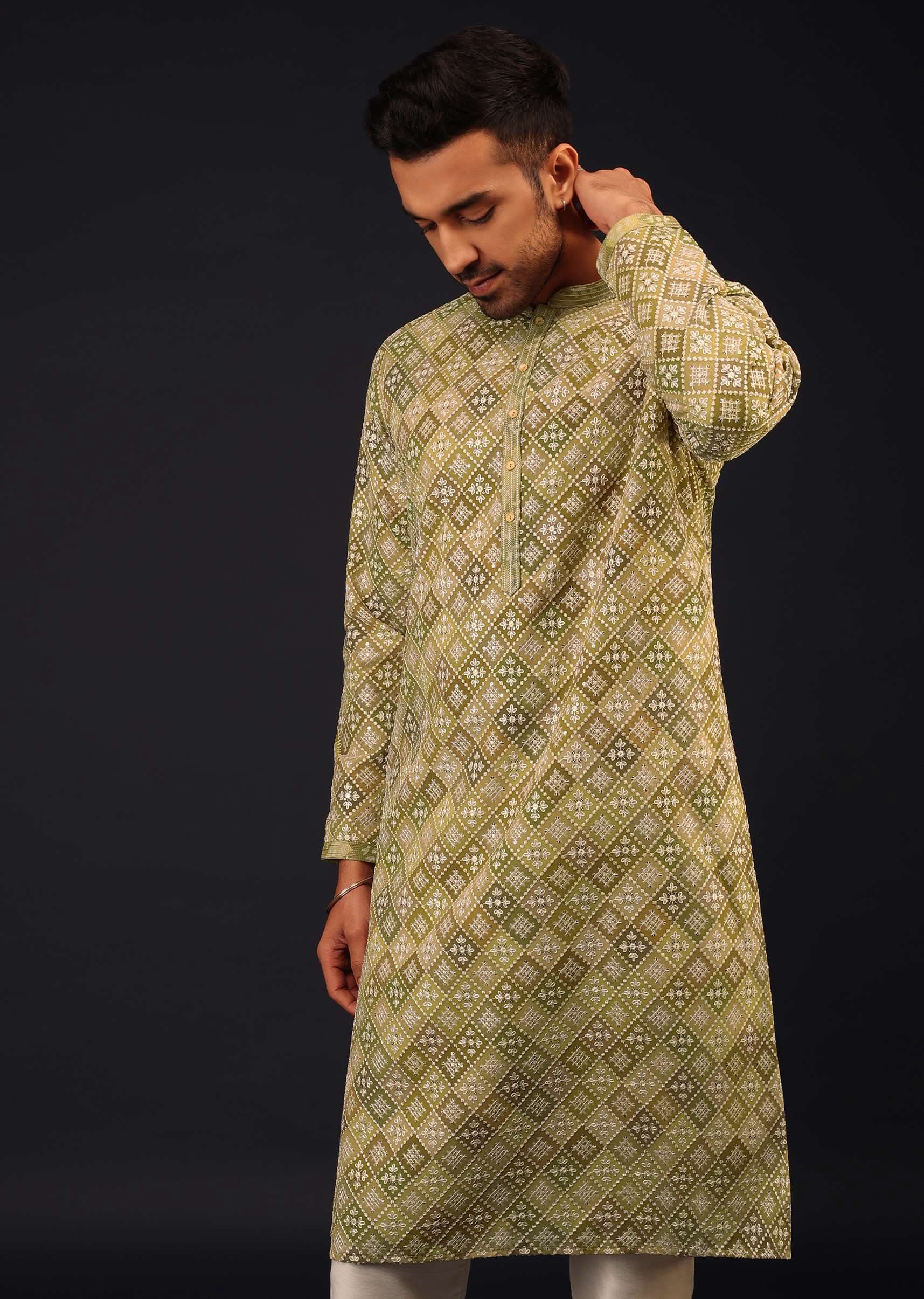 - Kalki olive green kurta with thread and sequin embroidery in multi shades of green.