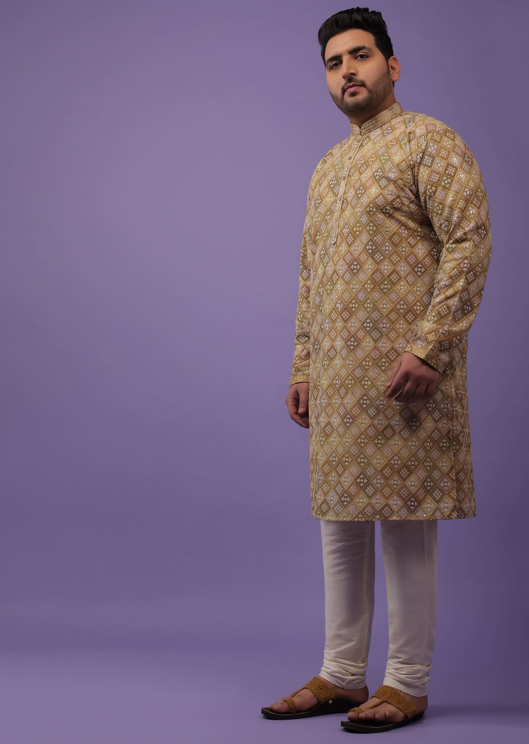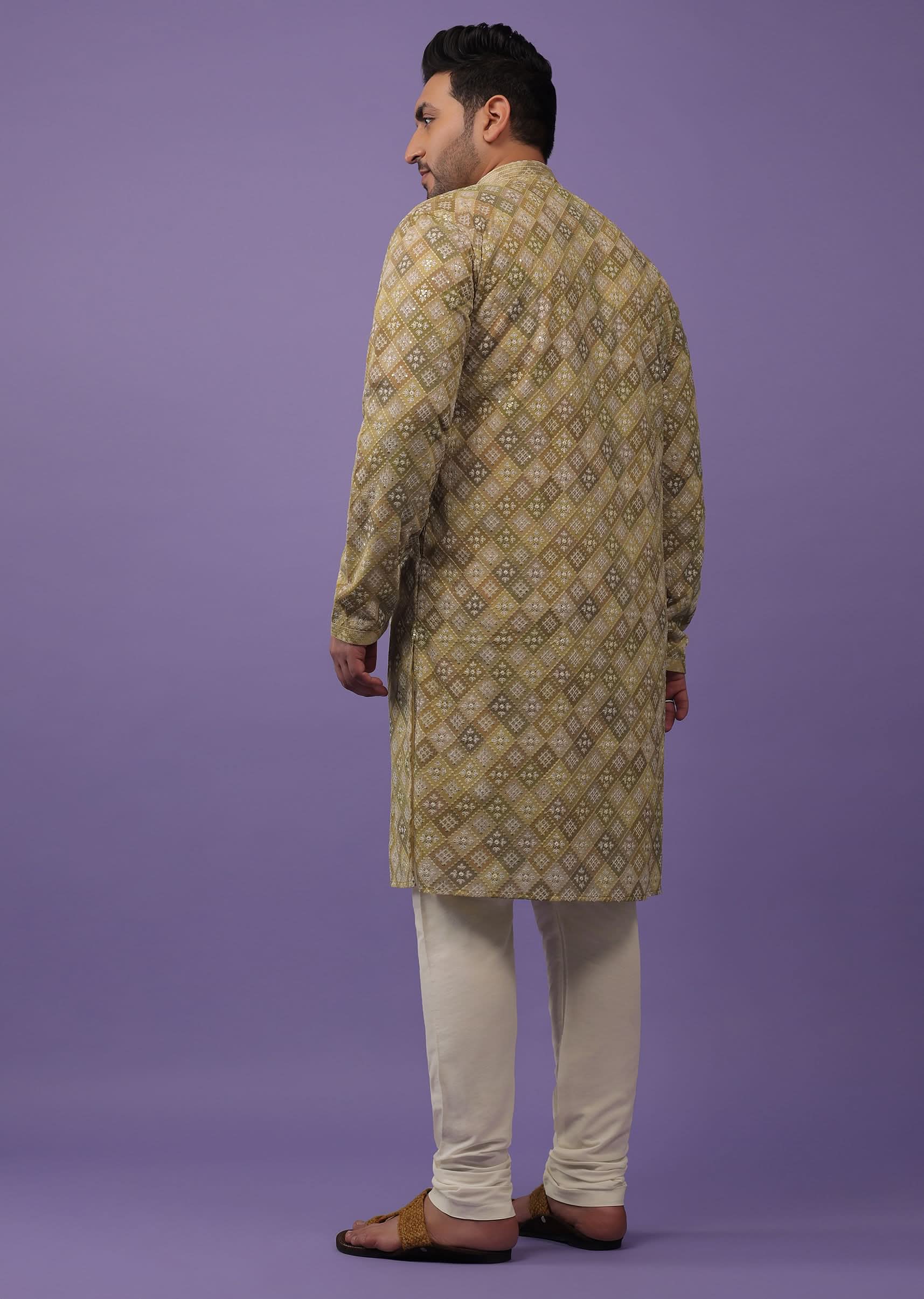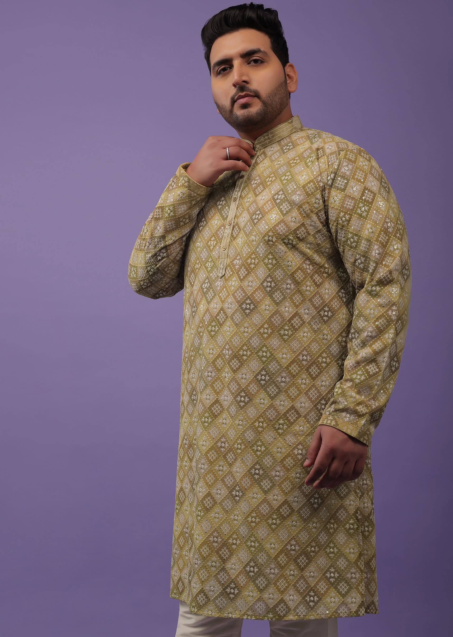 - Kalki olive green kurta with thread and sequin embroidery in multi shades of green.