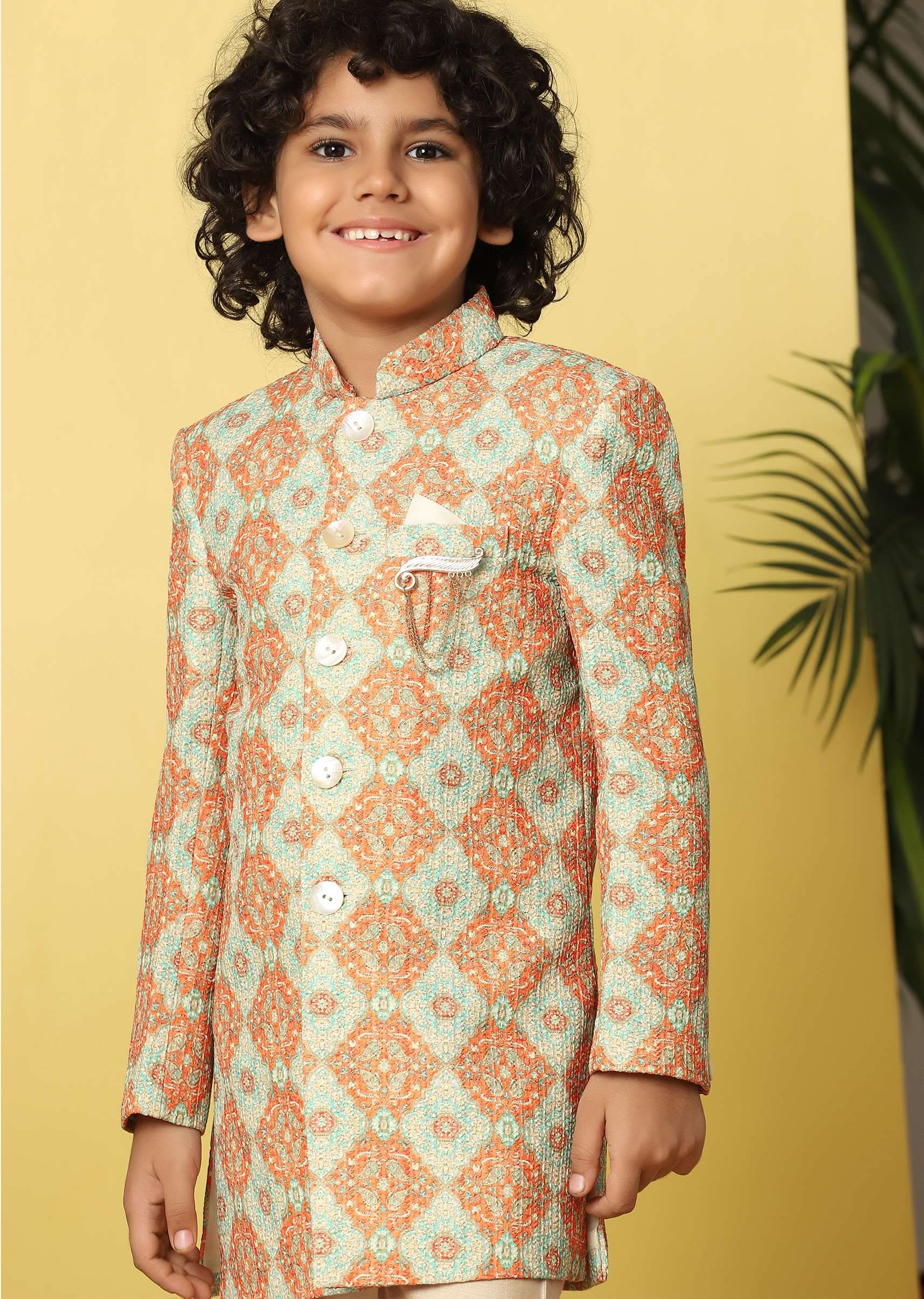 Kalki Orange Printed Sherwani Set In Silk For Boys