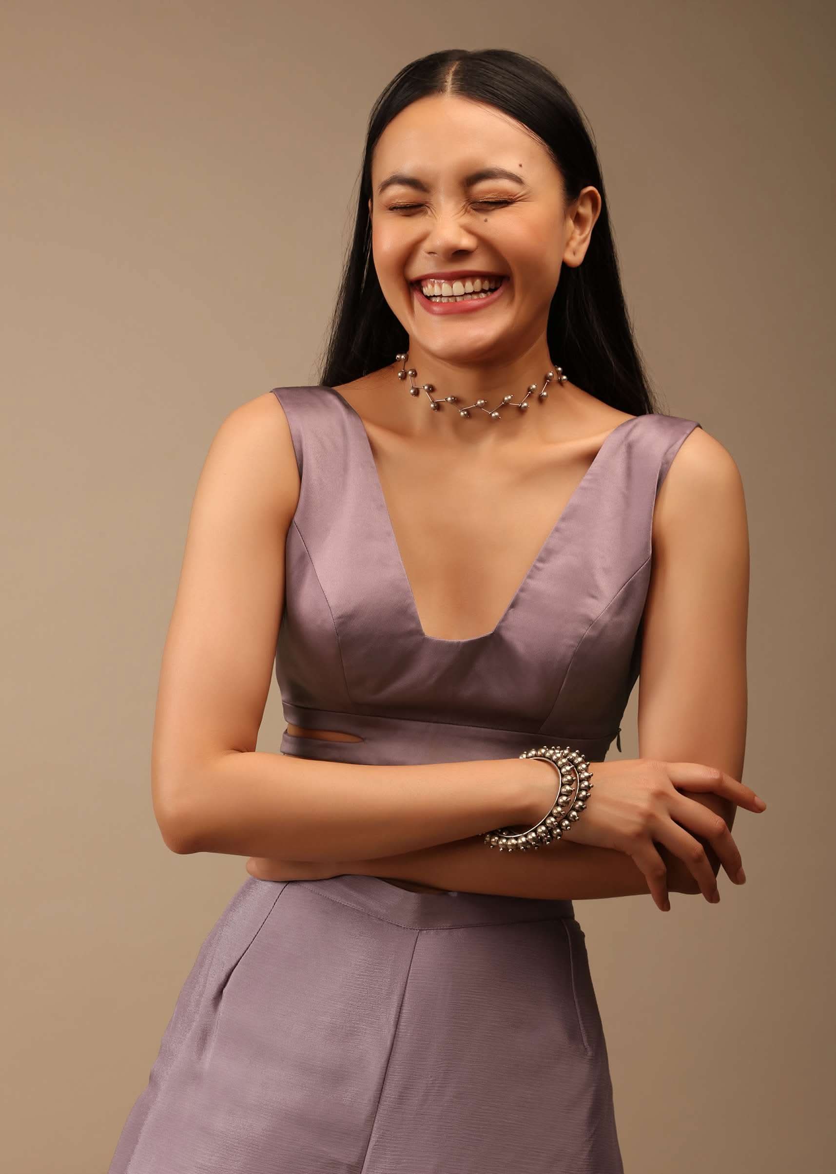 Lavender Ash Sleeveless Blouse In Satin With A Plunging Geometric Neckline