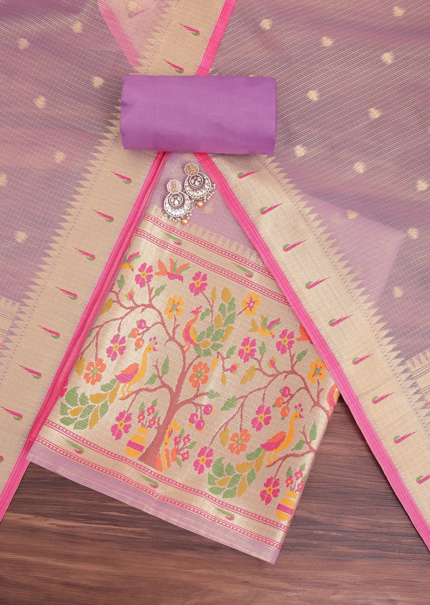 - Transform your festive celebrations with our lavender and gold dress material, designed to help you celebrate in style.