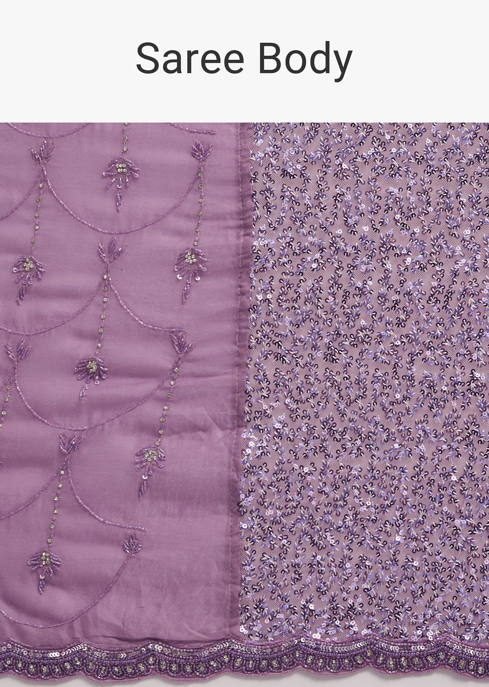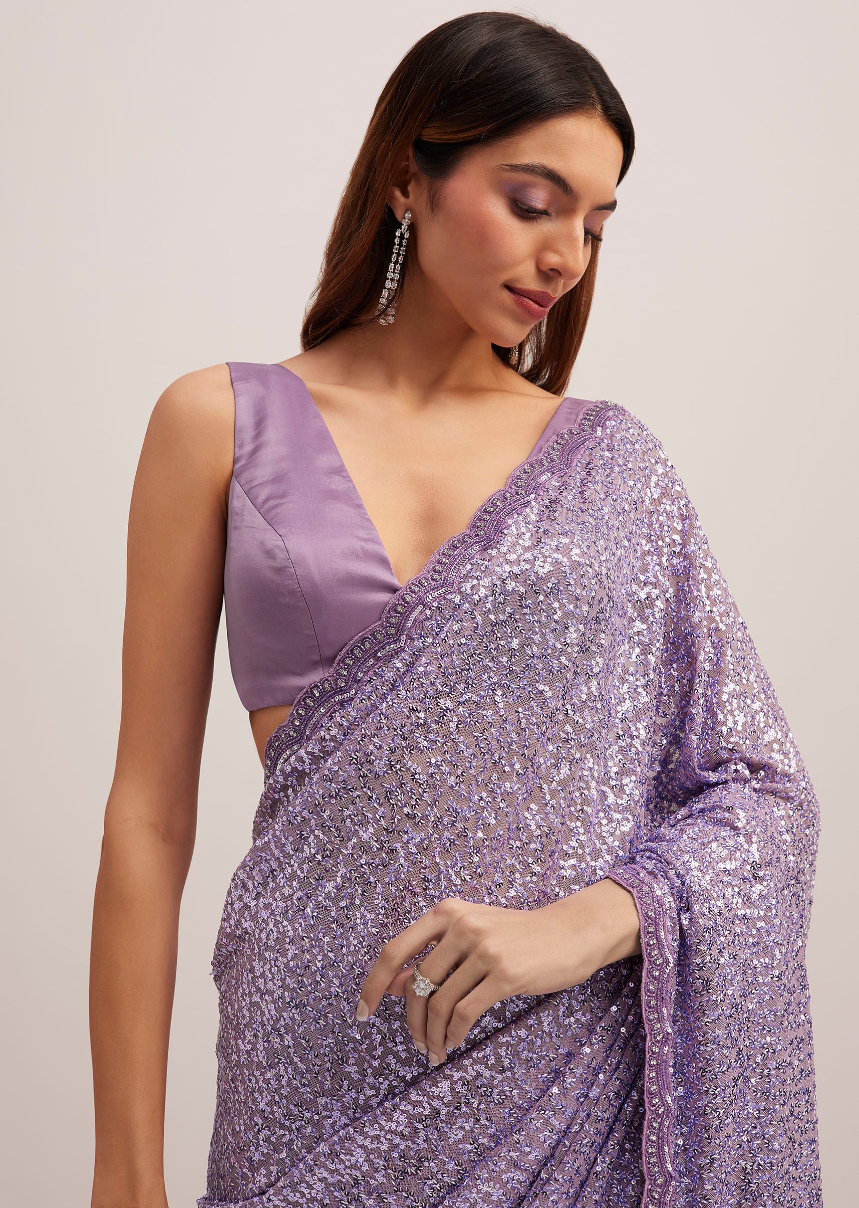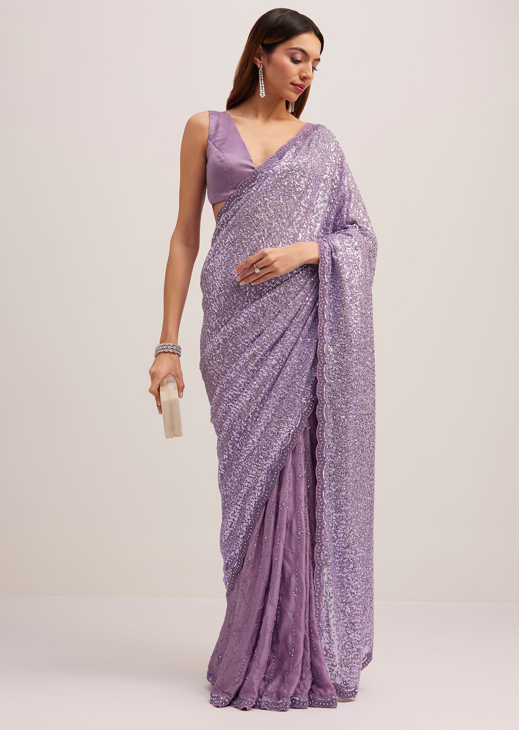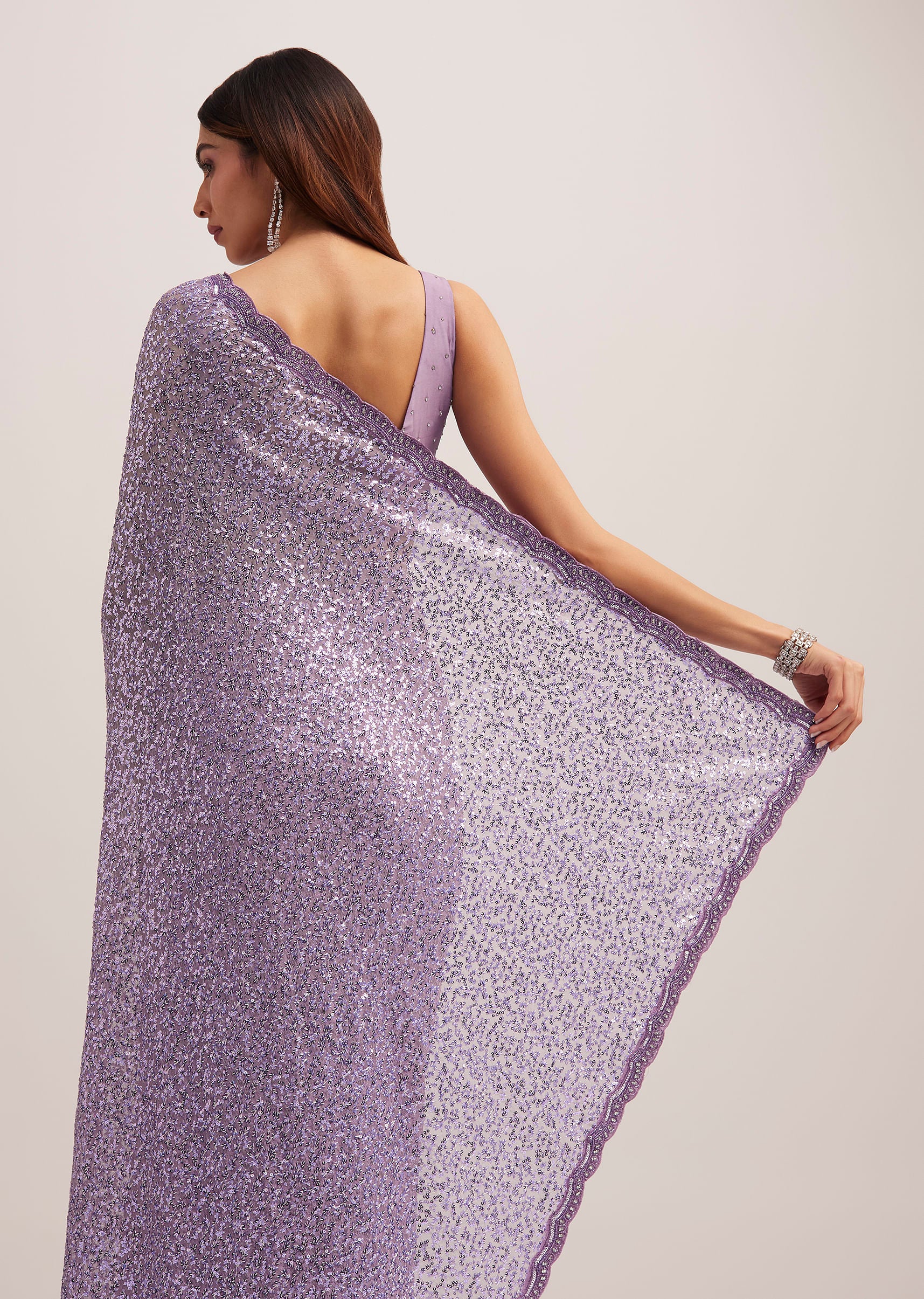 Turn heads with this lavender half n half sequins embroidered saree, designed to add sparkle and elegance to your festive wardrobe. The intricate sequins embroidery creates a captivating shimmer, making it a stunning choice for receptions and cocktail parties. The soft drape ensures effortless styling while maintaining a graceful silhouette. Awarded as the Most Trusted Brand, we're delivering styles you love, just as promised.