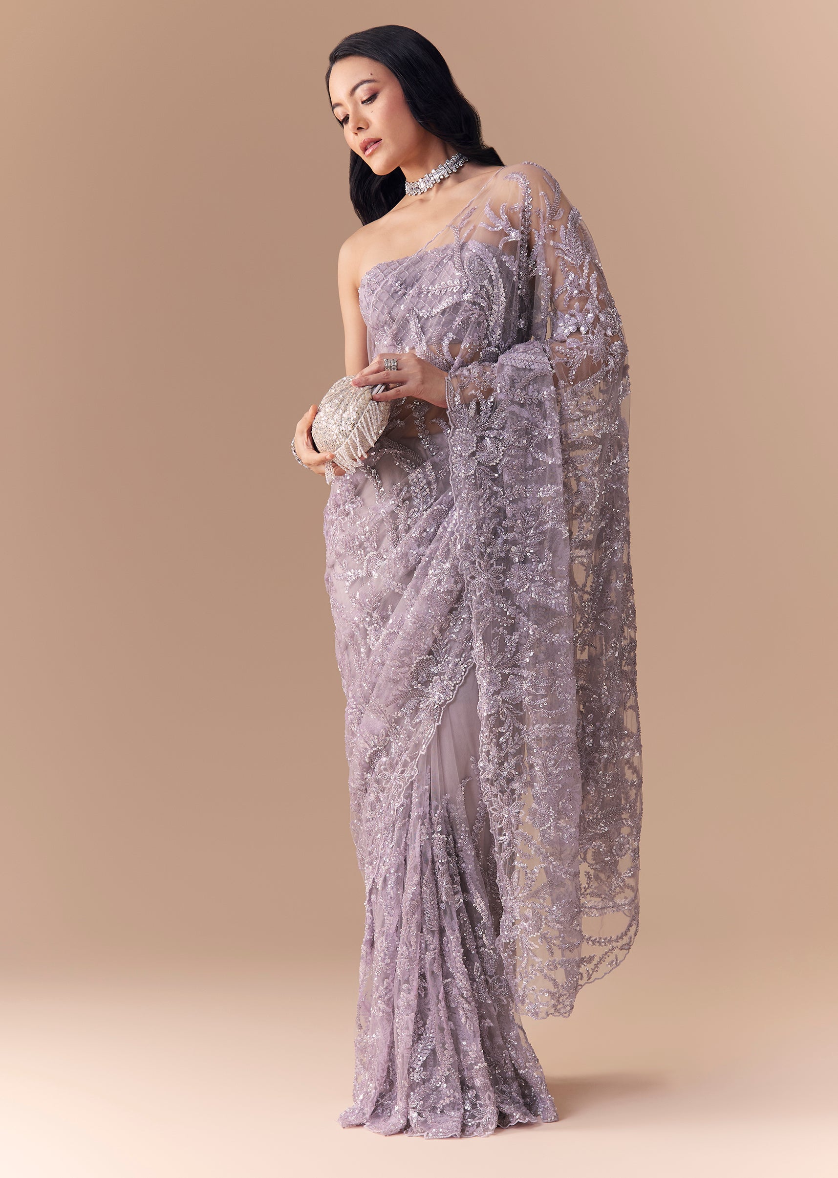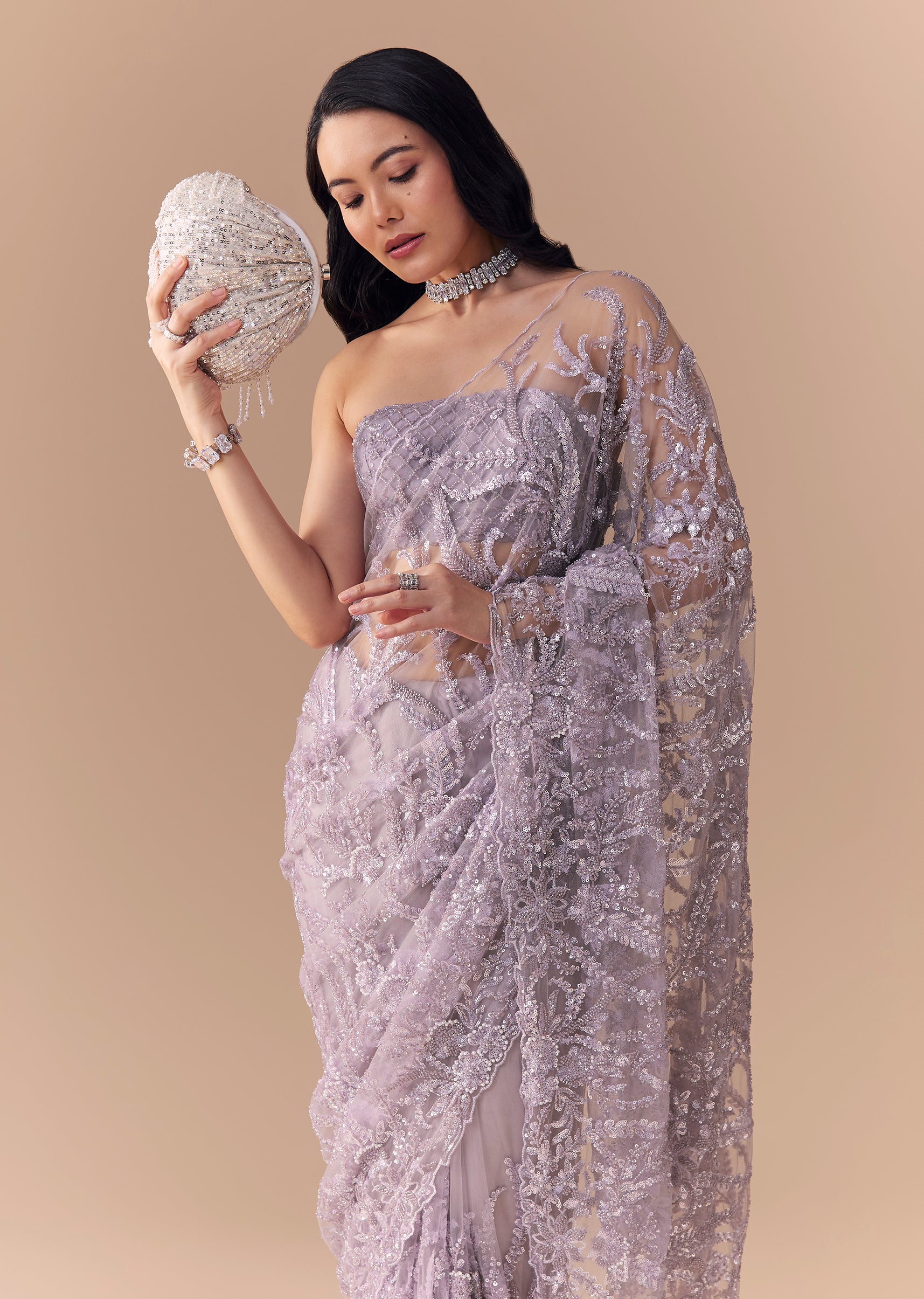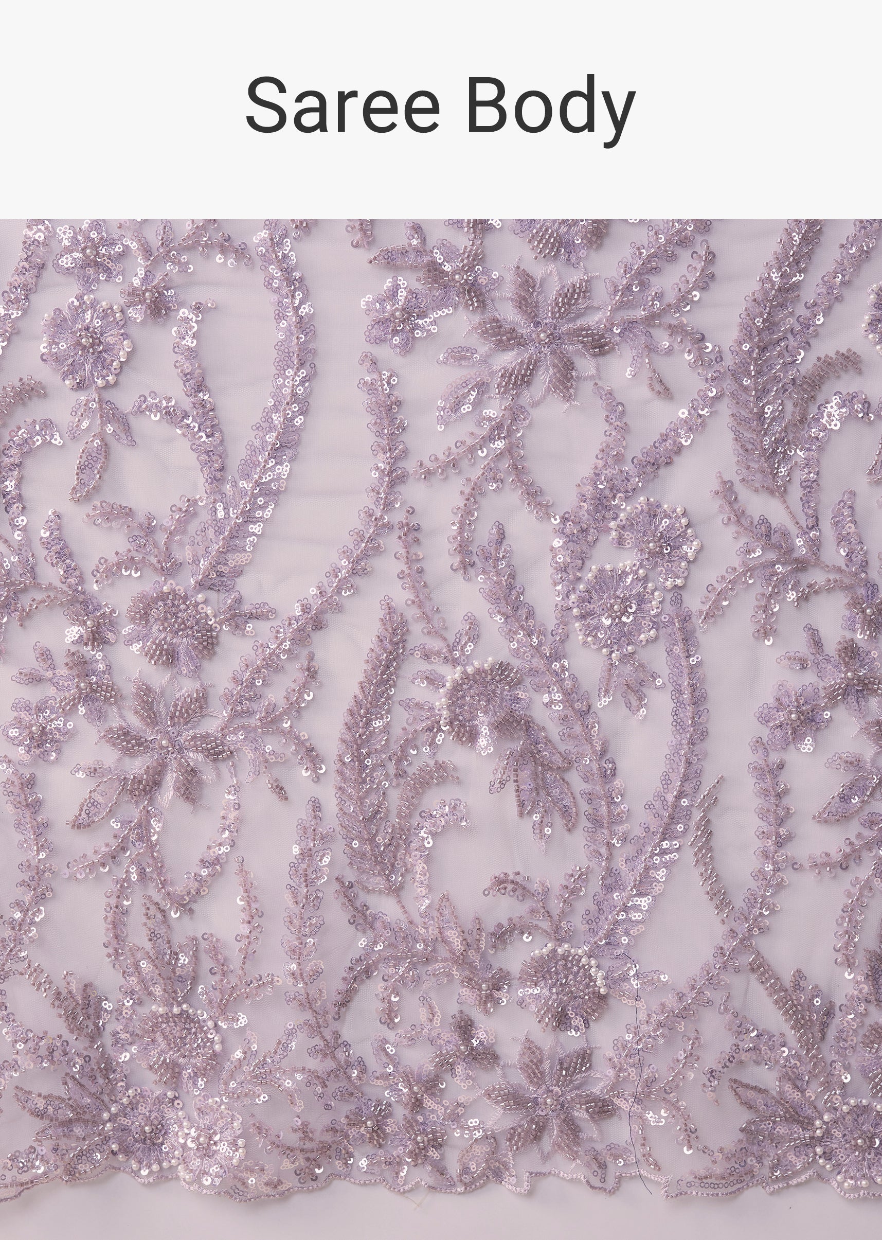 Lavender Net Floral Work Saree with Unstitched Blouse