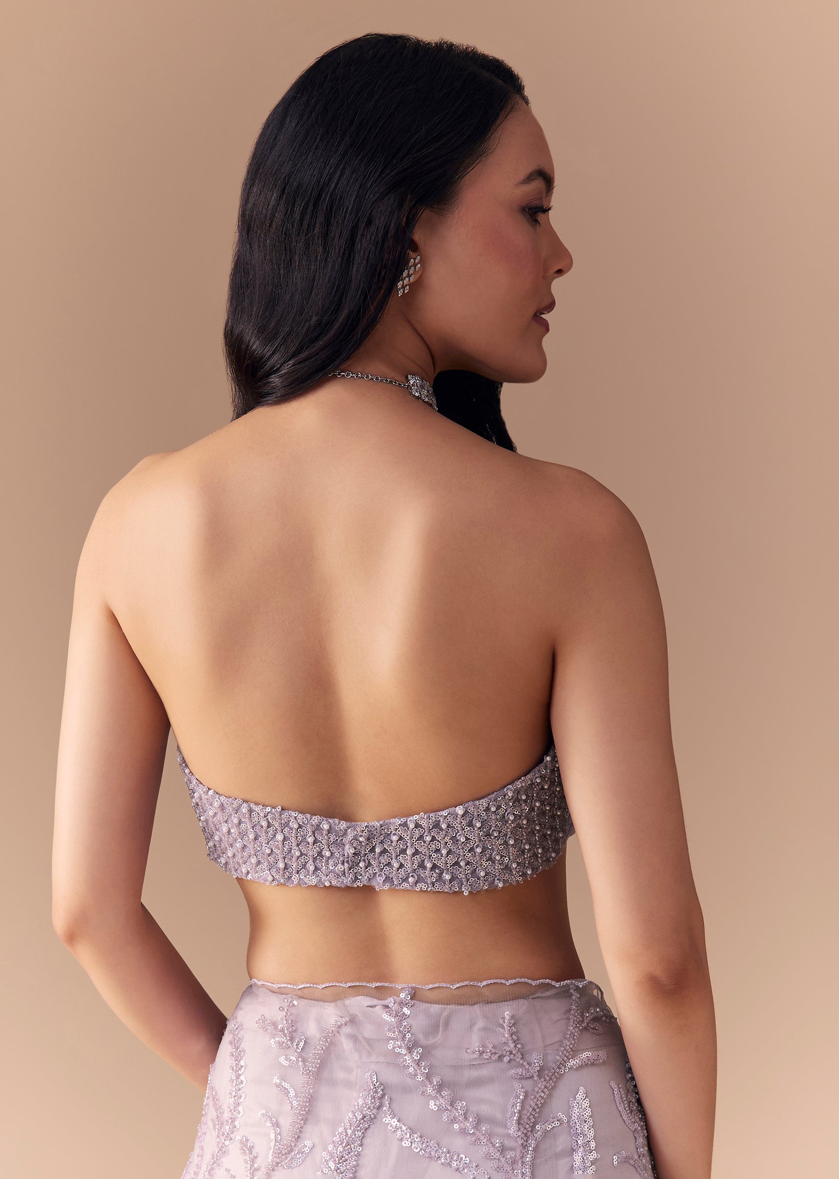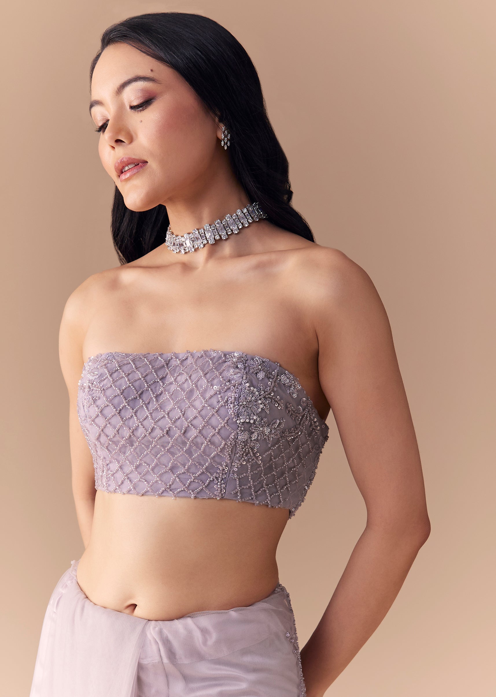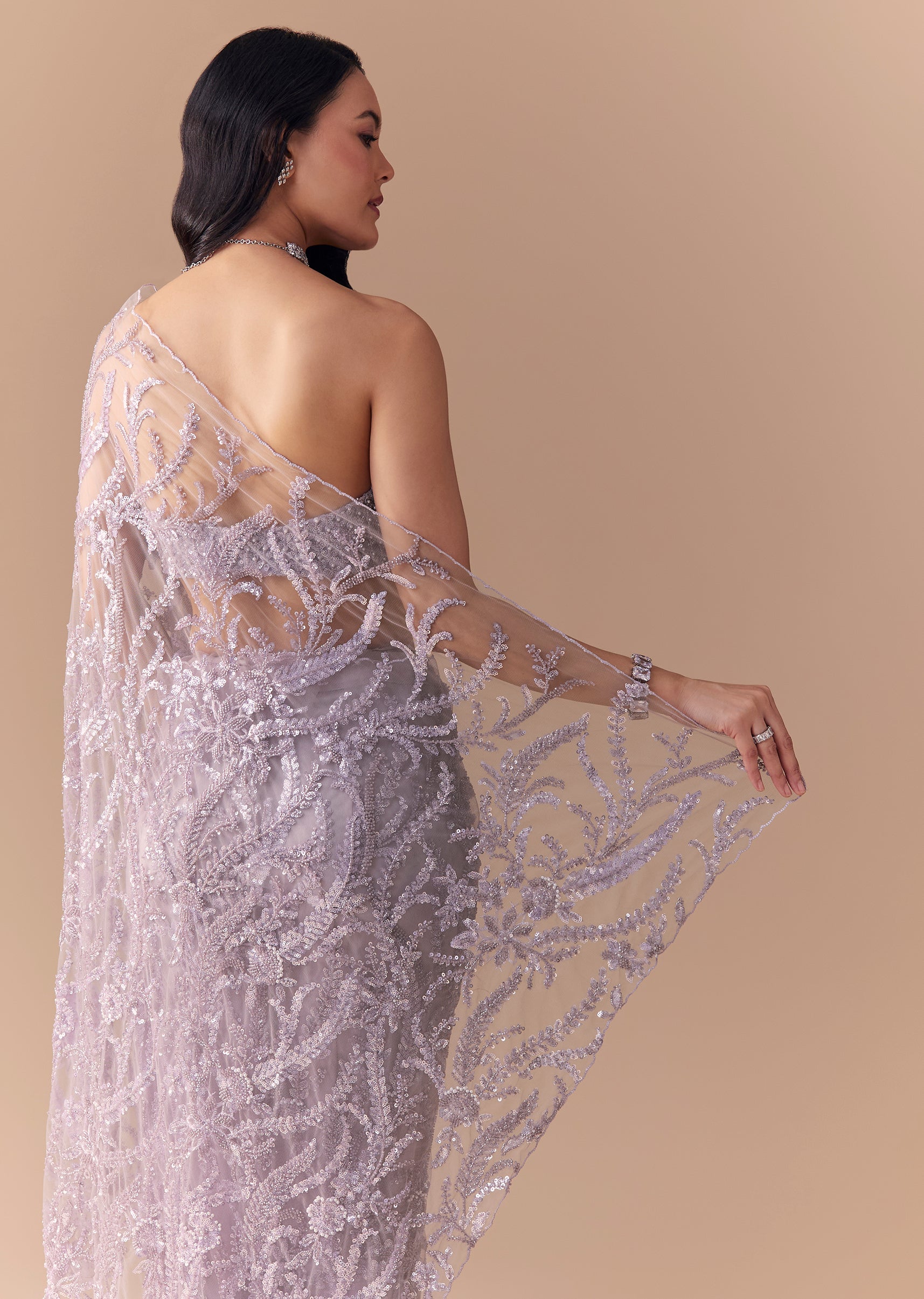Lavender Net Floral Work Saree with Unstitched Blouse