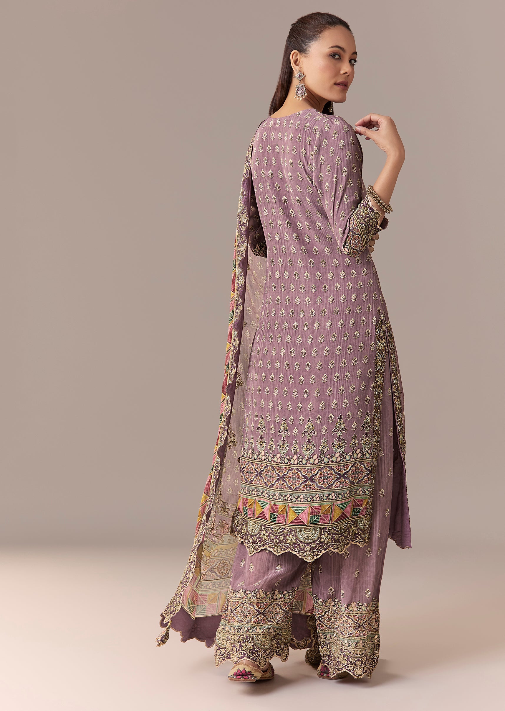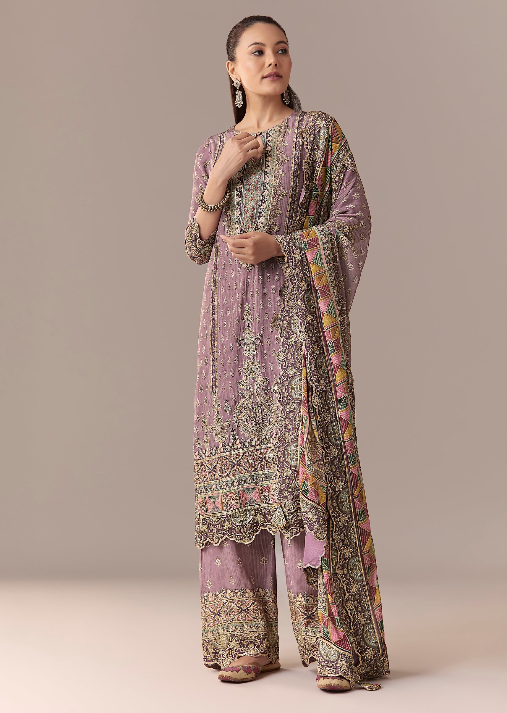 Lavender Printed Zari Kurta Set With Pant And Dupatta