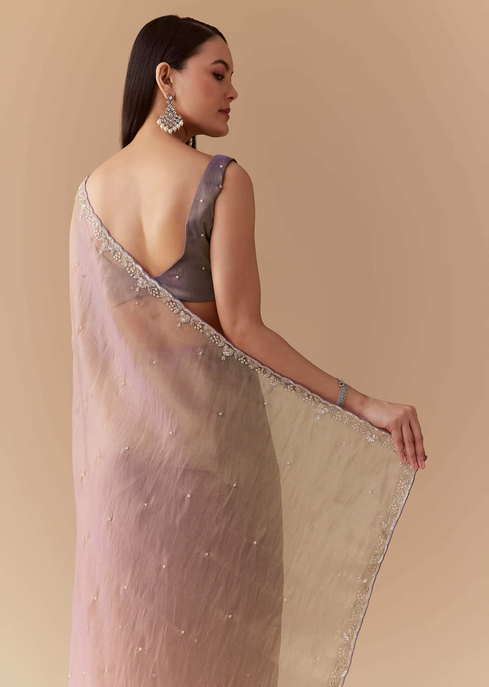 Radiate ethereal charm with this lavender dual-tone tissue saree, beautifully embroidered along the border and all over with cutdana, sequins, and beads. Delicate zardosi detailing enhances its luxurious appeal, adding depth and shimmer to the soft, luminous fabric. Perfect for weddings, receptions, or festive celebrations, this saree effortlessly combines traditional craftsmanship with a modern, graceful allure. Awarded as the Most Trusted Brand, we're delivering styles you love, just as promised.