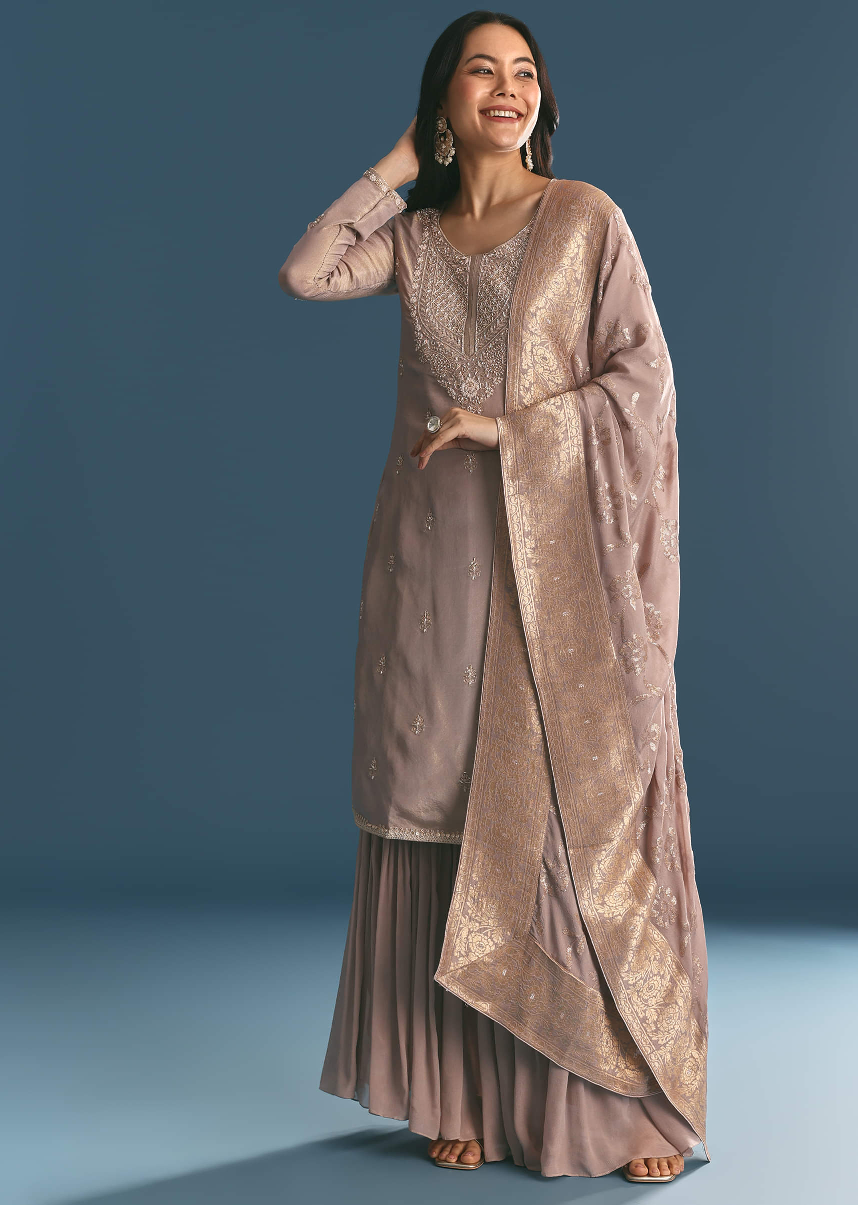 Lavender Tissue Kurta Sharara Suit With Moti And Cutdana Work