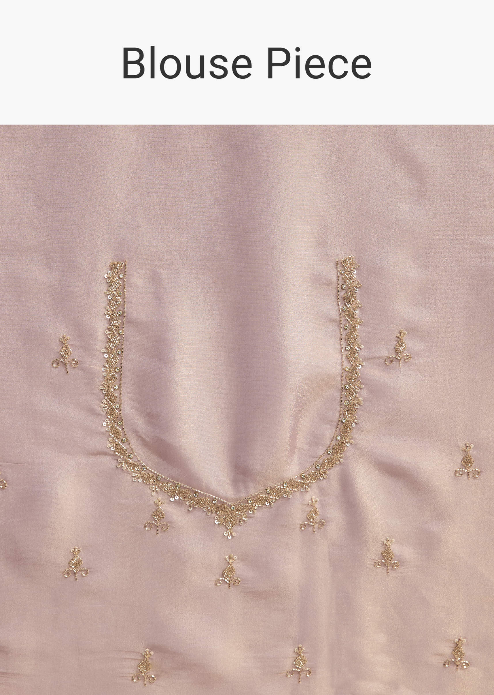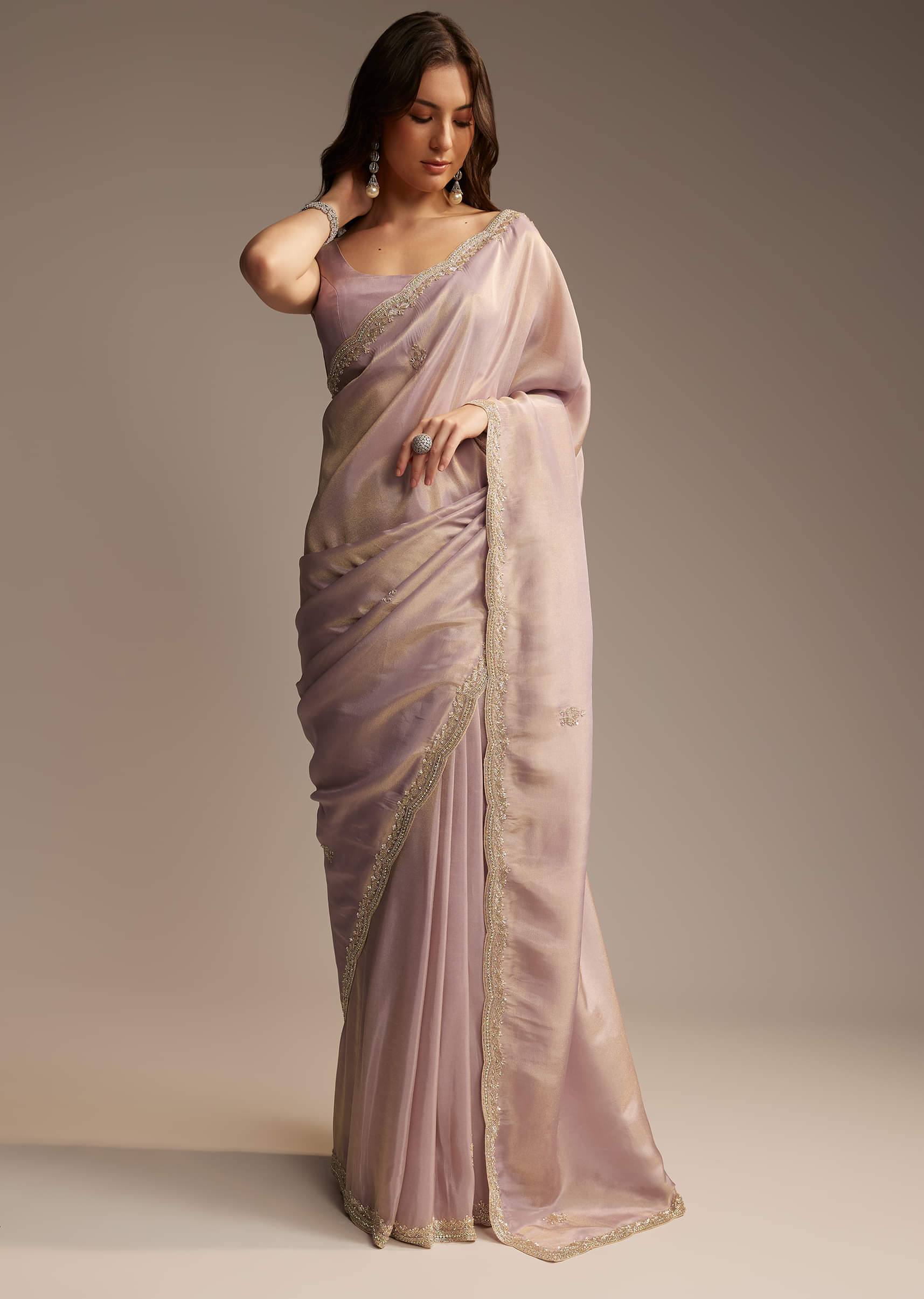 This lavender tissue saree brings a soft glimmer that feels just right for a modern sangeet or an intimate reception. With scalloped edges, scattered butti, and embroidery in cutdana, sequins, and beads, it’s light, fluid, and designed to catch the music and the mood. It comes with matching blouse fabric to complete the look. Awarded as the Most Trusted Brand, we're delivering styles you love, just as promised.