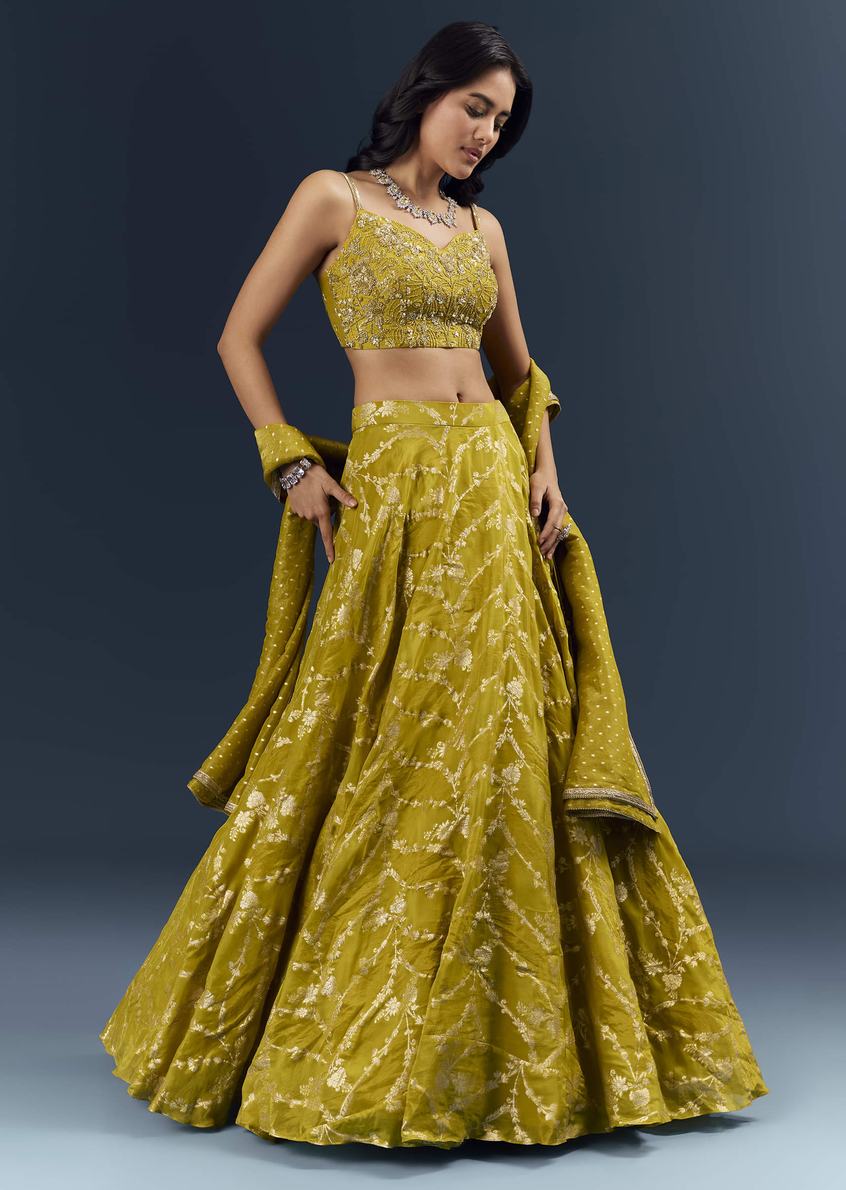 For a dressed look with character, this lemon yellow banarasi silk bridesmaid lehenga leans on artisanal detailing over a classic weave. Intricate hand work in sequins, beads, and lace traces... More Product Details