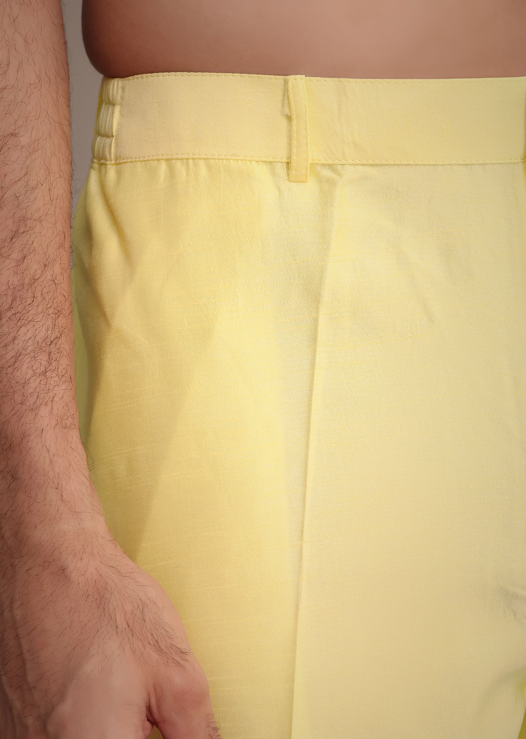 -  The lemon yellow silk thread work kurta jacket set exudes vibrant elegance with intricate silk thread embroidery enhancing the rich yellow fabric.