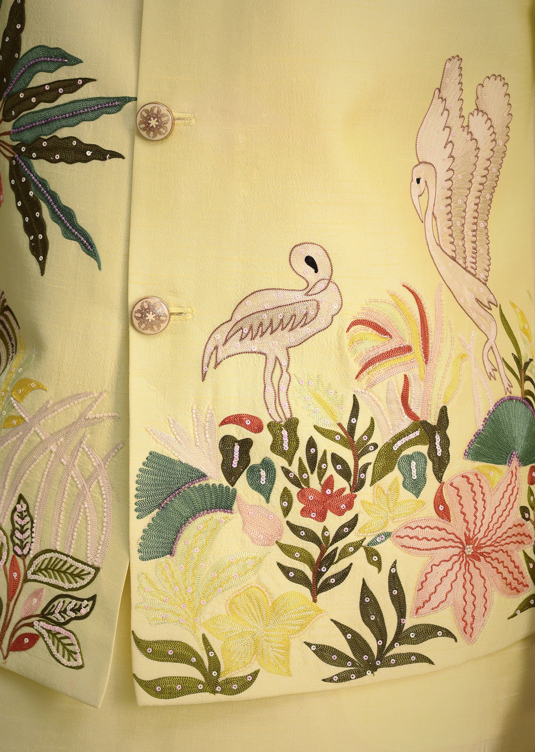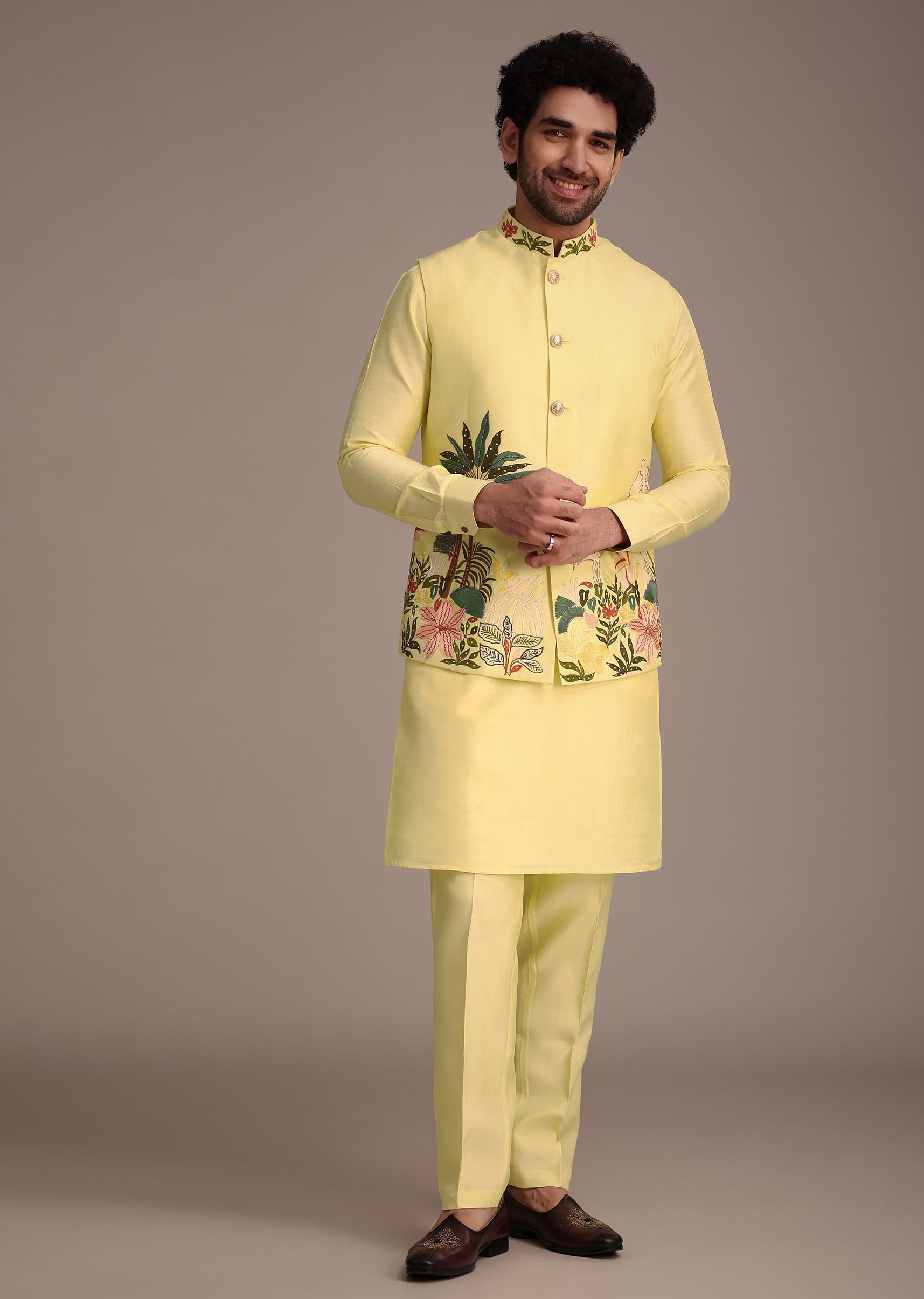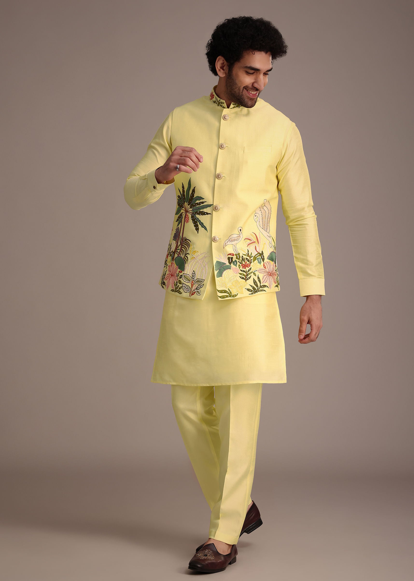 Lemon Yellow Silk Thread Work Kurta Jacket Set