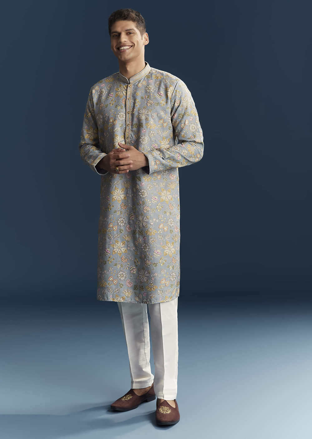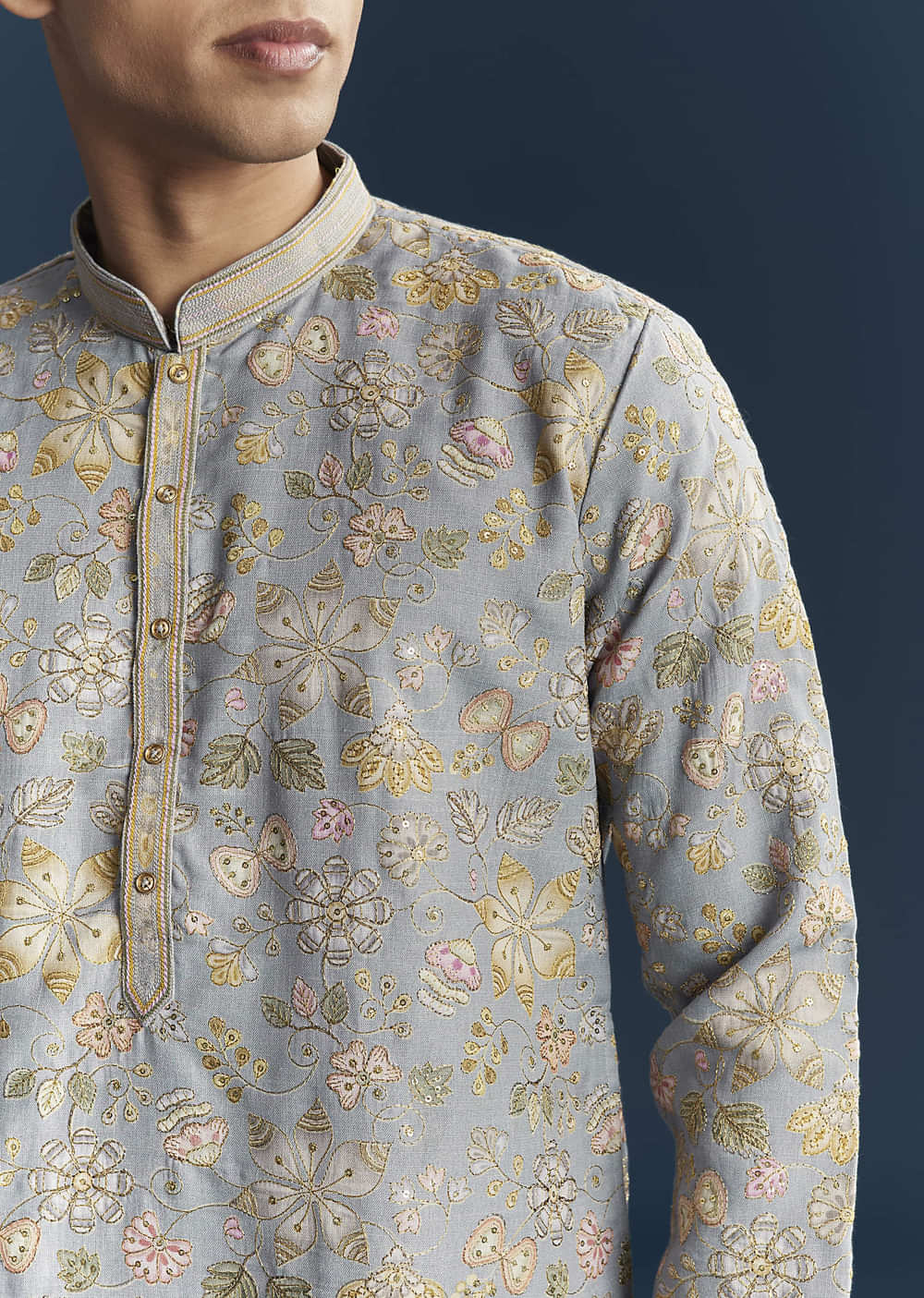 Pastels read luxe when this light blue cotton silk men’s kurta set shows floral embroidery in soft pink, gold, and white. Metallic resham threadwork adds a gentle sheen that glows... More Product Details