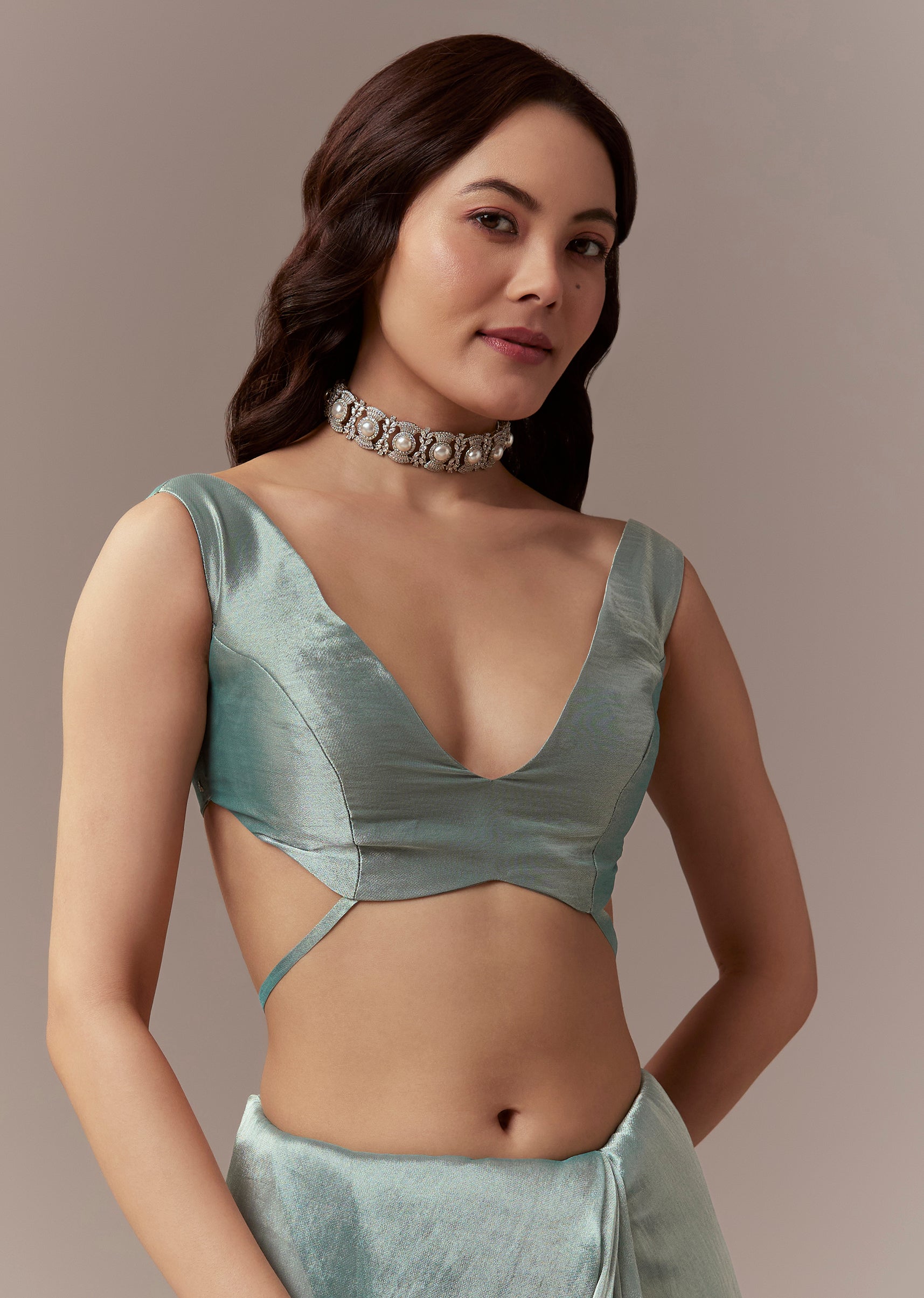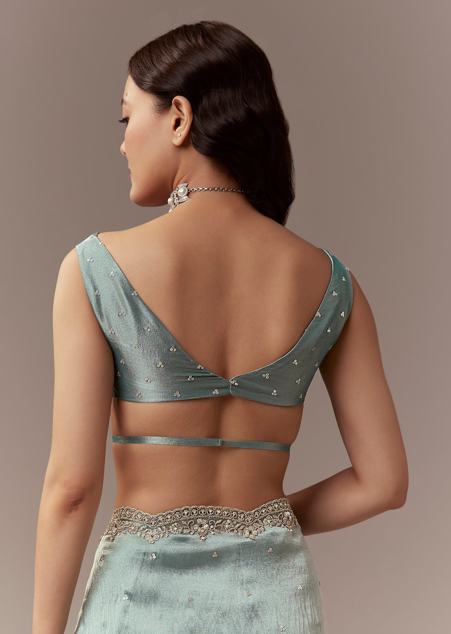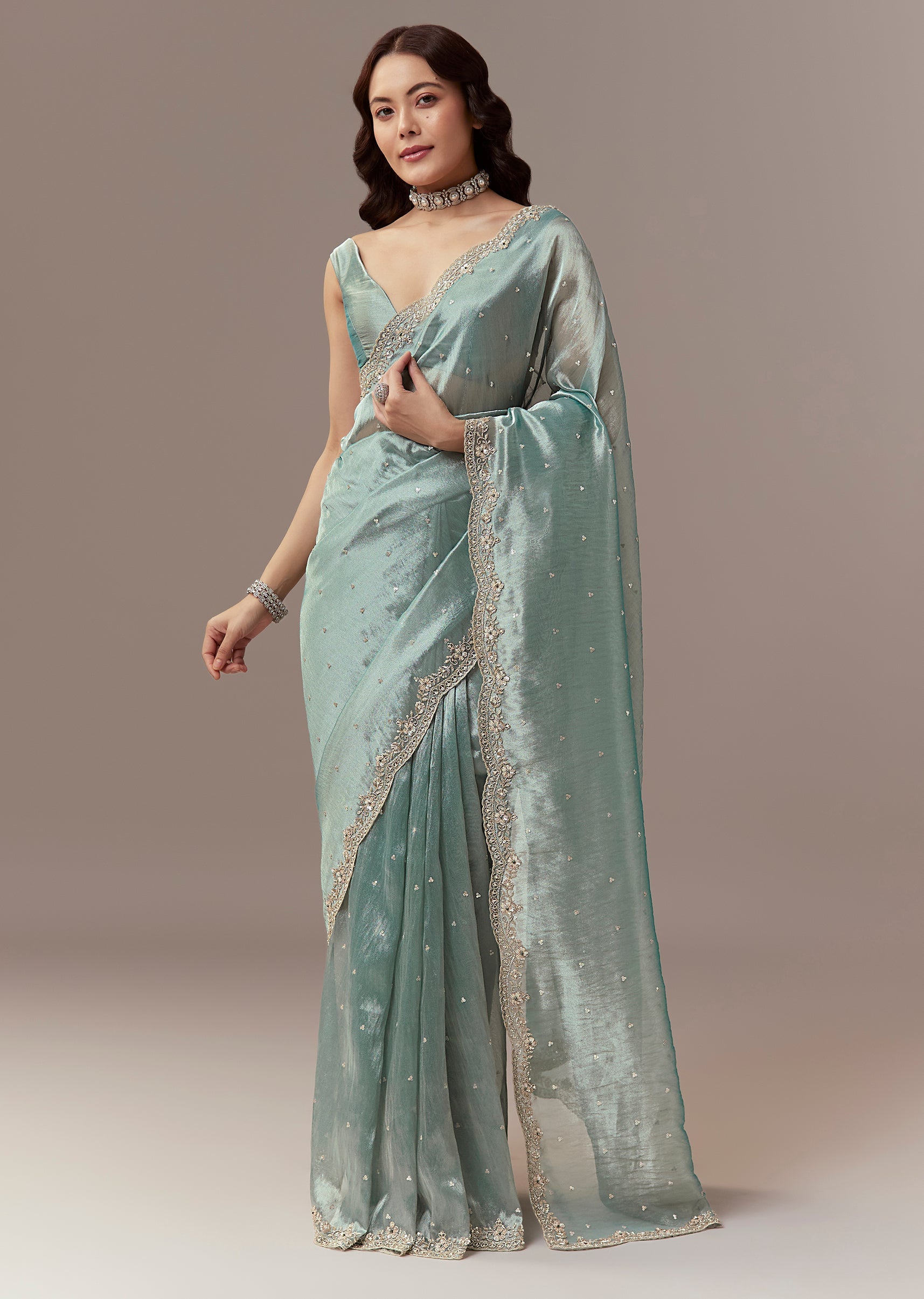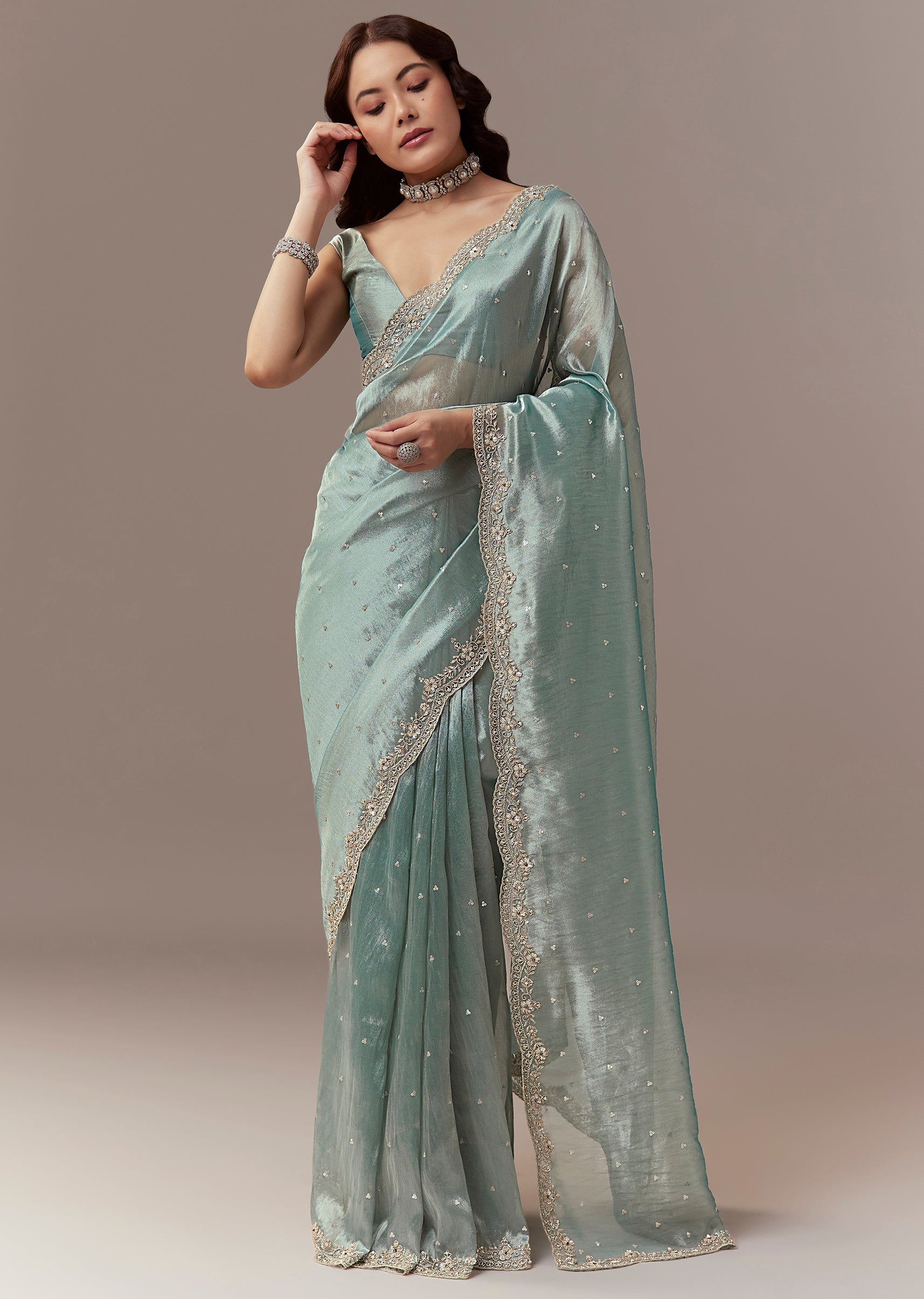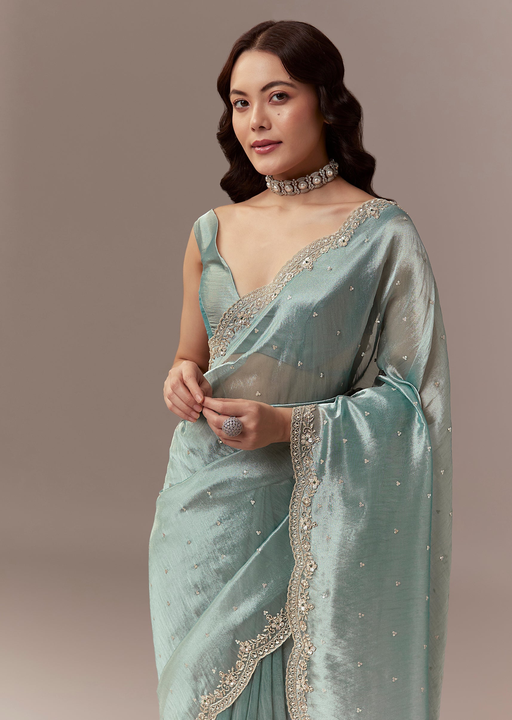 Light Blue Tissue Silk Saree With Cutdana Beads And Sequin Embroidery