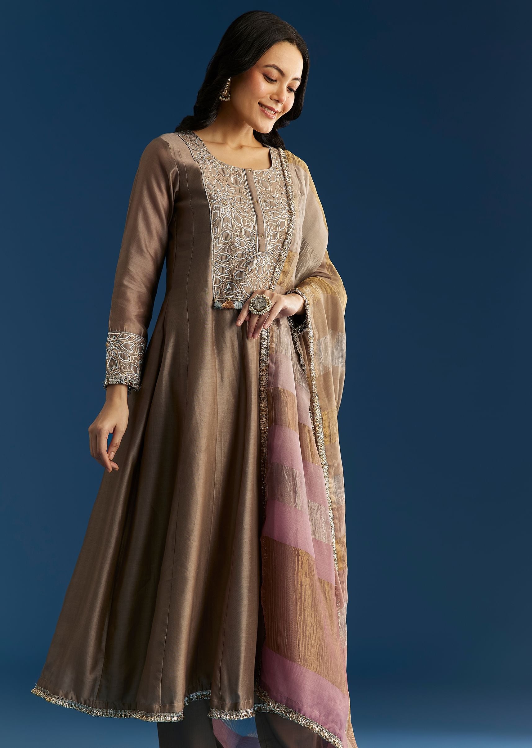 Light Brown Chanderi Anarkali With Gotta Lace And Crush Tissue Dupatta