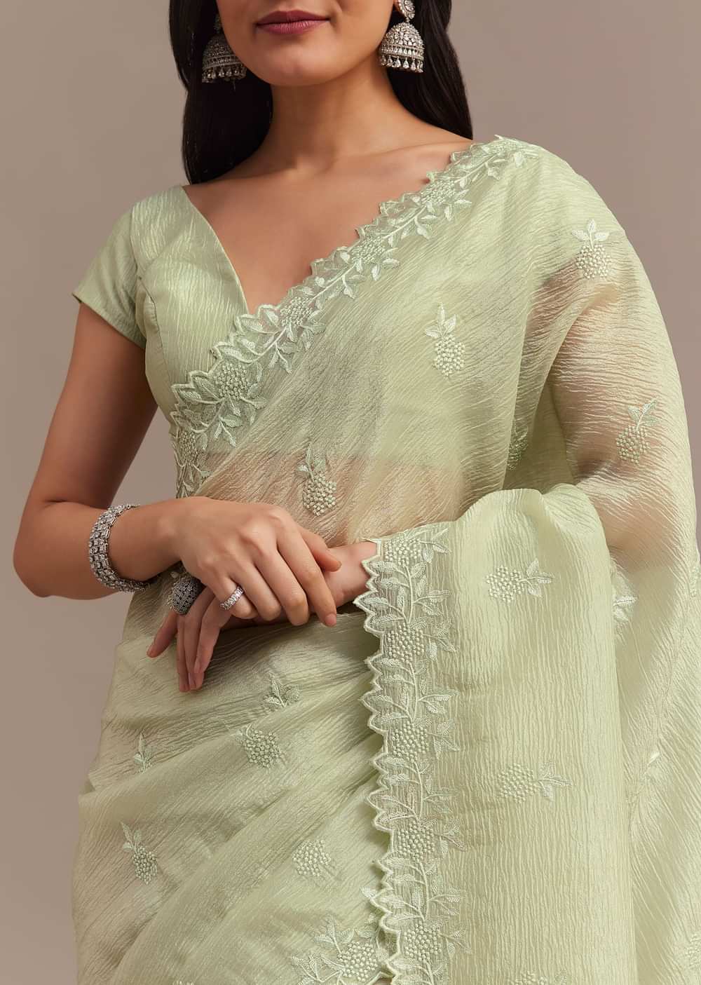 A blend of grace and fine artistry this light green crushed tissue saree features an exquisite resham thread embroidered cutwork border. The delicate embroidery accentuates the sheer texture of the fabric creating an ethereal and airy appeal. The soft pastel shade enhances its timeless charm making it an elegant choice for day celebrations and intimate gatherings. A true statement of refined luxury.Awarded as the Most Trusted Brand we're delivering styles you love just as promised.