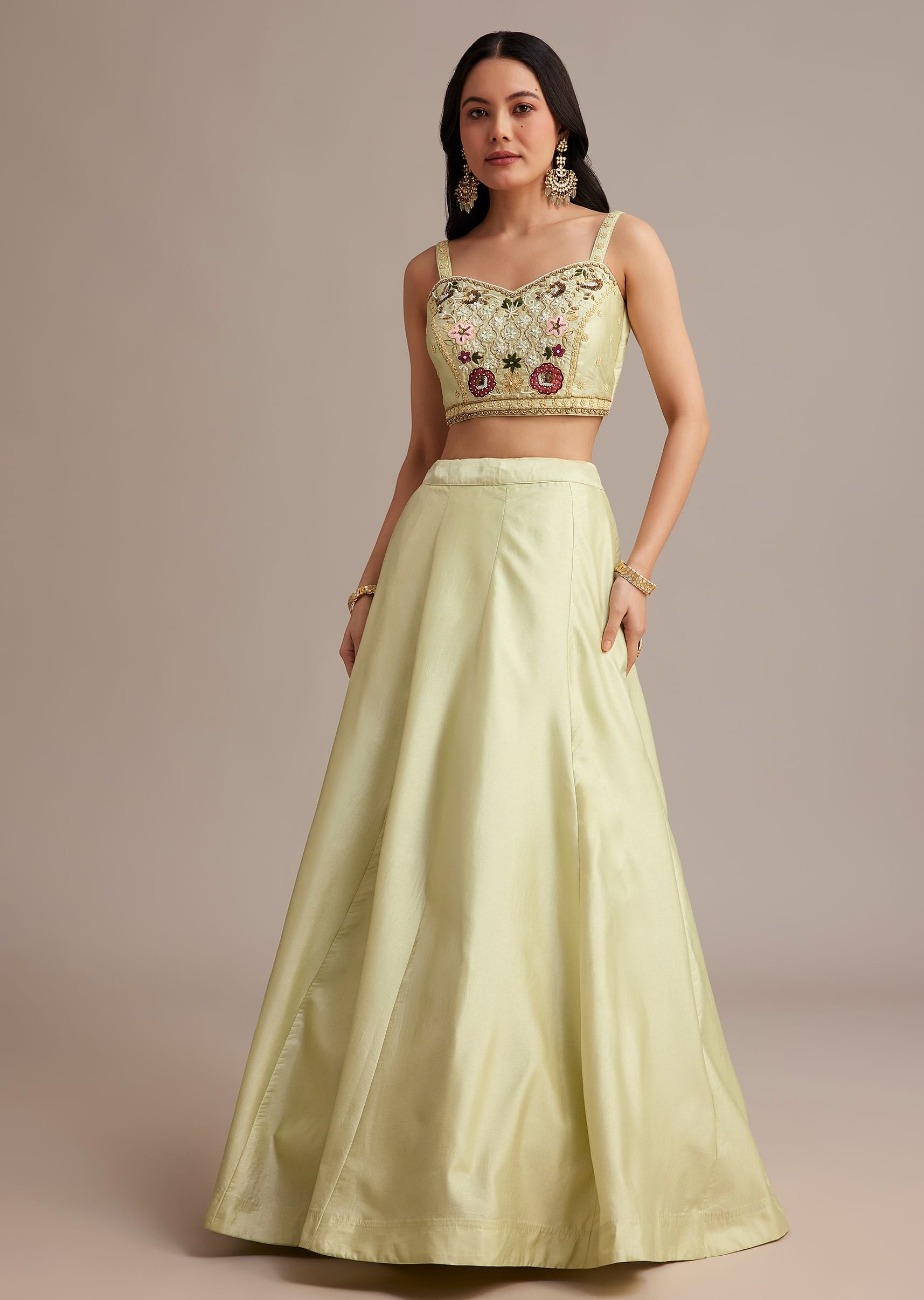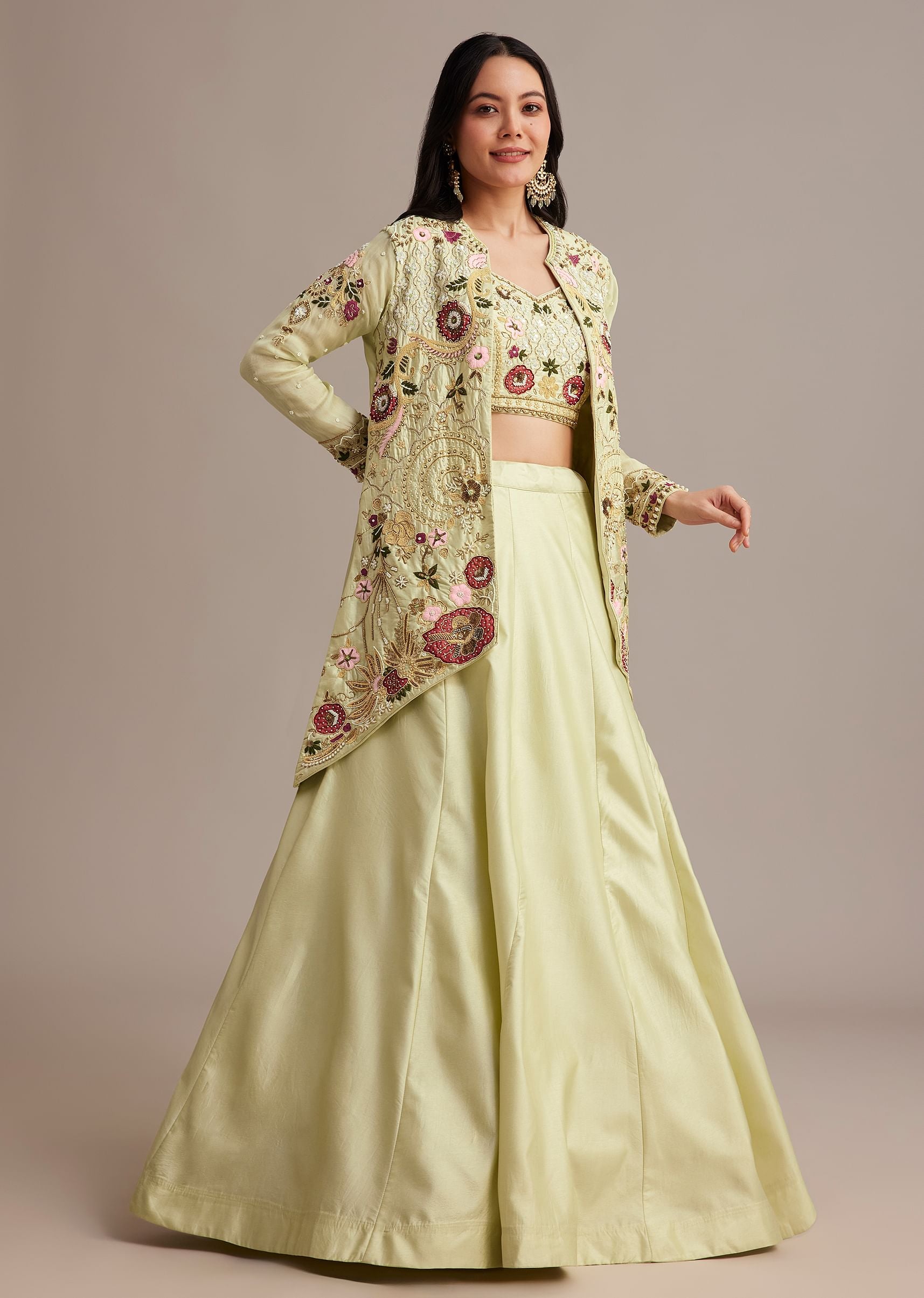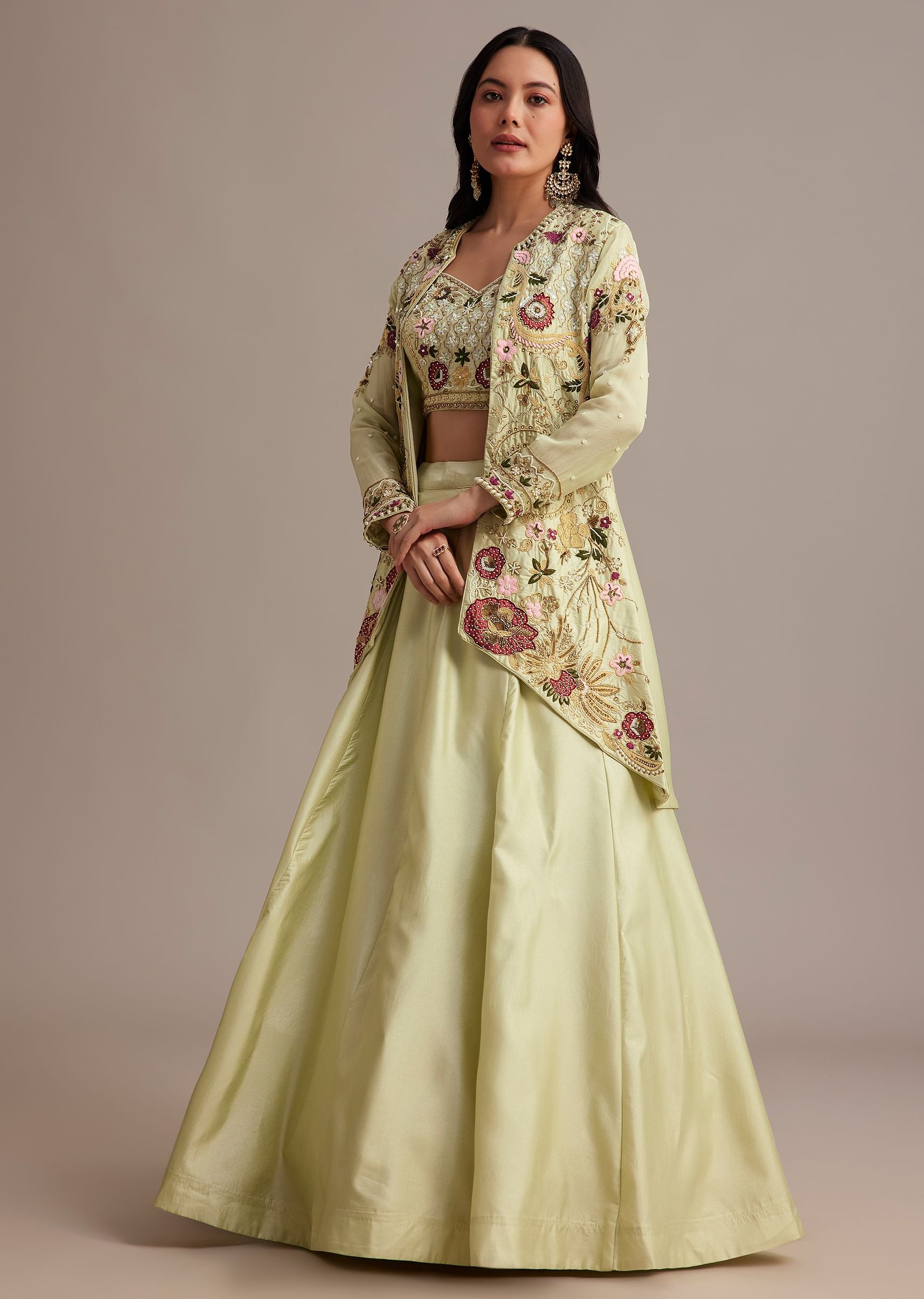 This Light Green Silk Lehenga Set Features A Beautifully Embroidered Crop Top And A Statement Openfront Jacket Adorned With Intricate Thread Sequins And Moti Work. The Structured Solid Lehenga Adds A Refined Balance To The Ornate Detailing Creating An Elegant And Modern Silhouette. The Fusion Of Traditional Embroidery With Contemporary Cuts Makes It A Perfect Choice For Mehendi Celebrations.Awarded As The Most Trusted Brand We'Re Delivering Styles You Love Just As Promised.