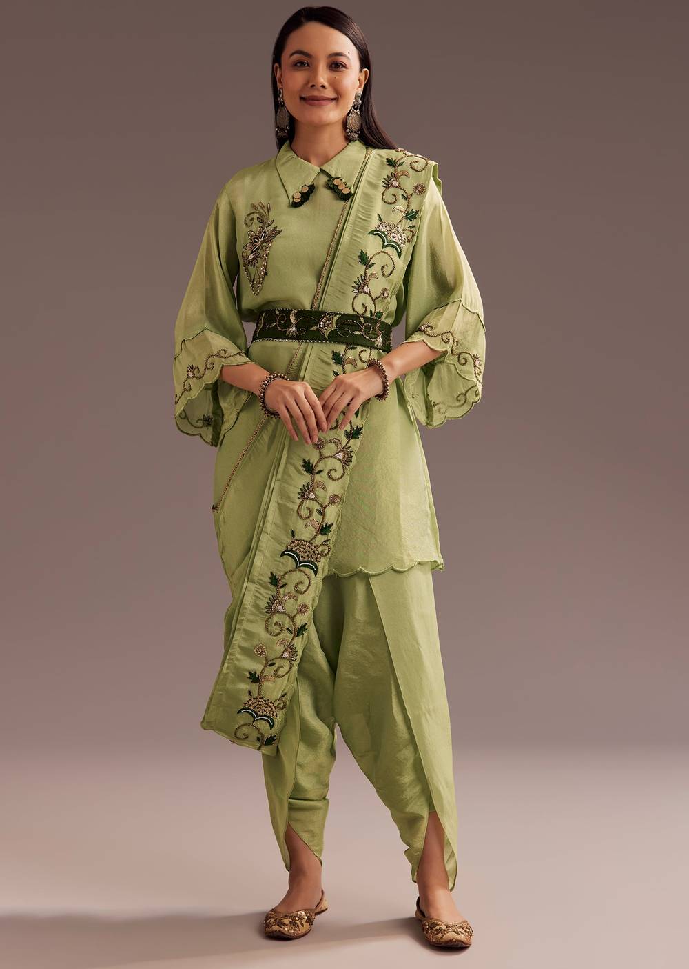 Light Green Zardosi Kurta With Embroidered Dupatta Belt