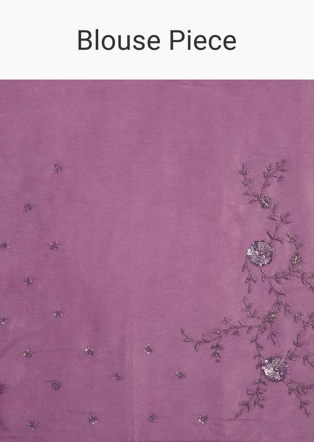 A light lavender tissue saree featuring floral embroidery with cutdana and sequins, scallop border, perfect for elegant brunch occasions. It feels like wearing a quiet poem stitched in shimmer and... More Product Details