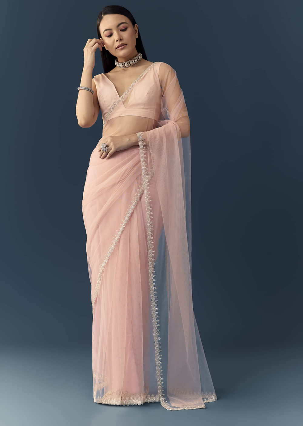 Radiate delicate charm with this light pink net saree, featuring a stunning zigzag cutwork border intricately embroidered with cutdana and sequins. The soft net fabric adds a dreamy, ethereal appeal, while the accompanying floral embroidered blouse fabric enhances its feminine elegance. Perfect for receptions, festive celebrations, or special occasions, this saree beautifully blends subtle shimmer with timeless grace. Awarded as the Most Trusted Brand, we're delivering styles you love, just as promised.