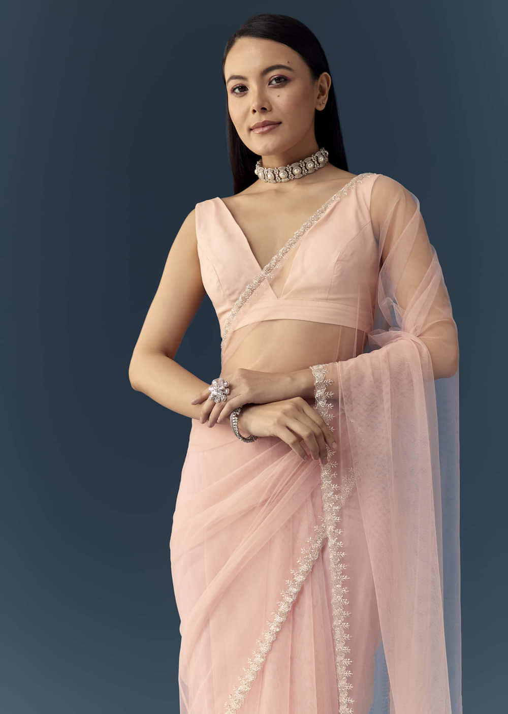 Light Pink Net Saree with Zigzag Cutwork and Unstitched Blouse