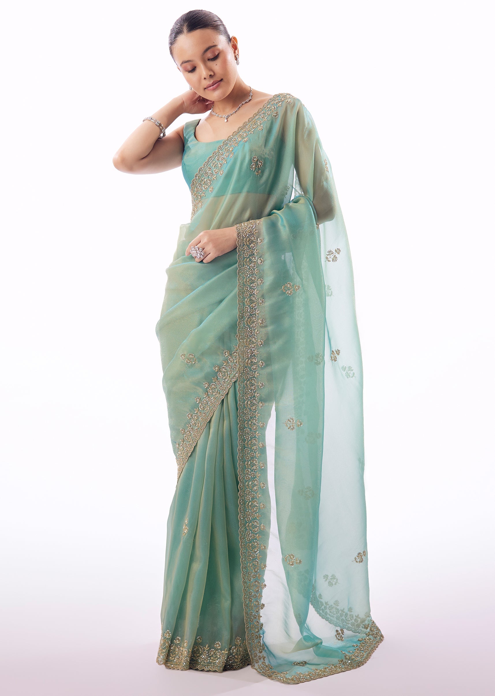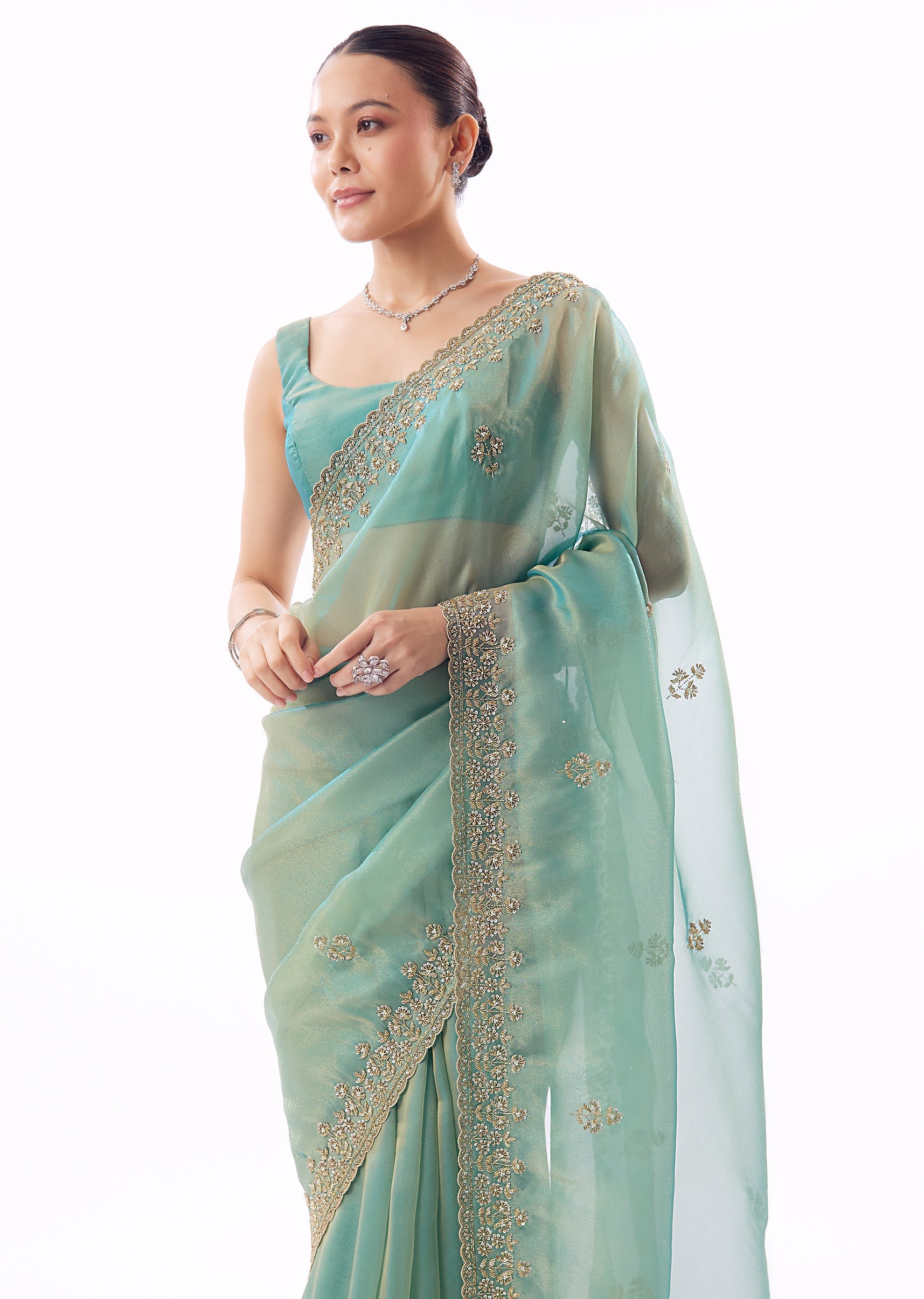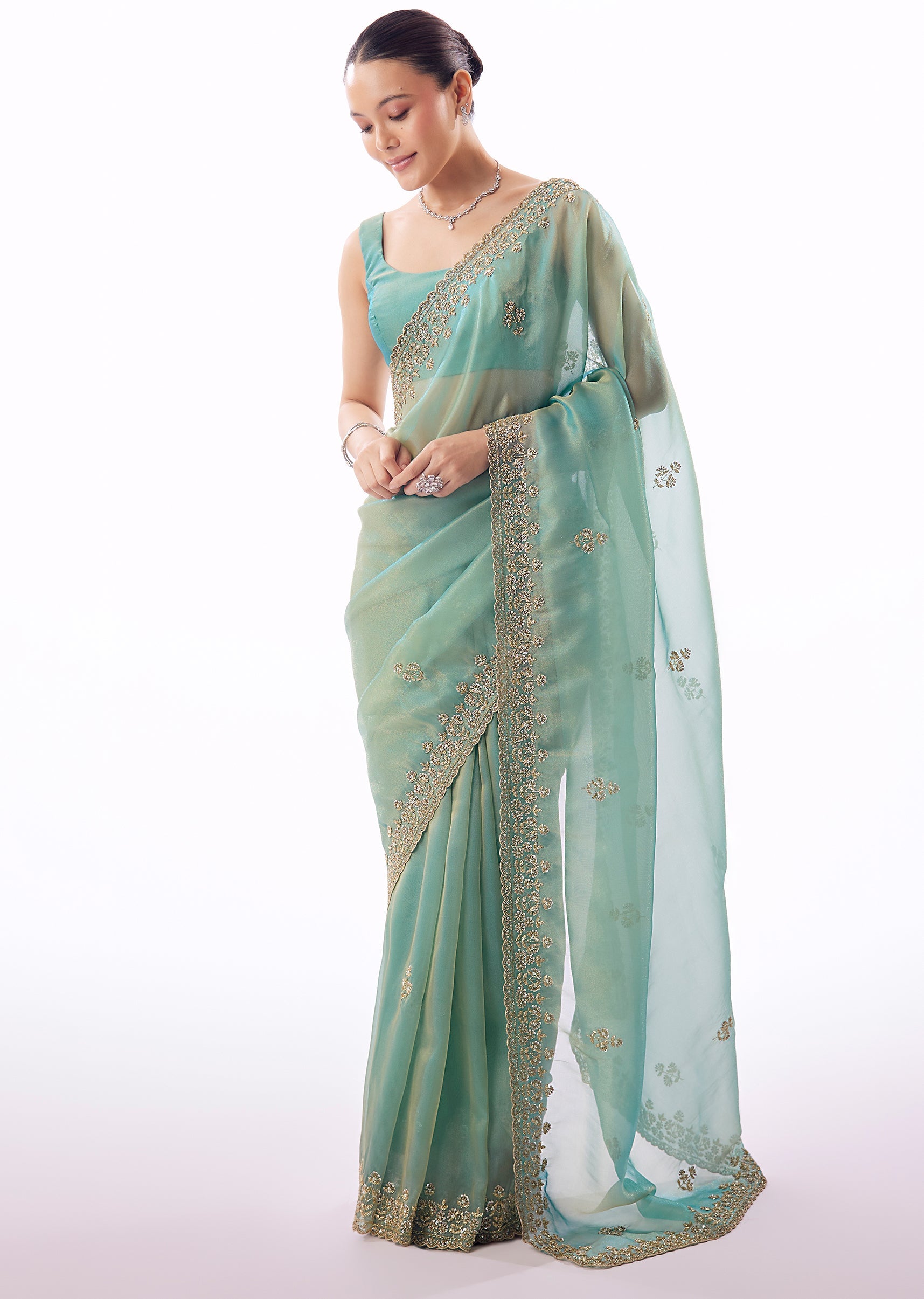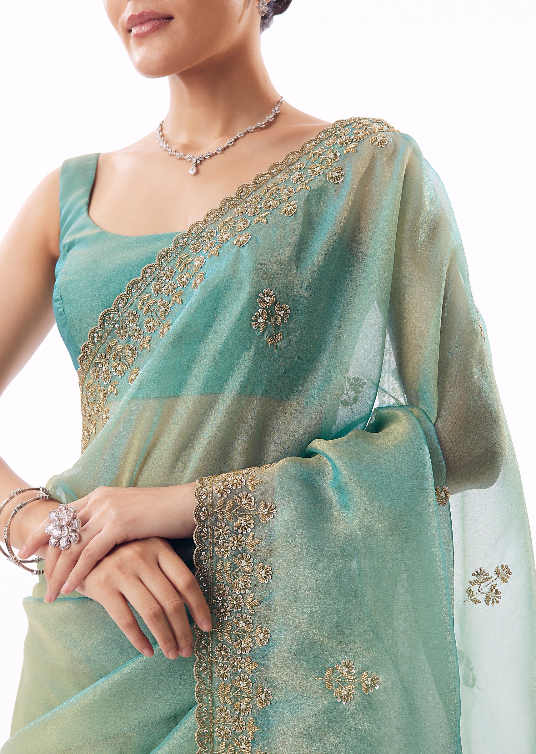 Graceful and luminous, this light turquoise blue tissue saree is perfect for wedding festivities and elegant celebrations. The saree features a soft, shimmering base enhanced by an embroidered border and butti detailing crafted with cutdana, sequins, and beads. The pastel tone offers a fresh, serene appeal while maintaining festive richness. Ideal for mehendi, engagement ceremonies, and evening receptions, this saree balances subtle glamour with timeless elegance. Awarded as the Most Trusted Brand, we're delivering styles you love, just as promised.